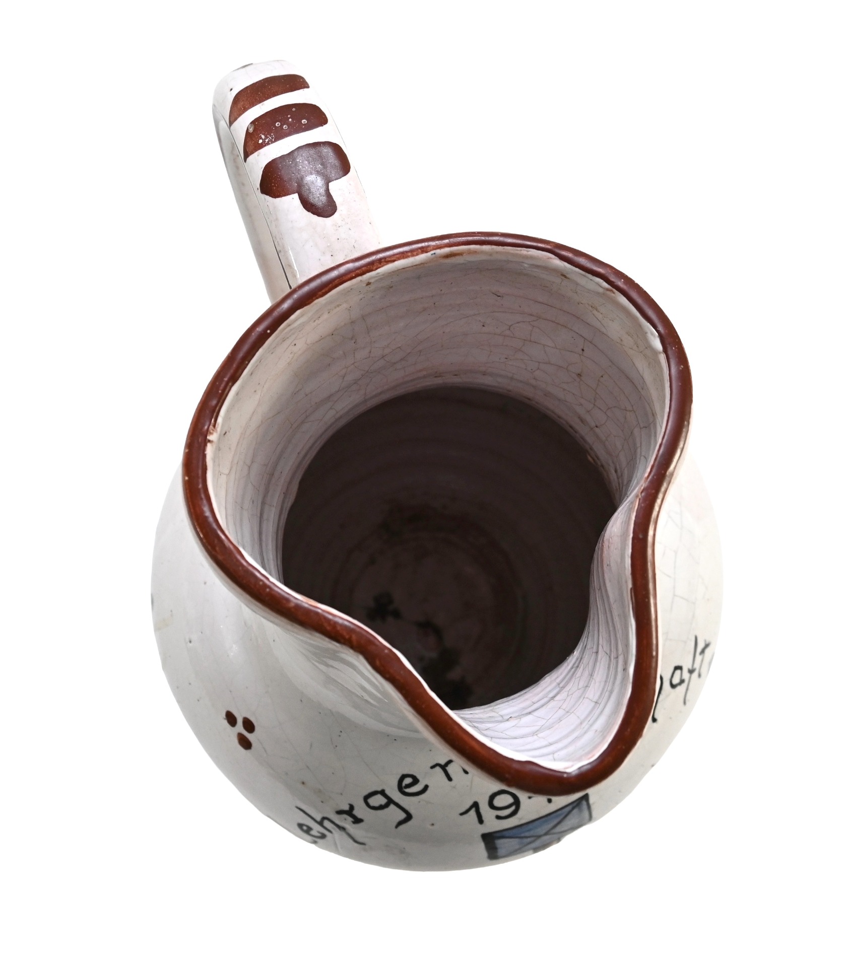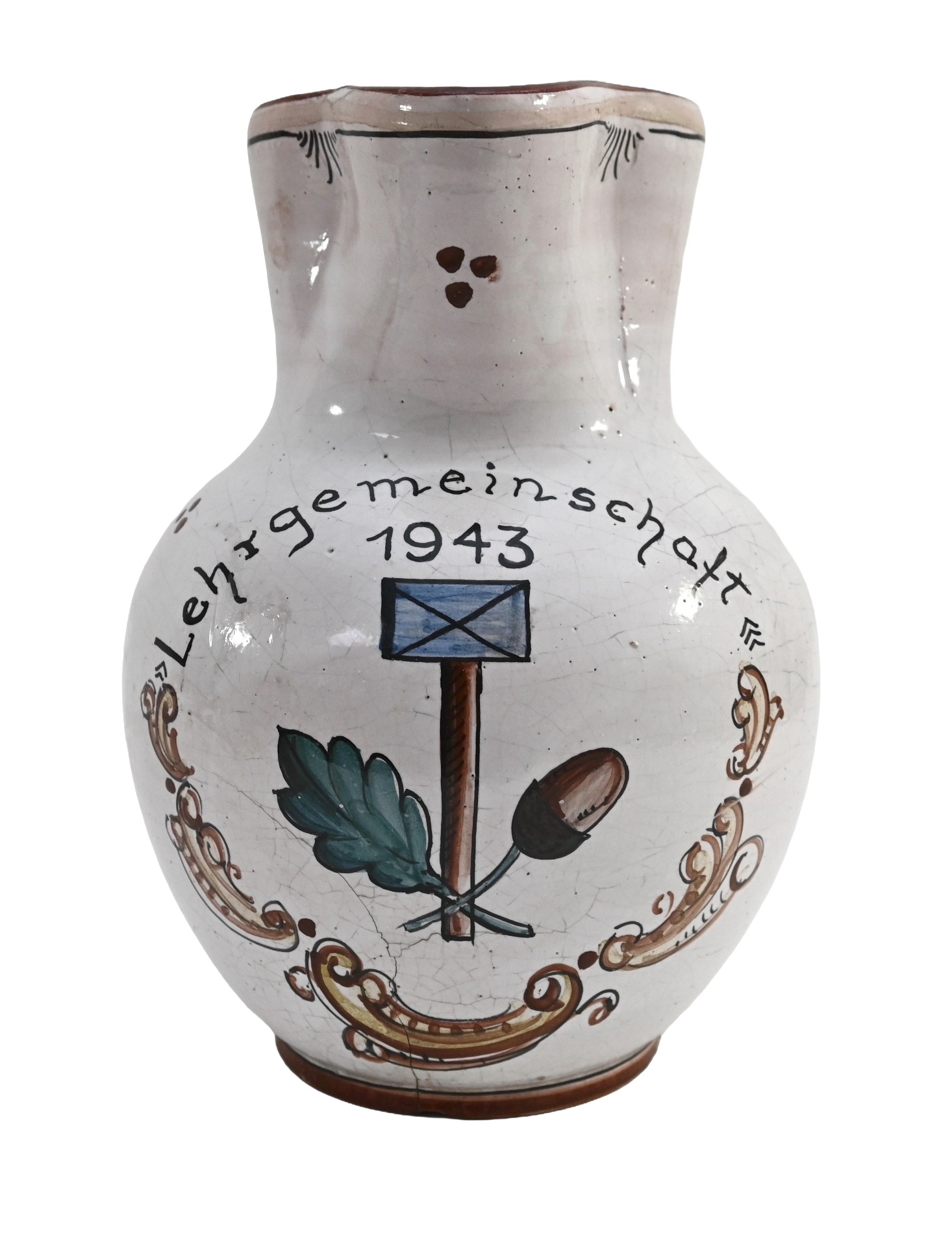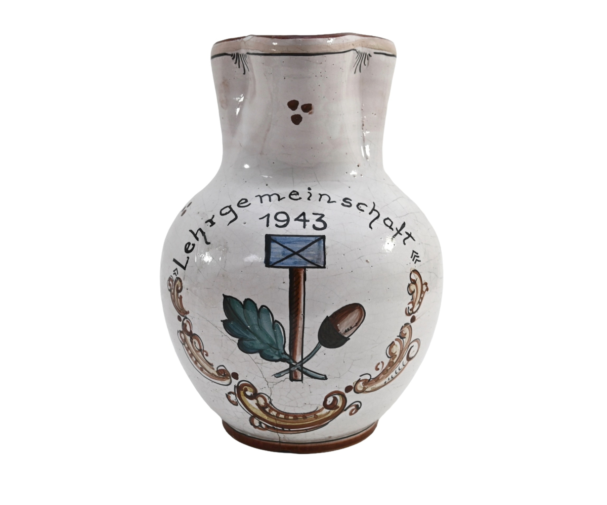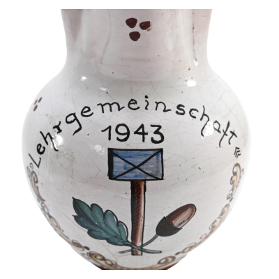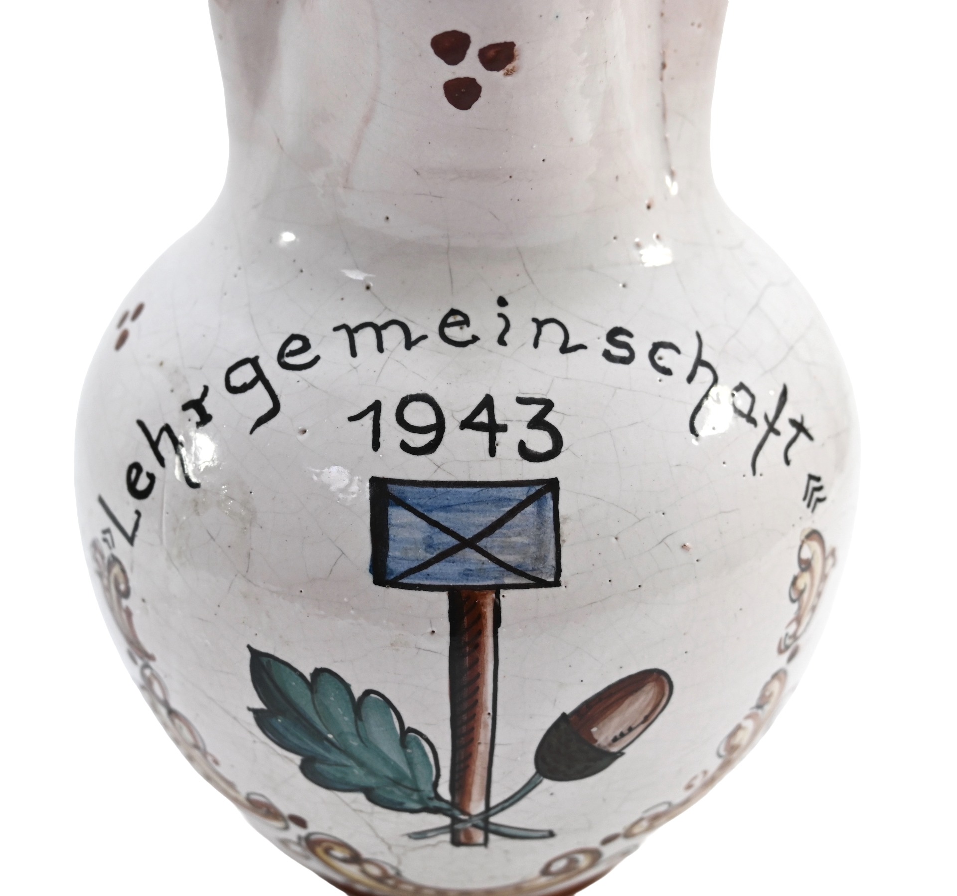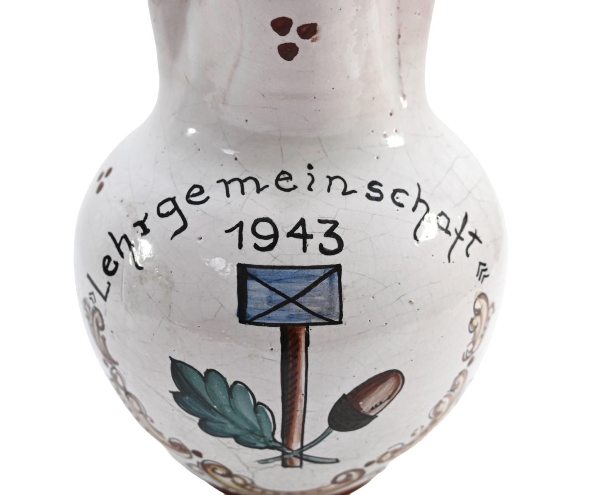 The pitcher is beautifully decorated. There are signs of wear/cracks, but these have been nicely repaired and the piece is very solid! The front is marked ‘Lehrgemeinschaft’ and ‘1943’. The pitcher is approximately 23 cm high.