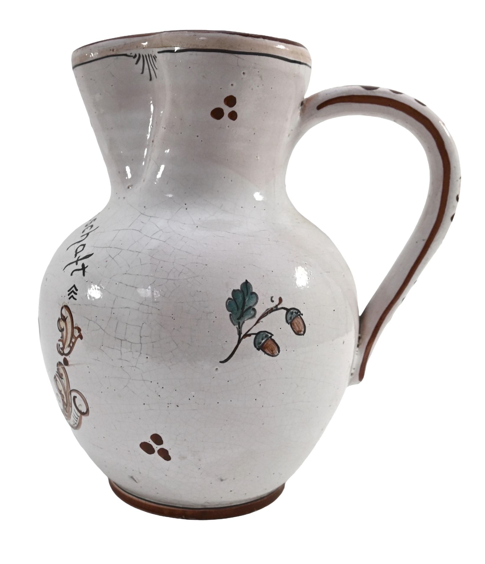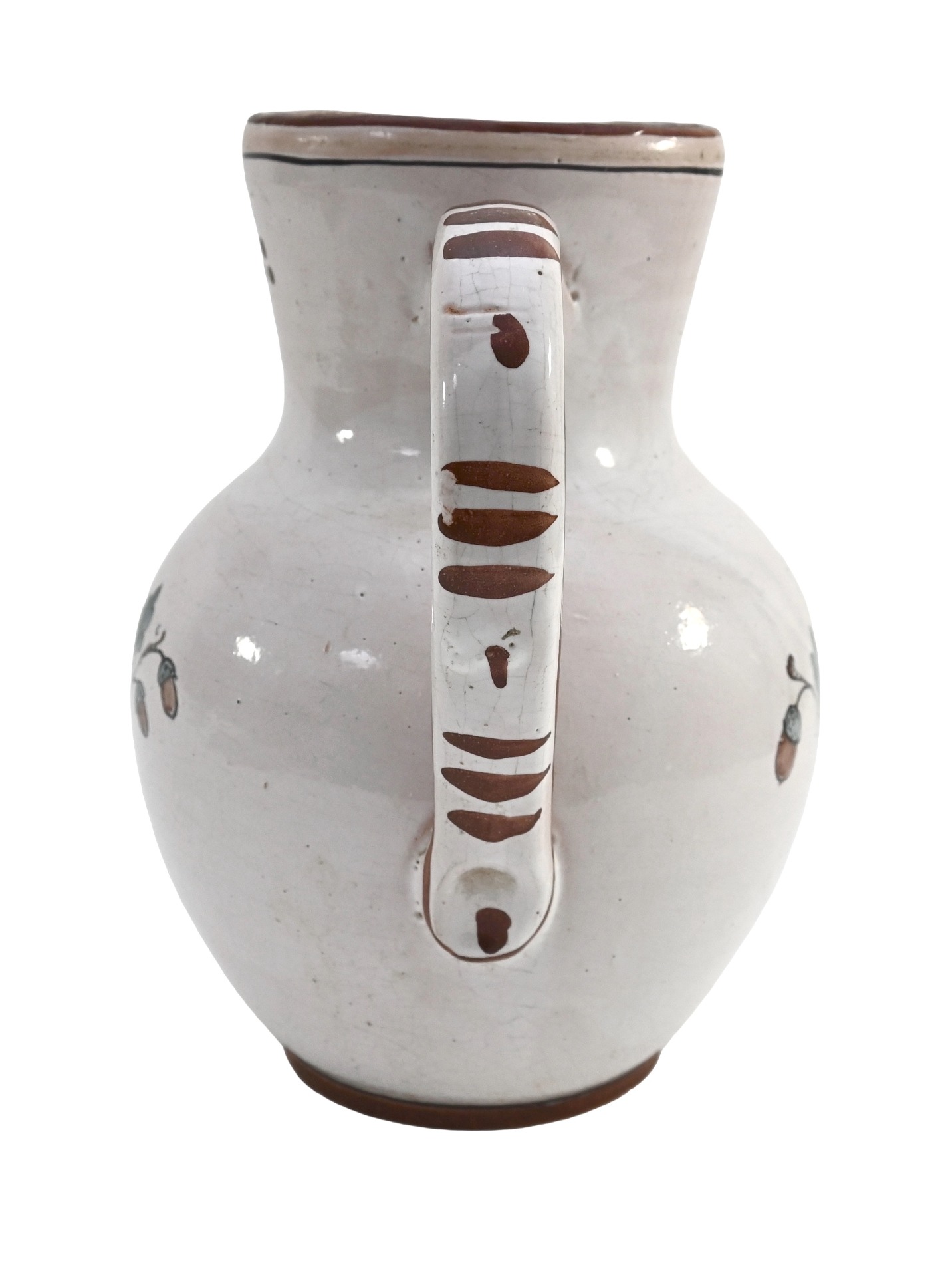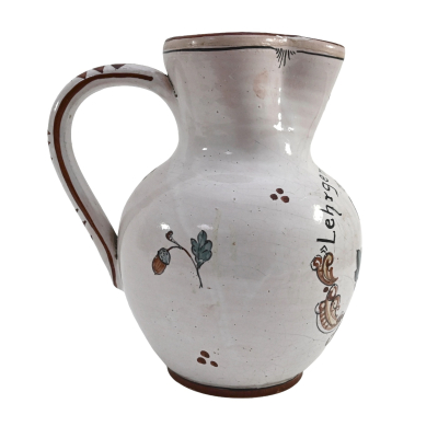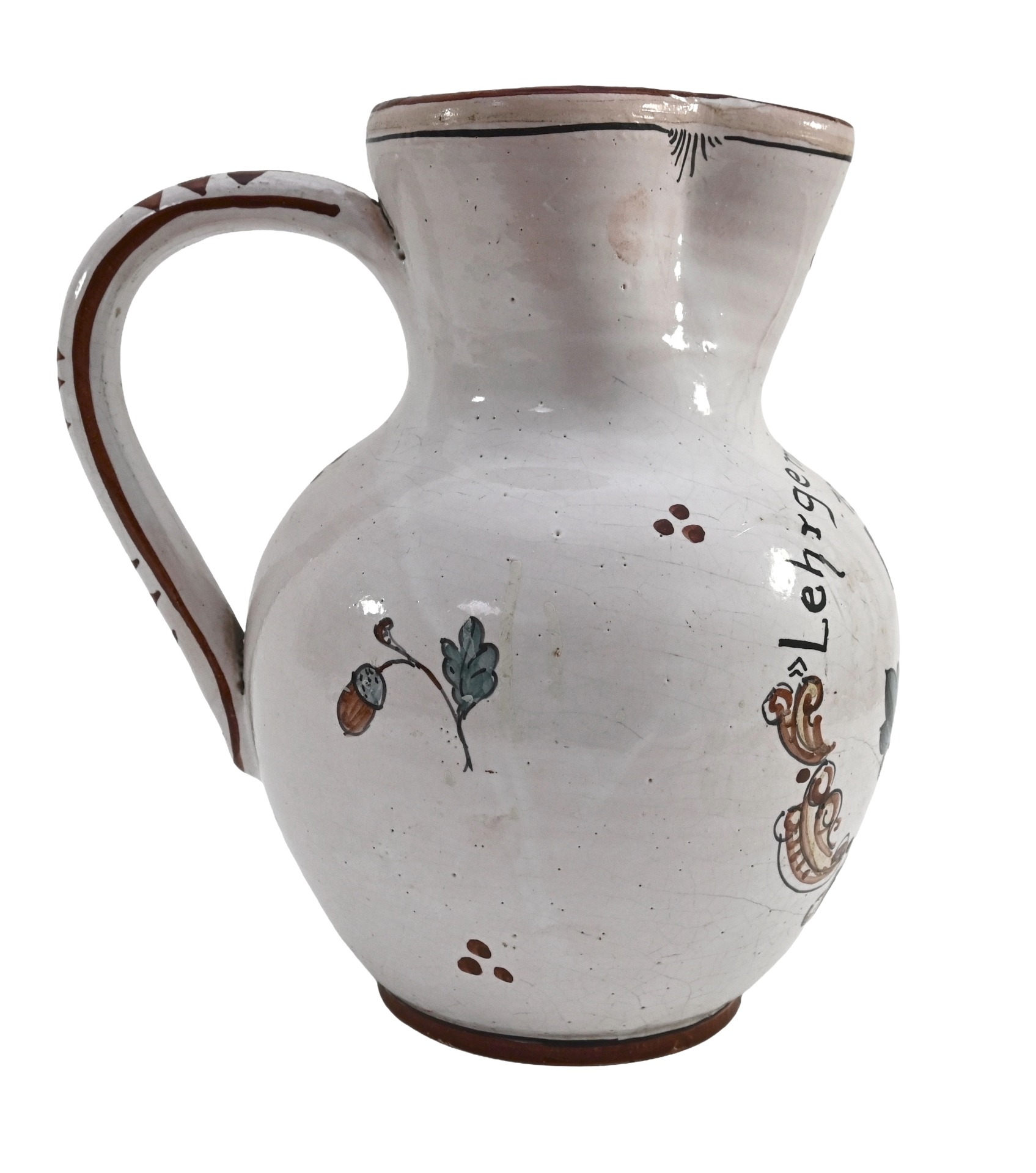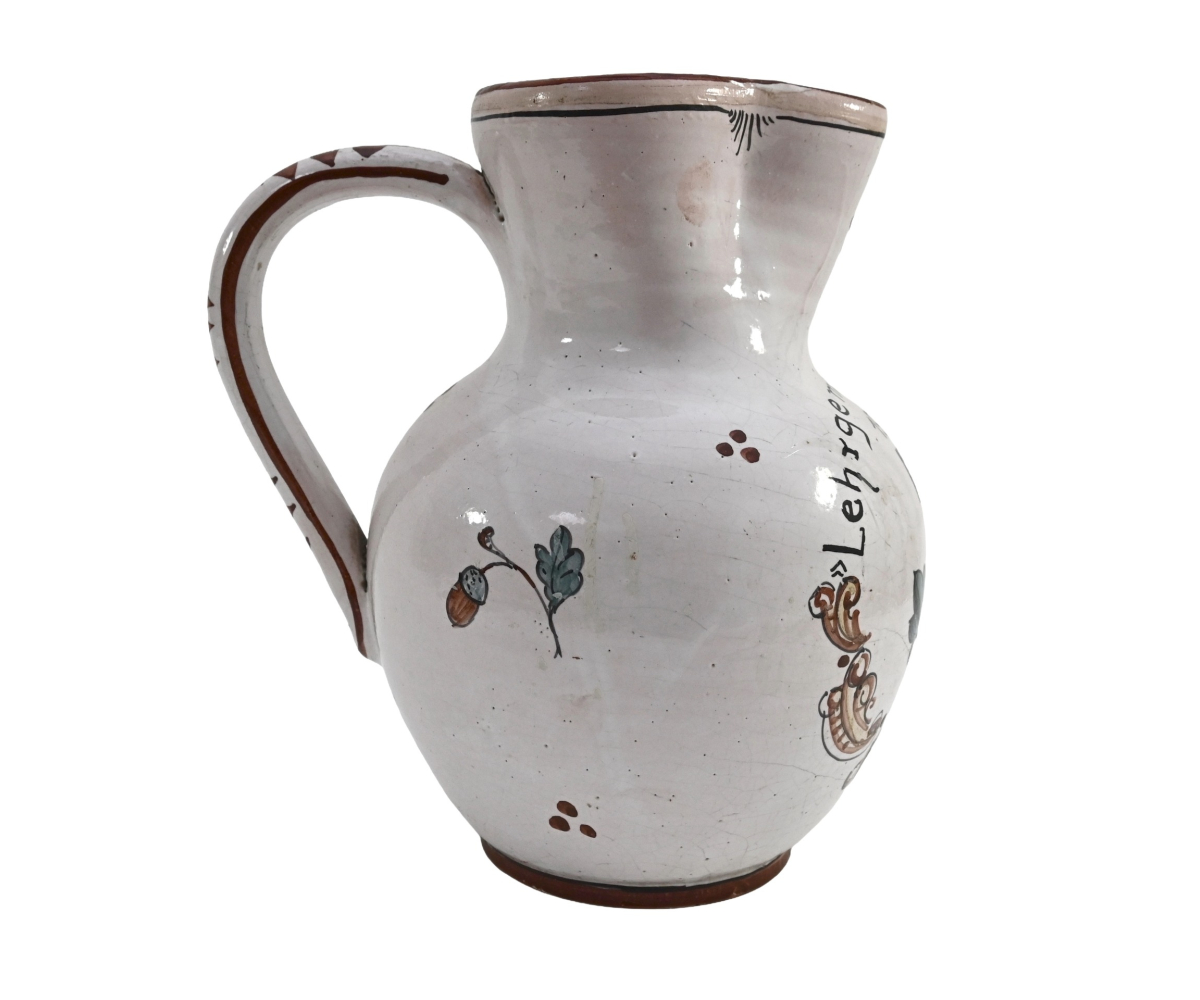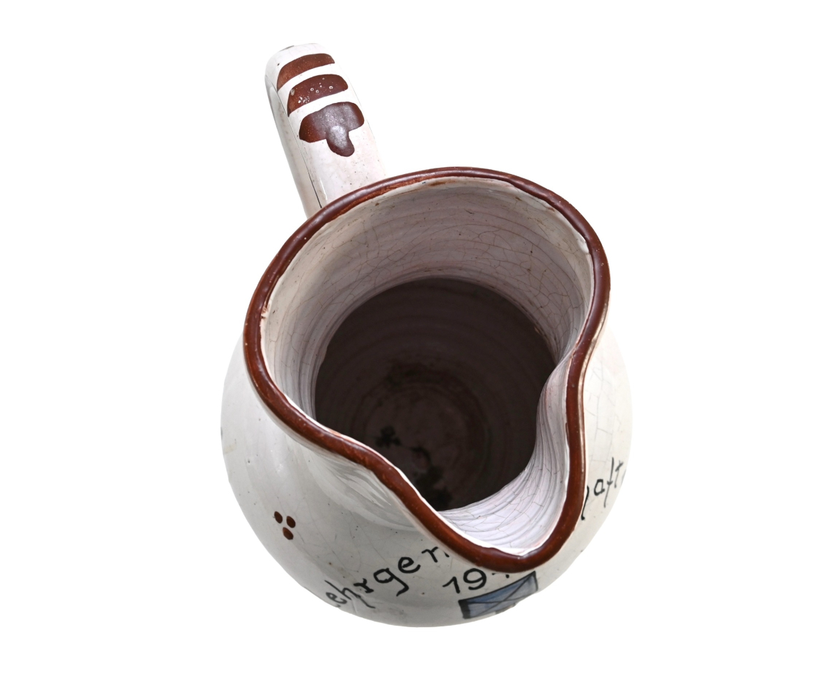 The pitcher is beautifully decorated. There are signs of wear/cracks, but these have been nicely repaired and the piece is very solid! The front is marked ‘Lehrgemeinschaft’ and ‘1943’. The pitcher is approximately 23 cm high.