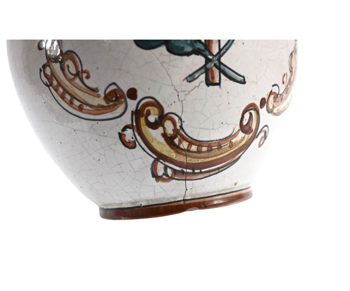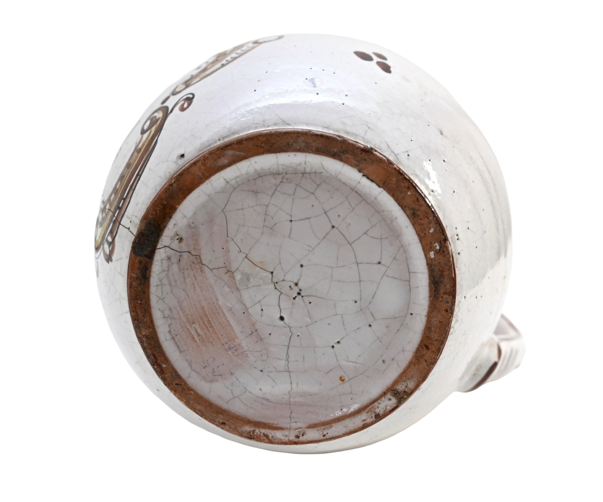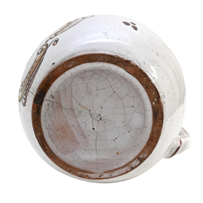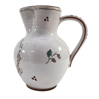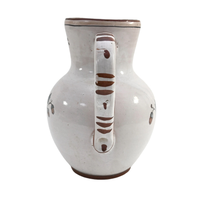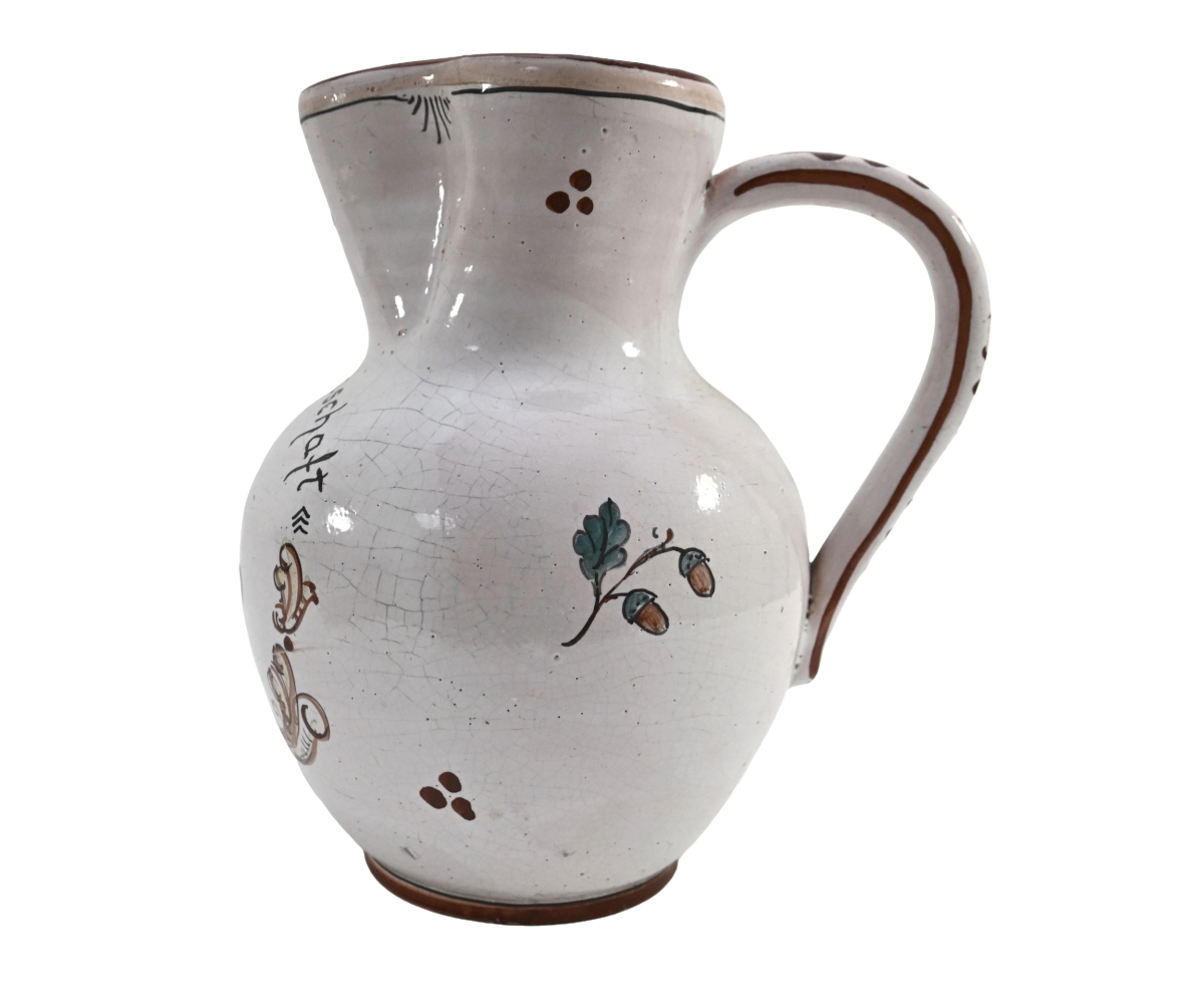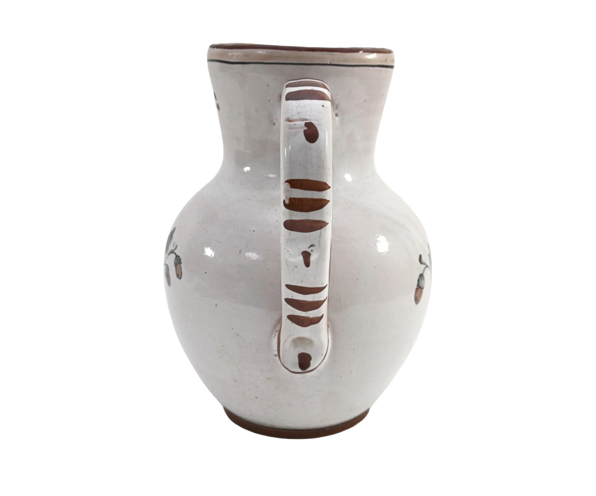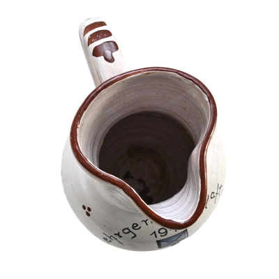The pitcher is beautifully decorated. There are signs of wear/cracks, but these have been nicely repaired and the piece is very solid! The front is marked ‘Lehrgemeinschaft’ and ‘1943’. The pitcher is approximately 23 cm high.