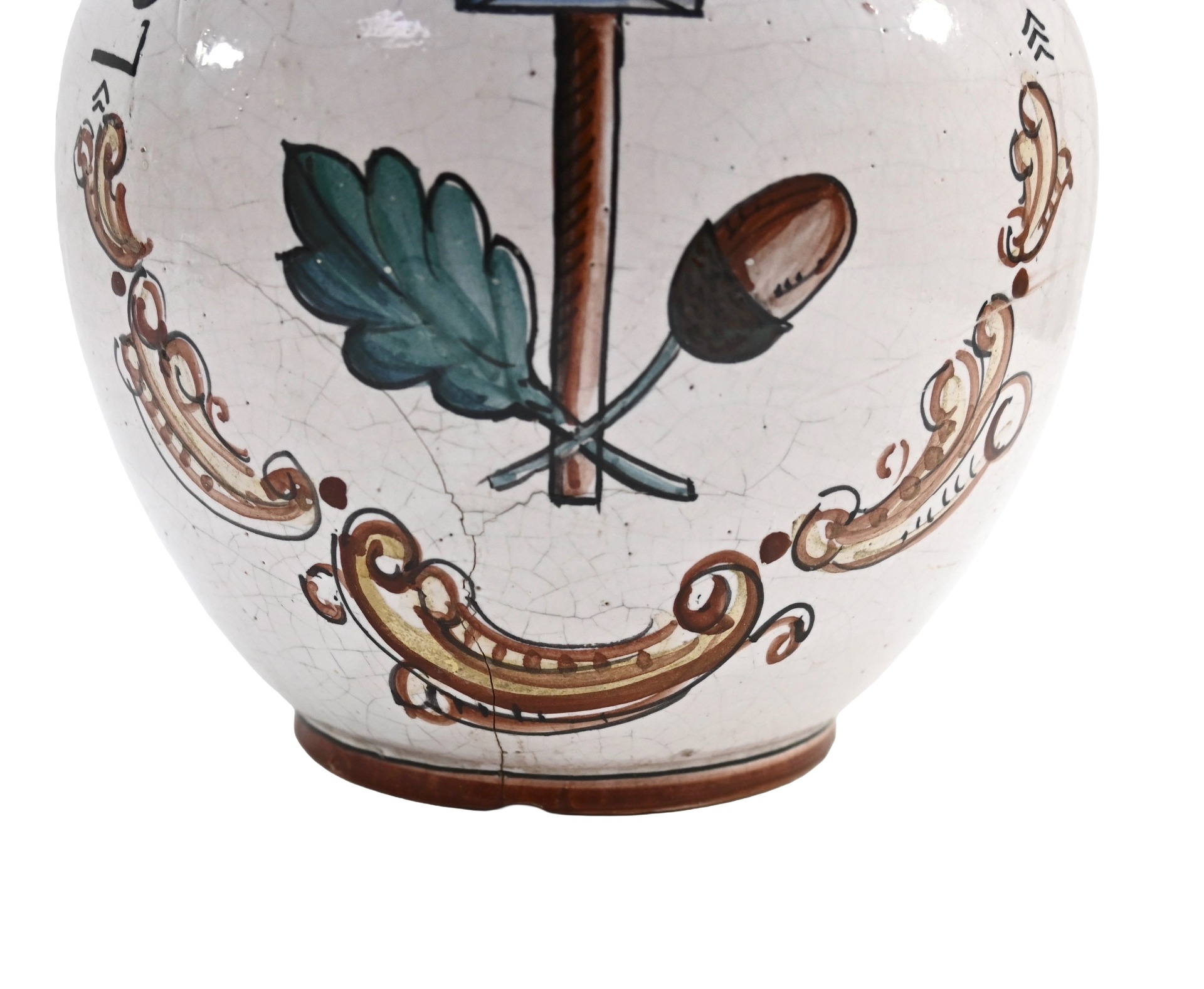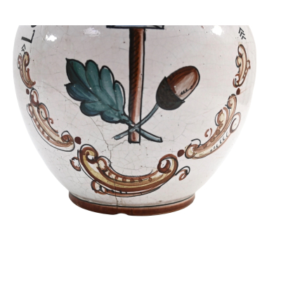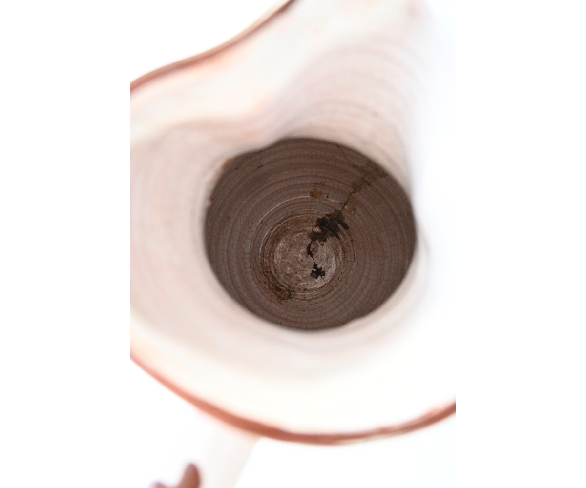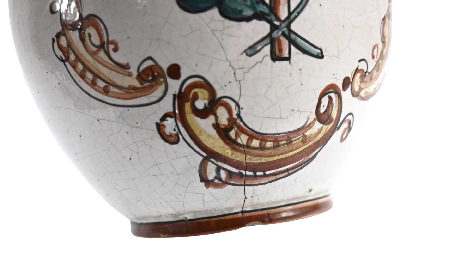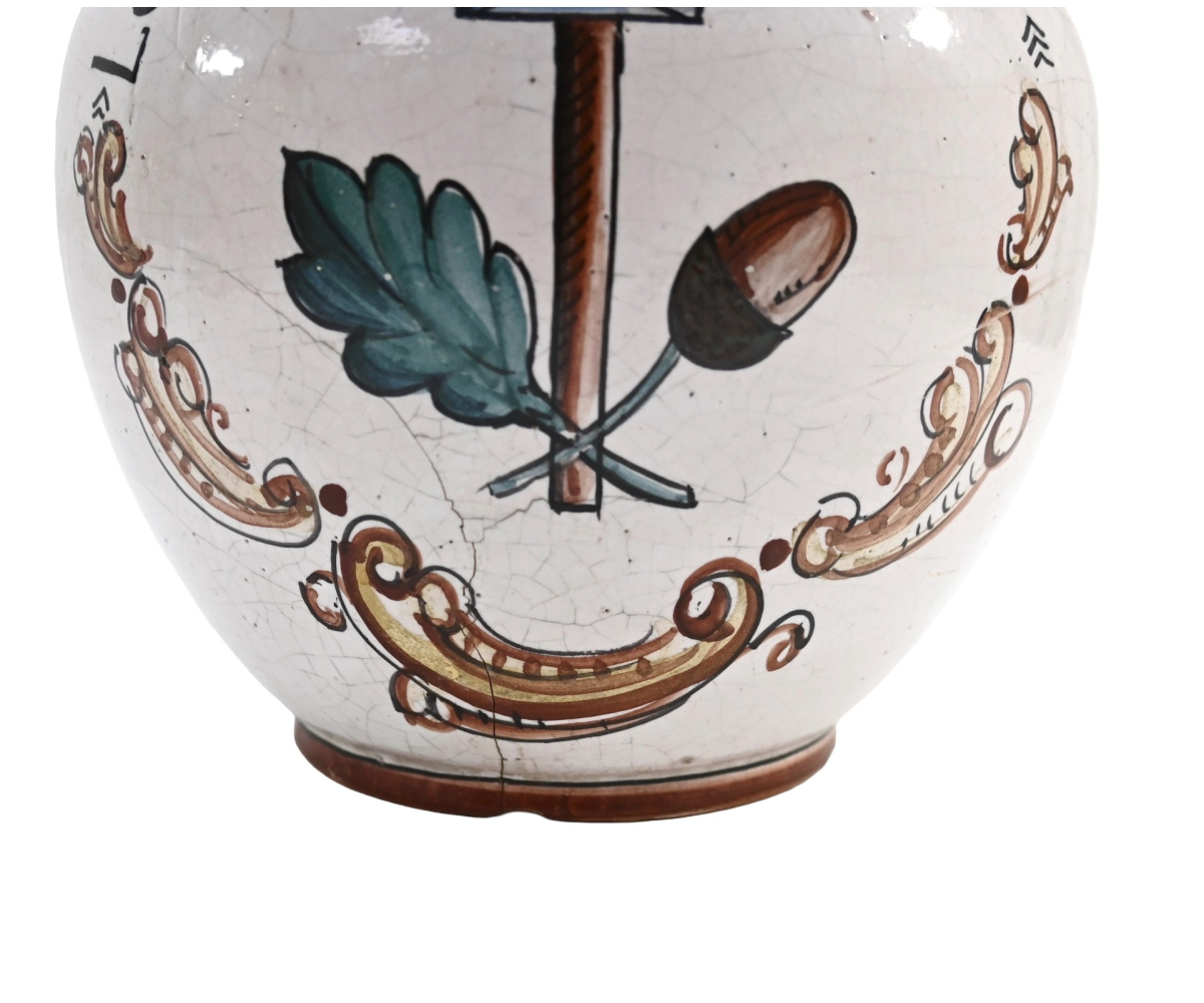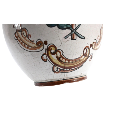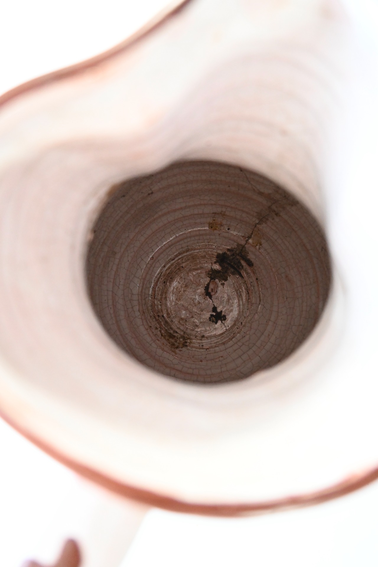 The pitcher is beautifully decorated. There are signs of wear/cracks, but these have been nicely repaired and the piece is very solid! The front is marked ‘Lehrgemeinschaft’ and ‘1943’. The pitcher is approximately 23 cm high.