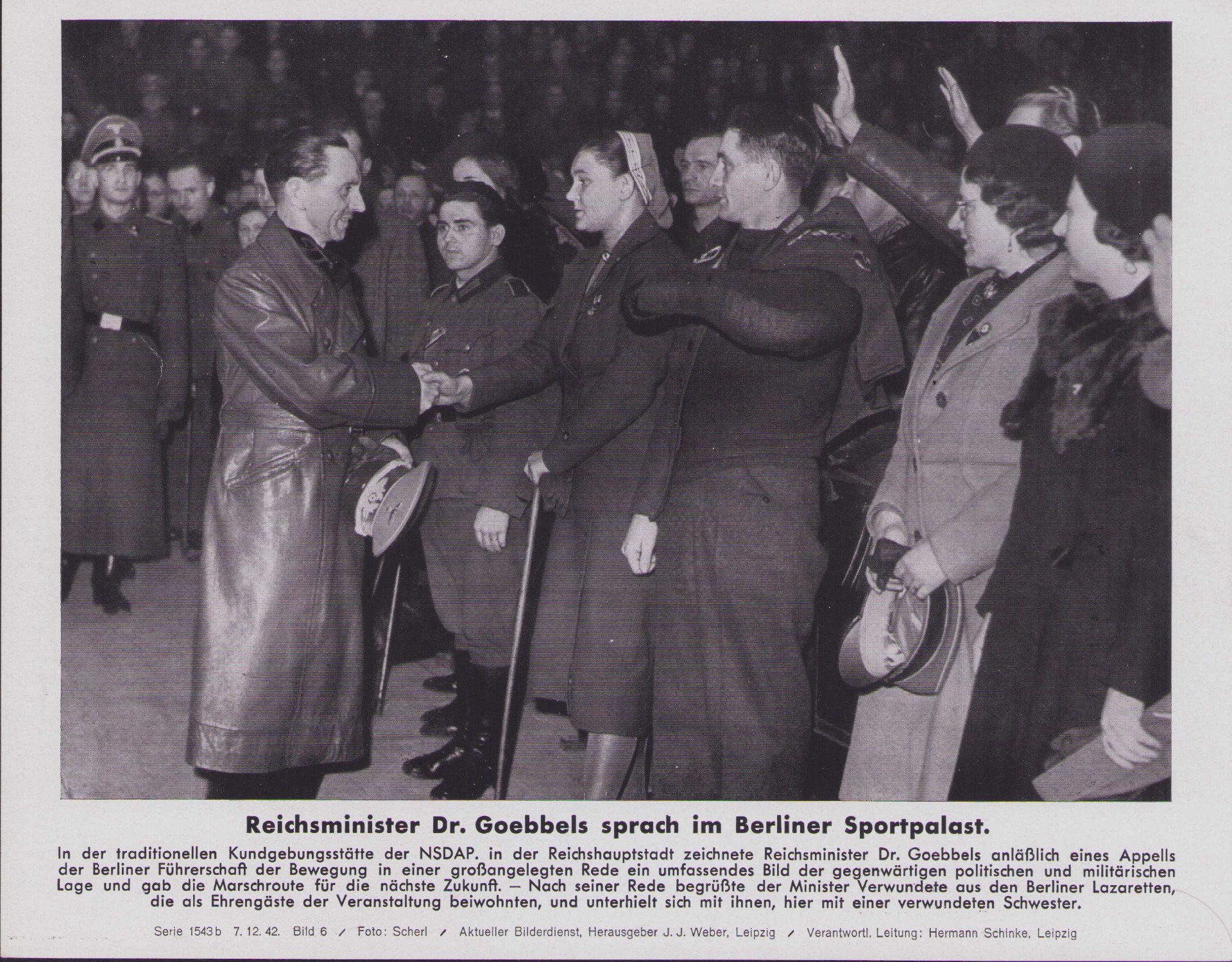 The photo shows overall normal signs of storage wear. Here Dr.Goebbels is greeting wounded soldiers/DRK nurse in the Berliner Sportpalast.