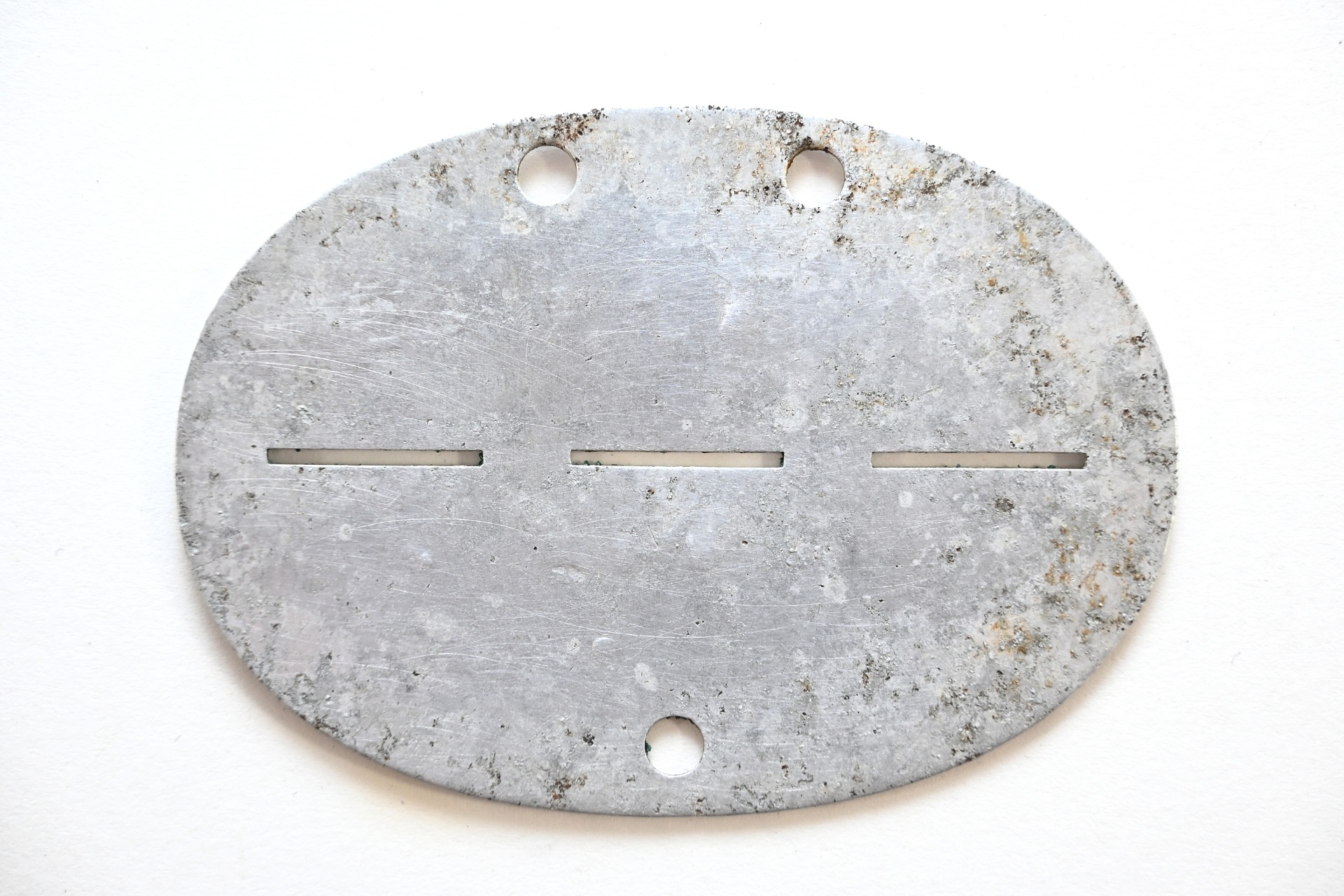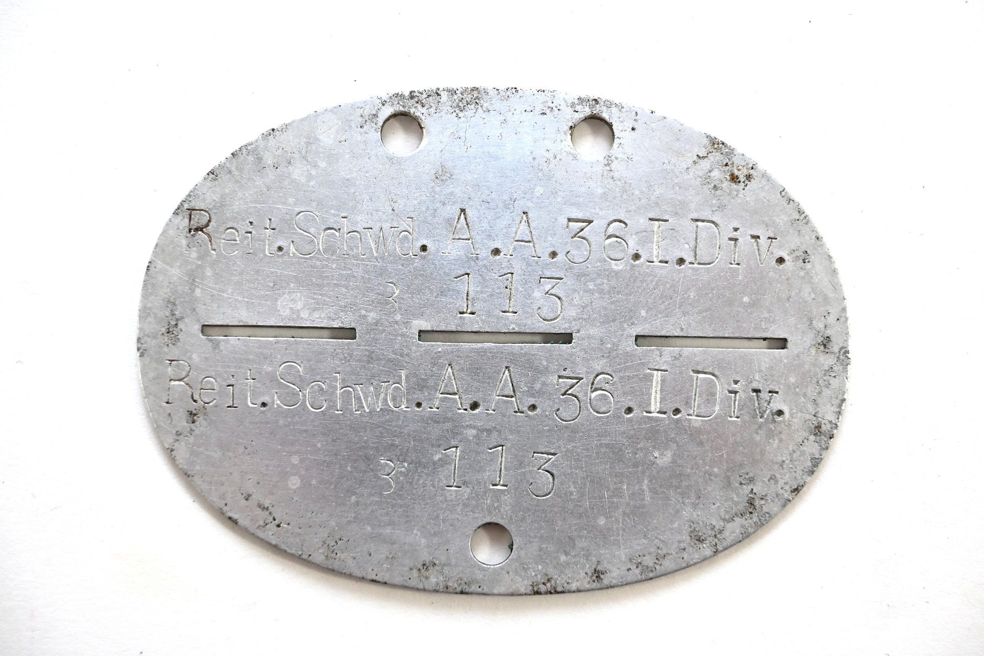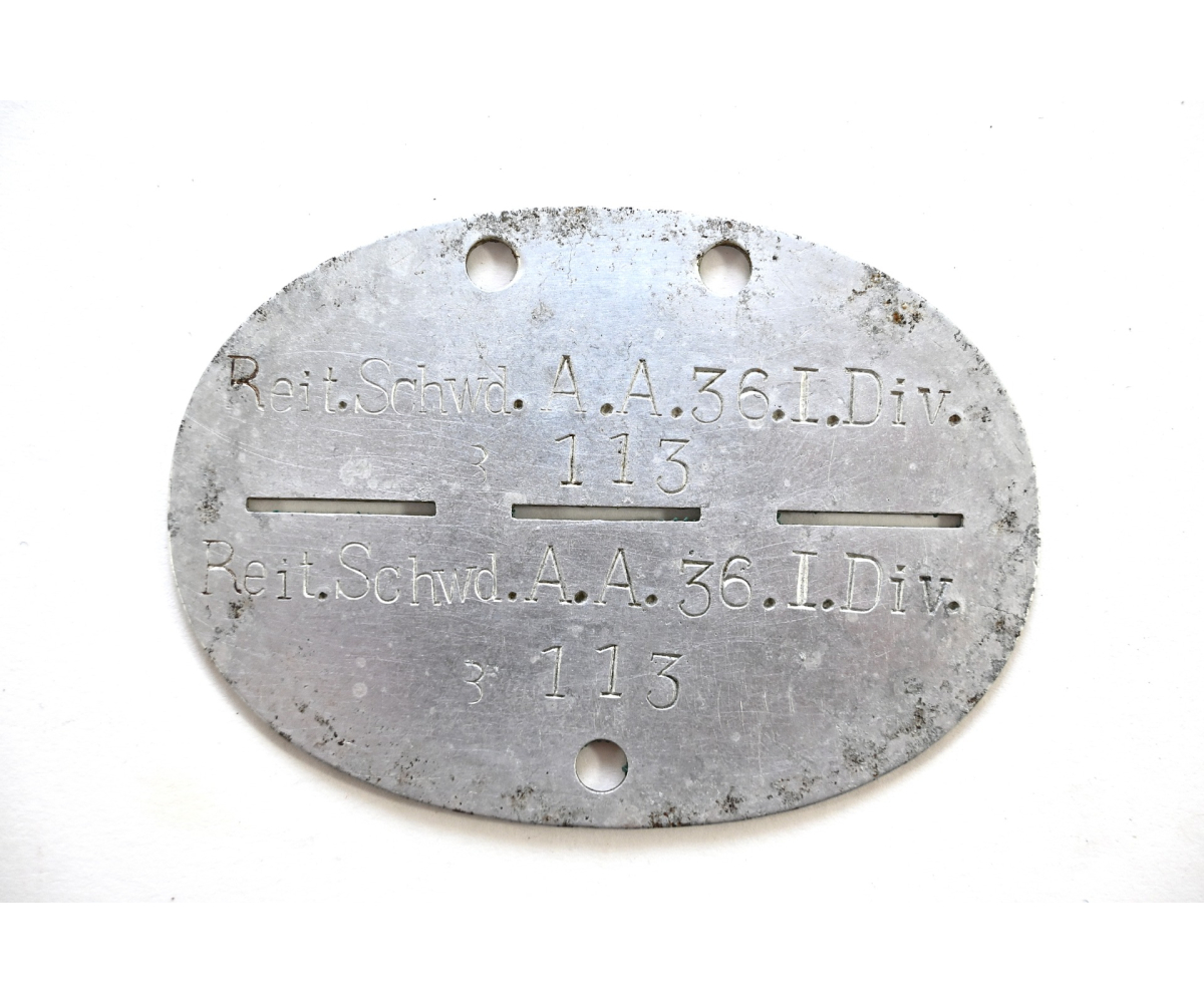 The tag or 'Erkennungsmarke' shows overall normal signs of wear. It belonged to a soldier who served in a Reiter Schwadron Aufklärungs Abteilung 36.Infanterie-Division. This unit was formed in late august 1939 from Kavallerie Regiment 6. In November 1940 the abteilung became motorised. In November 1941 the unit was renamed into Voraus-Abteilung 36 and in March 1942 it was disbanned. The remnants of the abteilung were absorbed within Kradschützen-Bataillon 46.