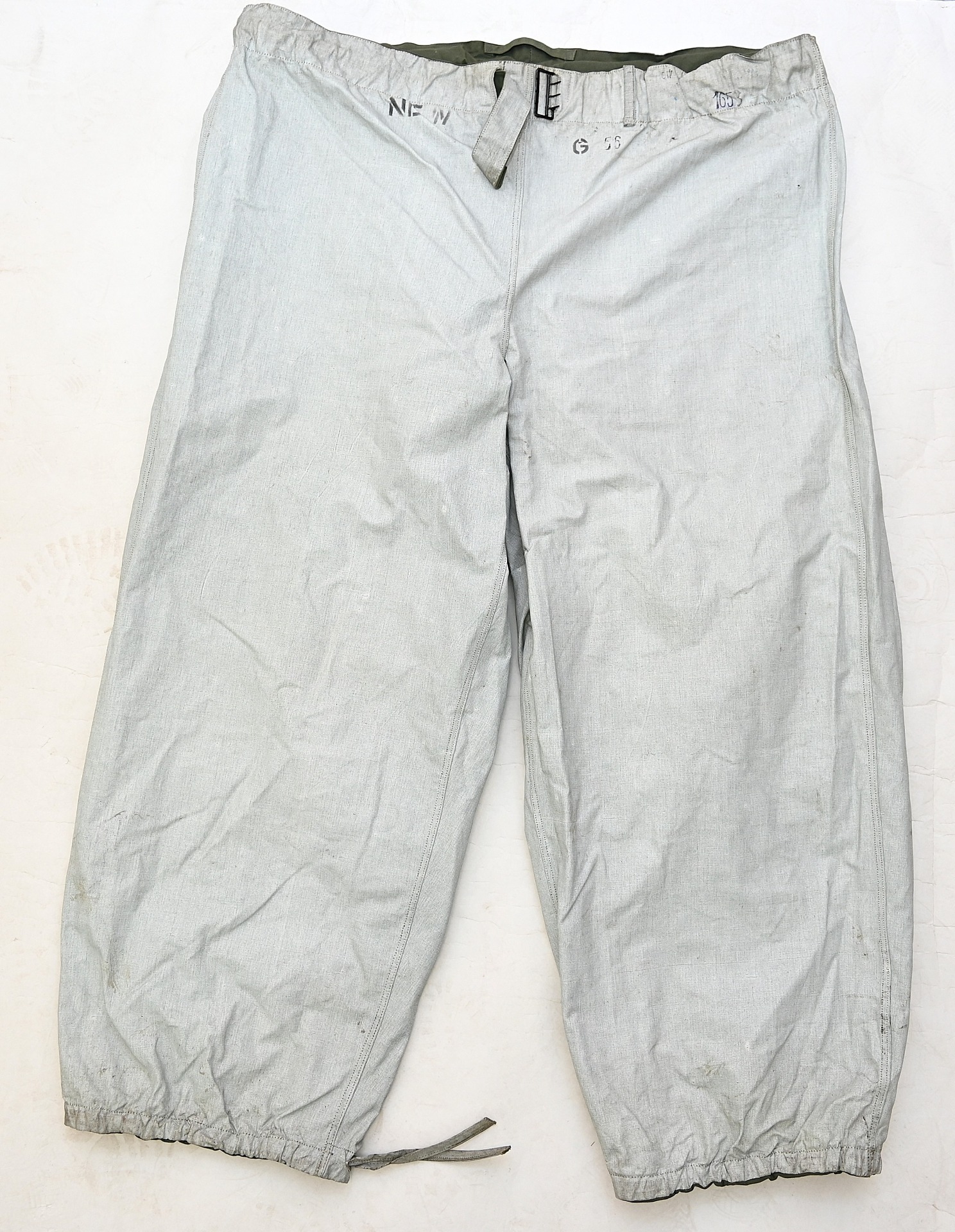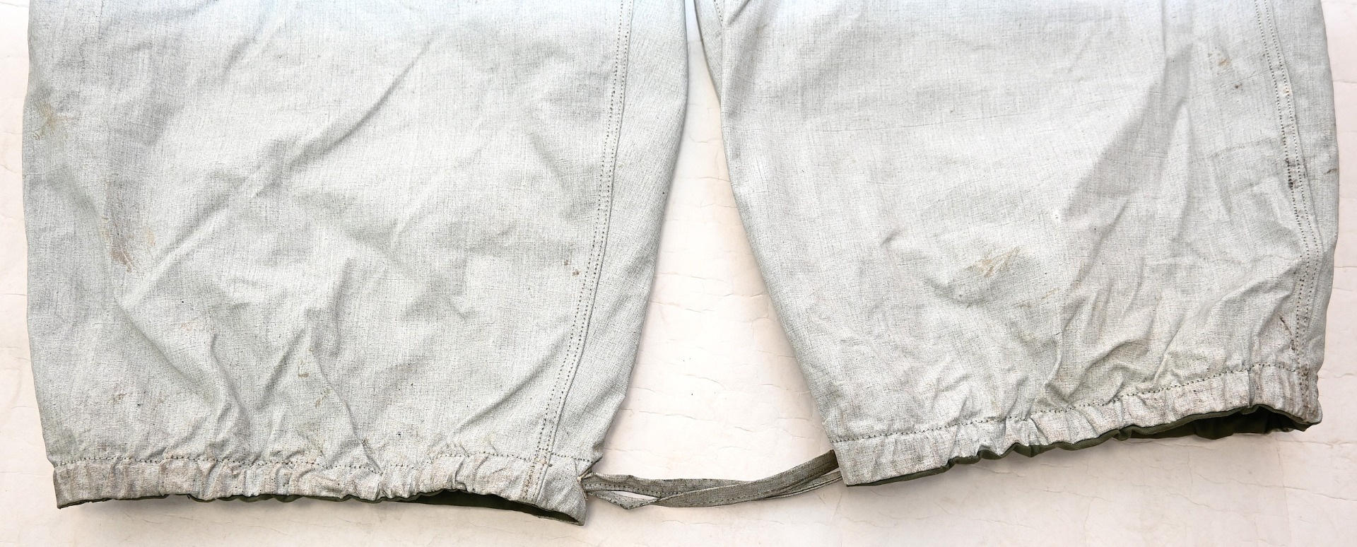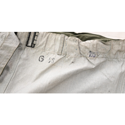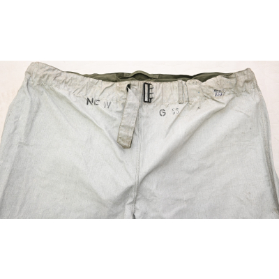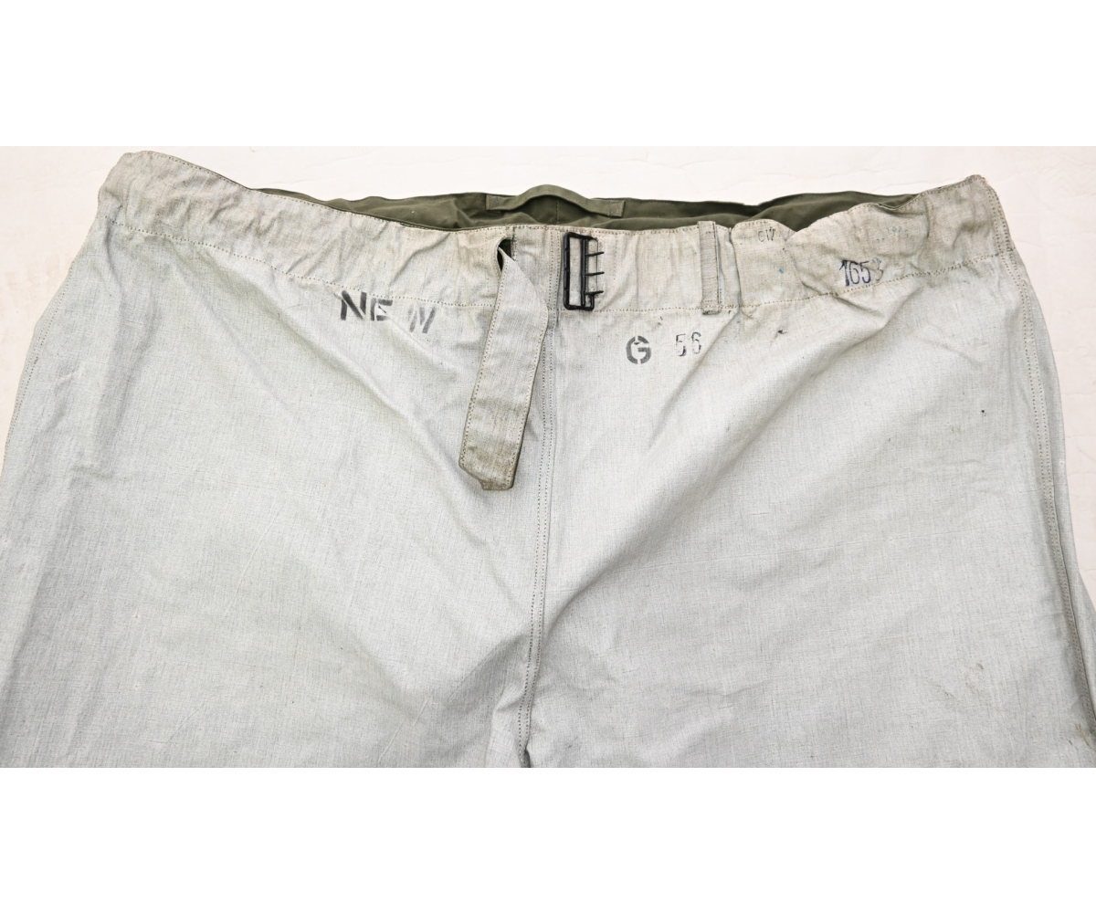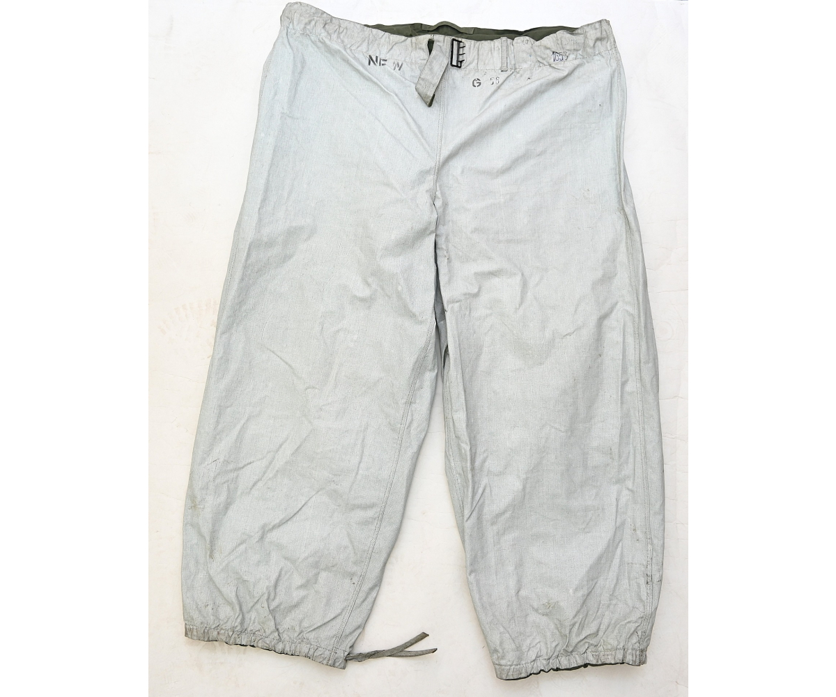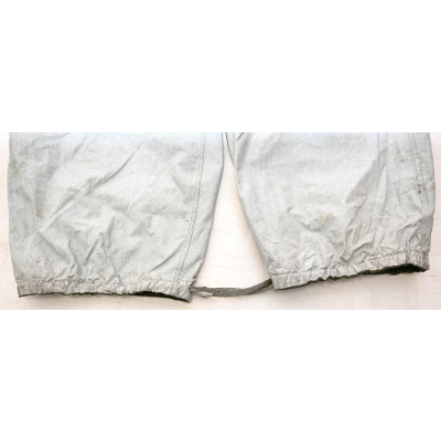 The trousers are in very good condition. It only shows some storage spots, mainly on the white side. The trousers are complete with the adjustment belt, leg ties and the white side is treated with a water repellent coating making it rubberized.