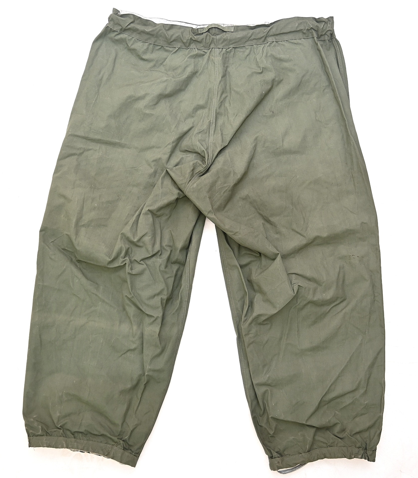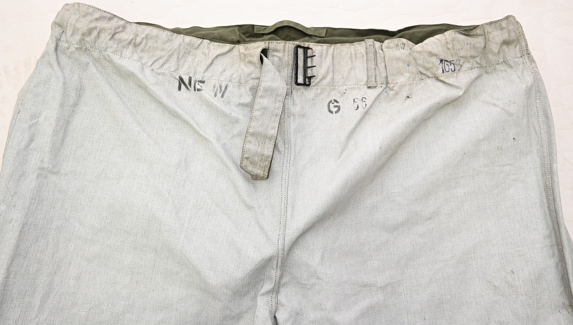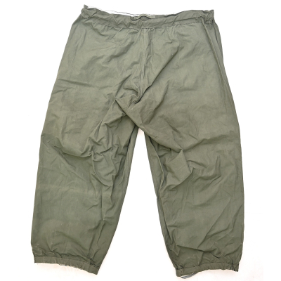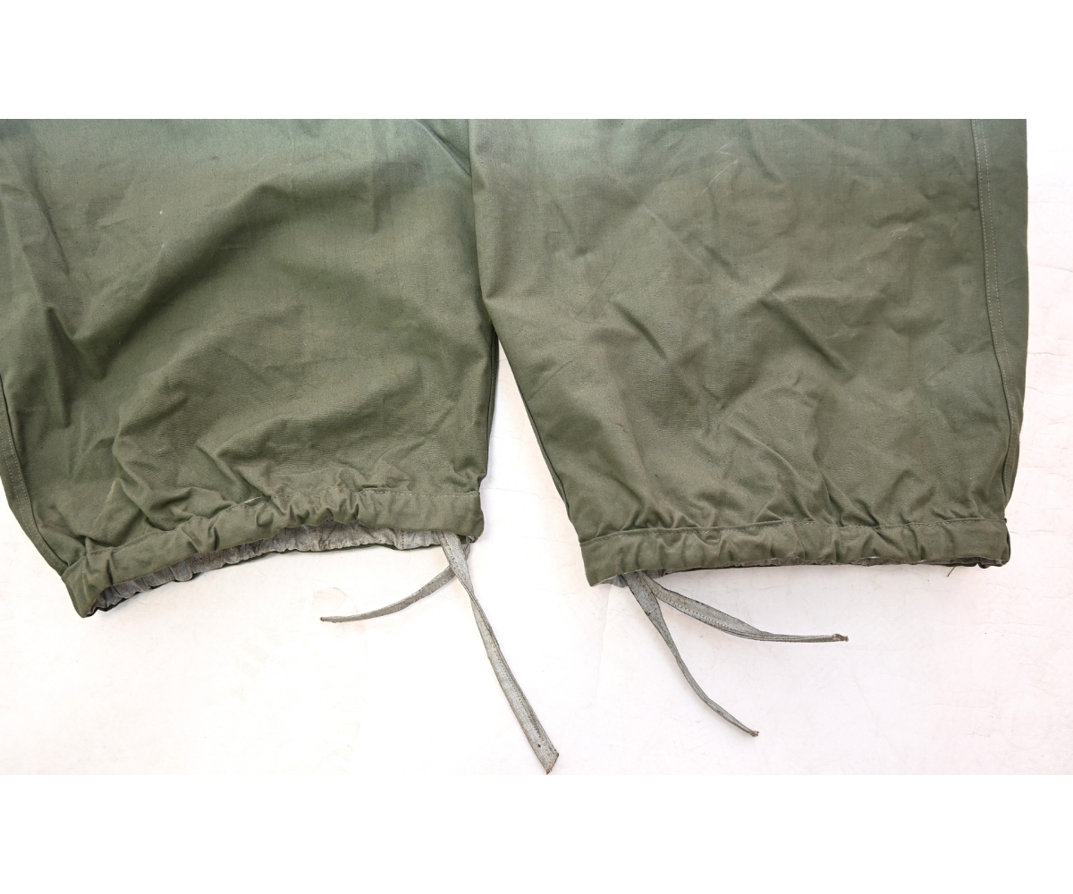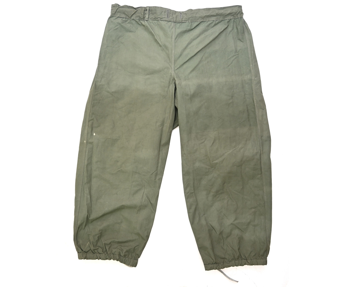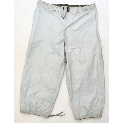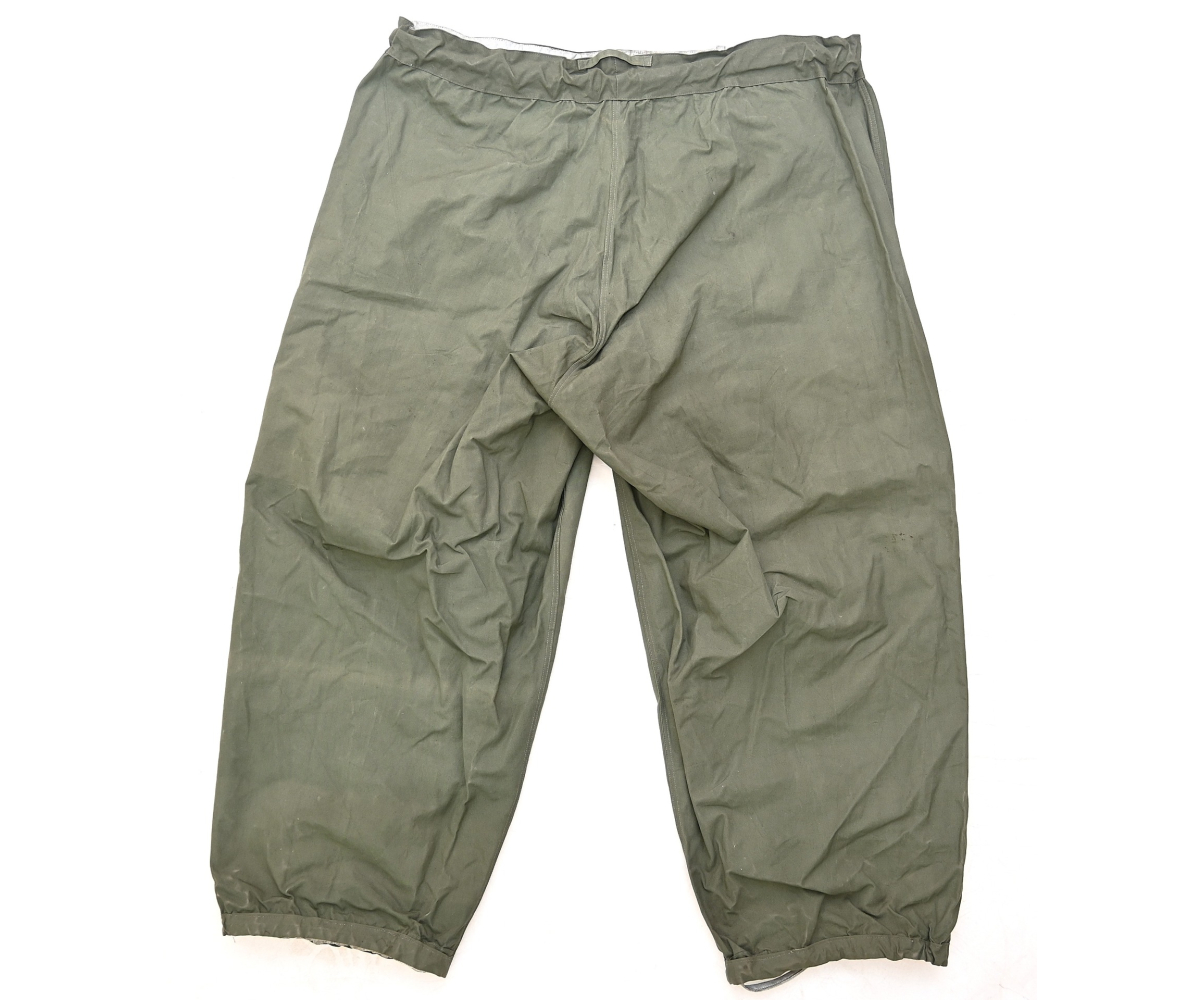The trousers are in very good condition. It only shows some storage spots, mainly on the white side. The trousers are complete with the adjustment belt, leg ties and the white side is treated with a water repellent coating making it rubberized.
