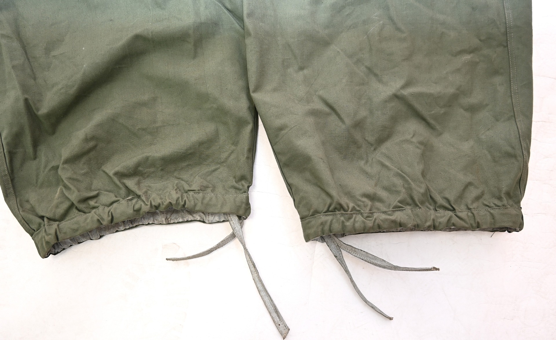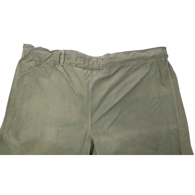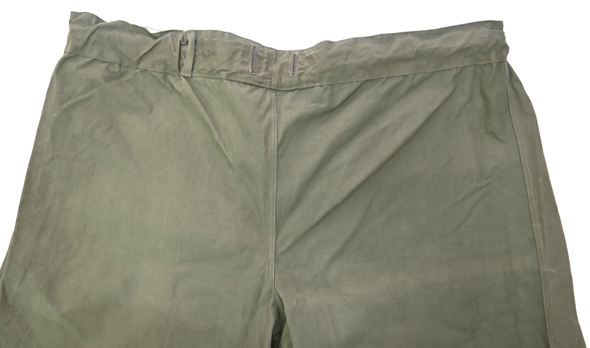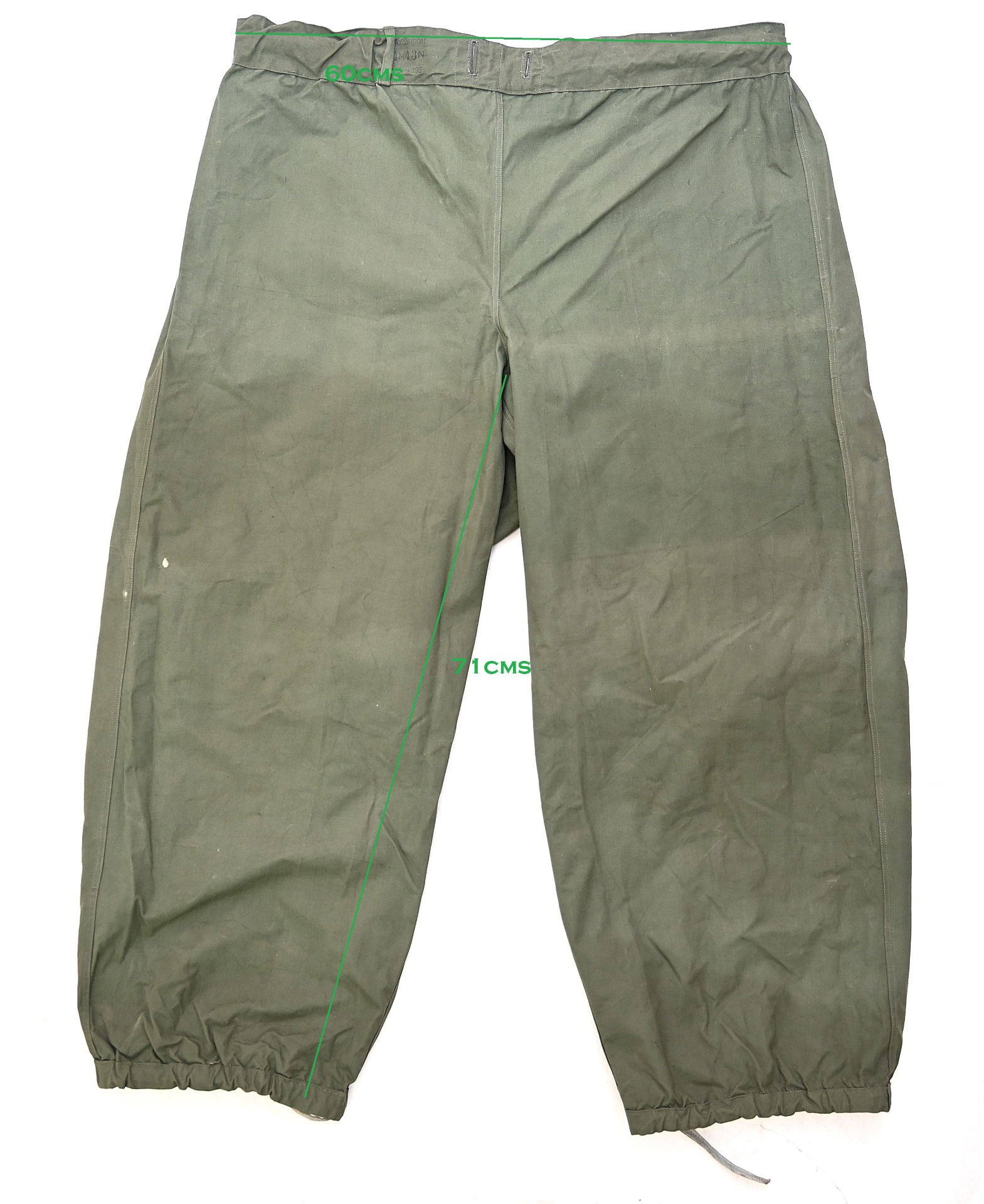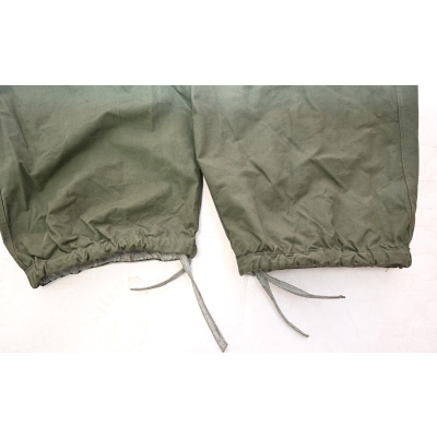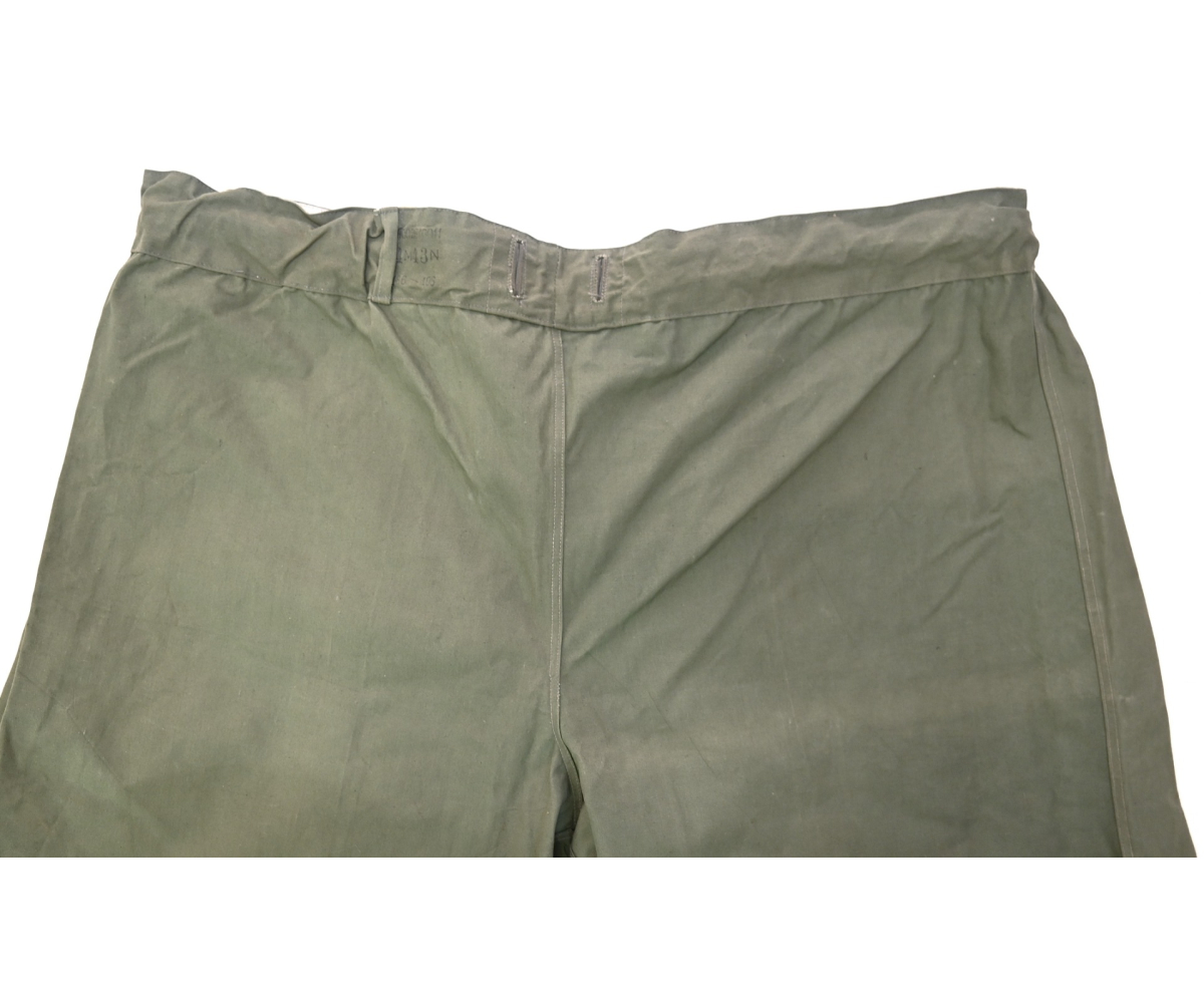 The trousers are in very good condition. It only shows some storage spots, mainly on the white side. The trousers are complete with the adjustment belt, leg ties and the white side is treated with a water repellent coating making it rubberized.