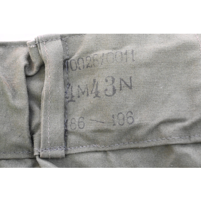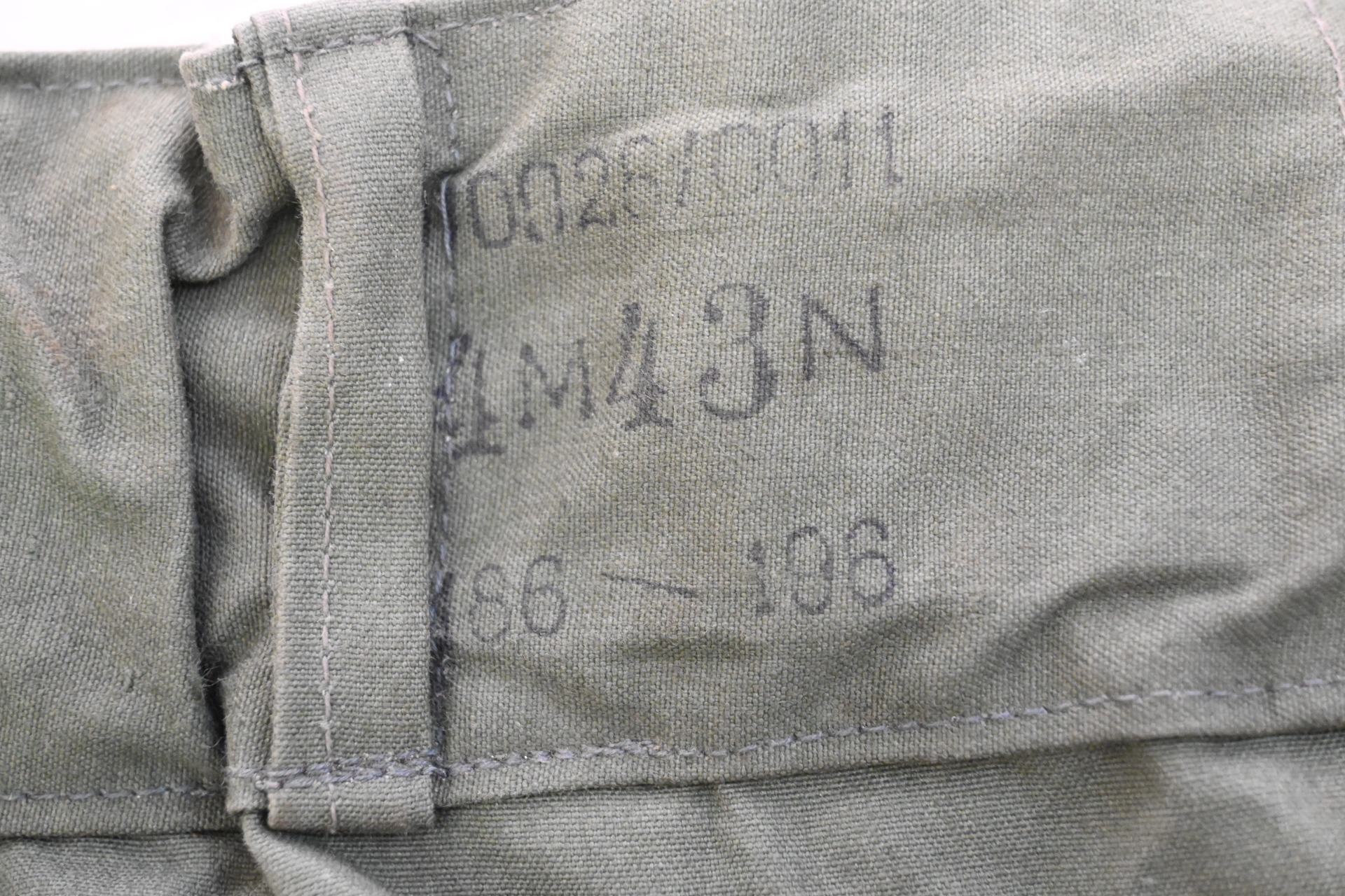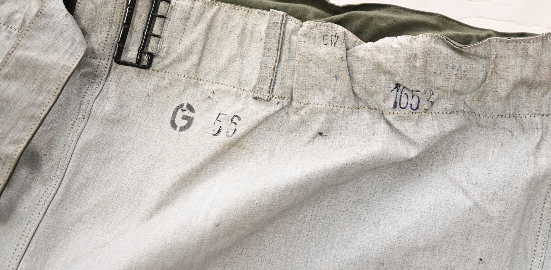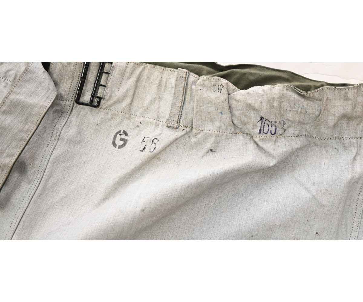 The trousers are nicely 'RBNr 0/0028/0011' , size marked '186-196' and depot marked 'M' (probably 'Münich') and dated '1943'. On the white side there are a couple of markings which are probably US depot markings.