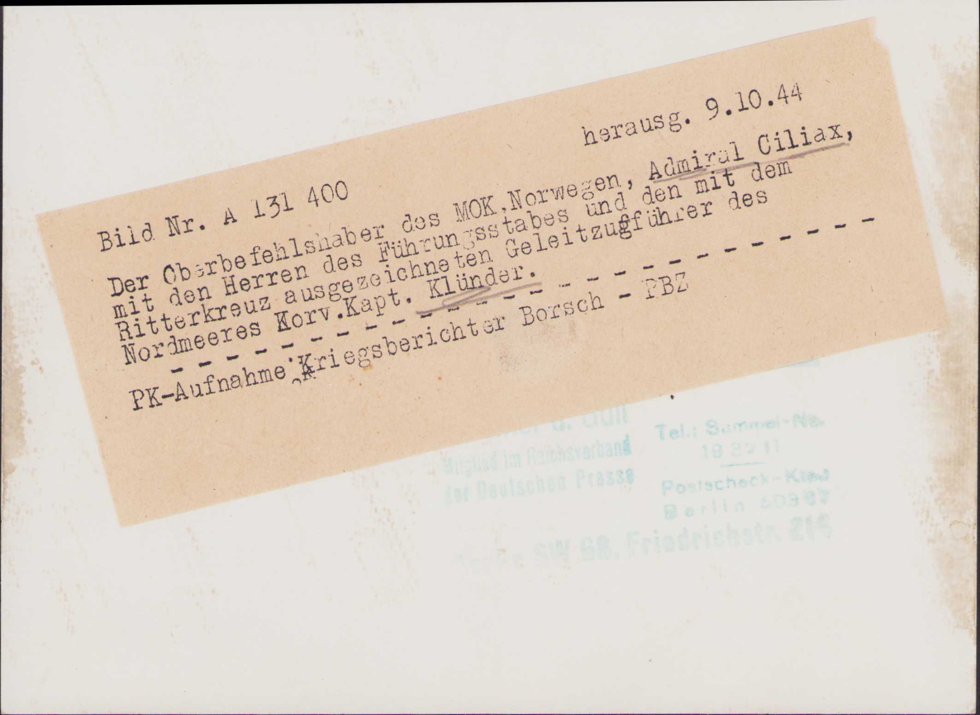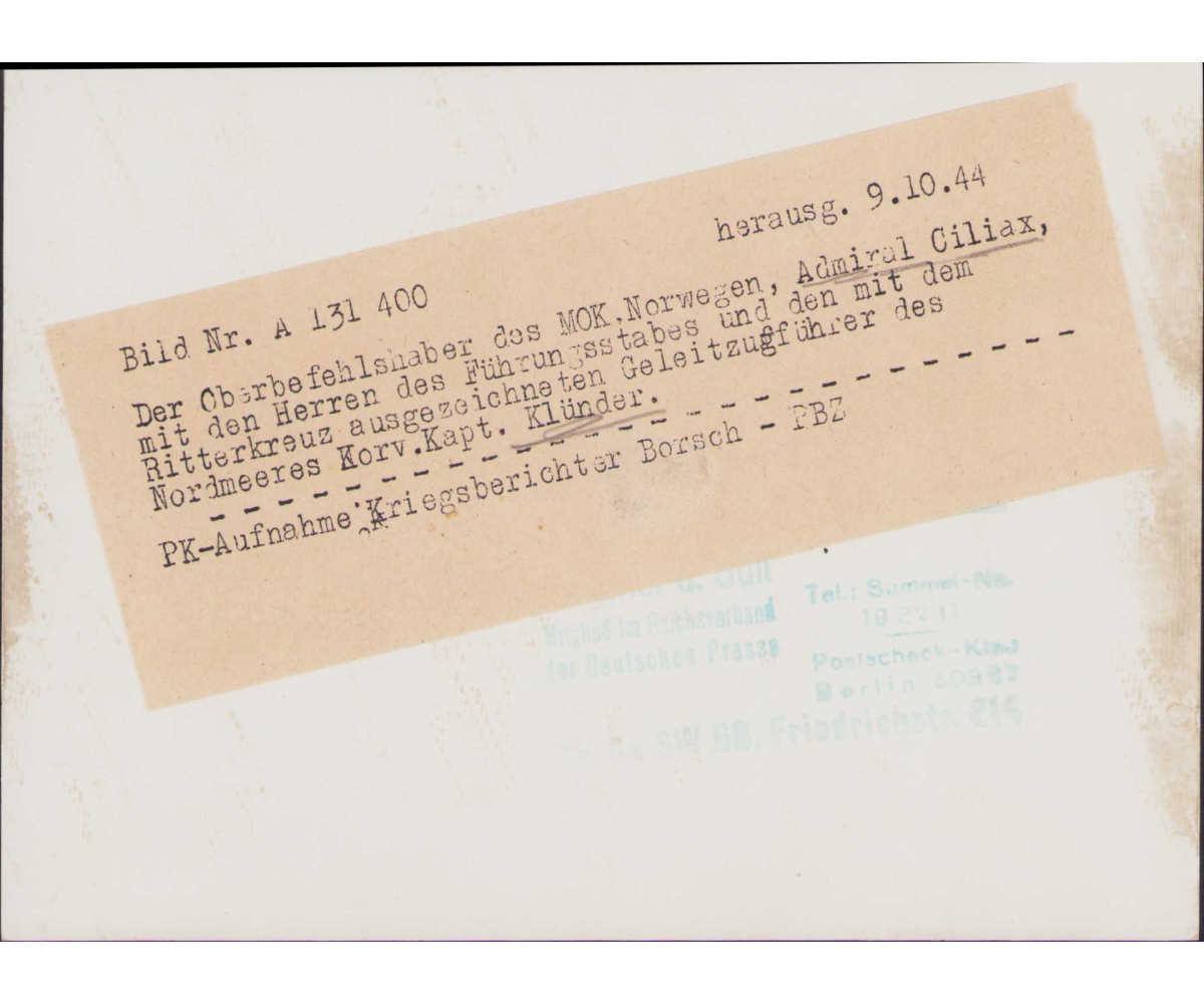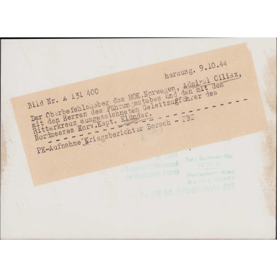 The photographs shows overall normal signs of wear. It's complete with paper caption on the back. Ciliax was Marinebefehlshaber Norwegen the moment the photo was released.