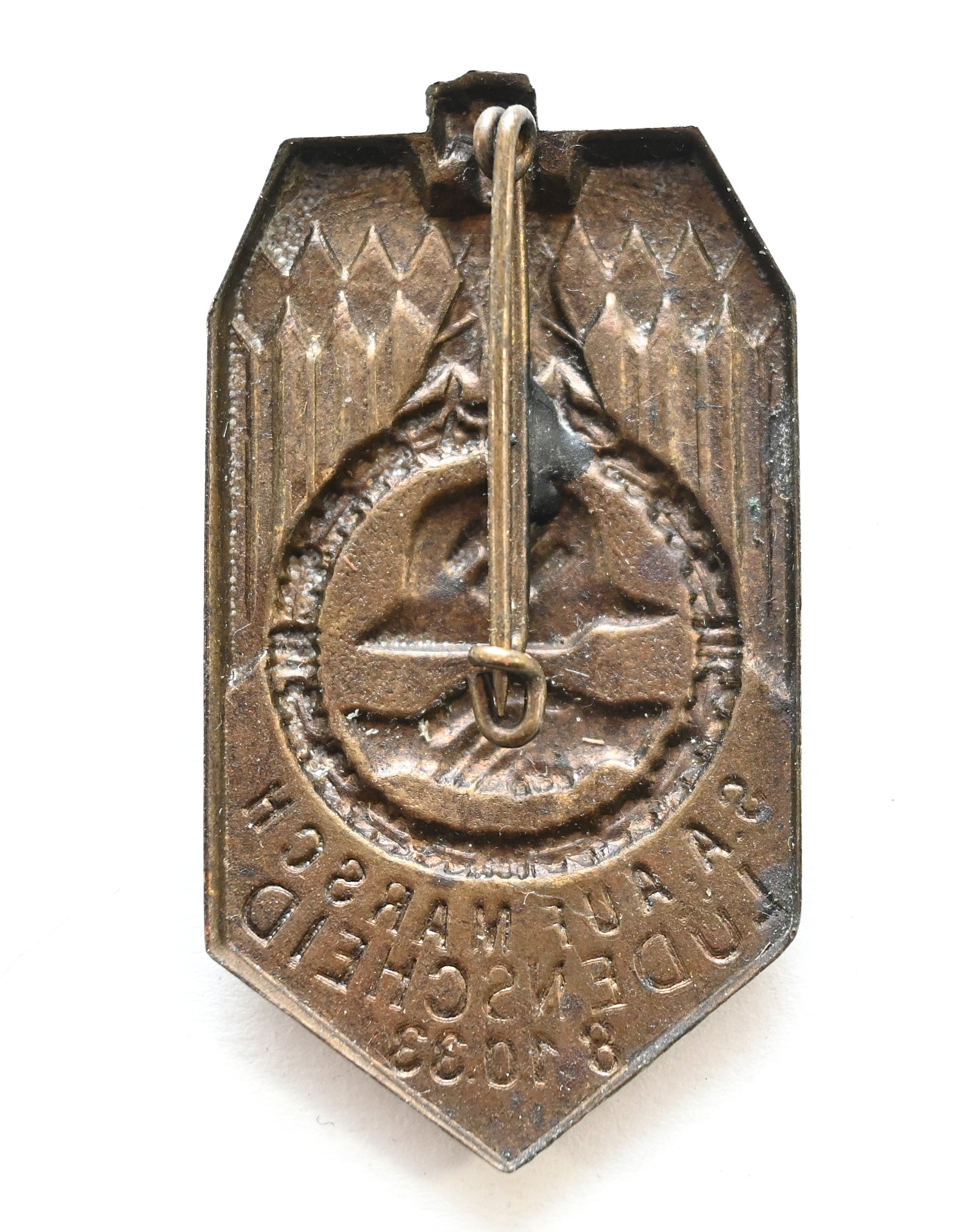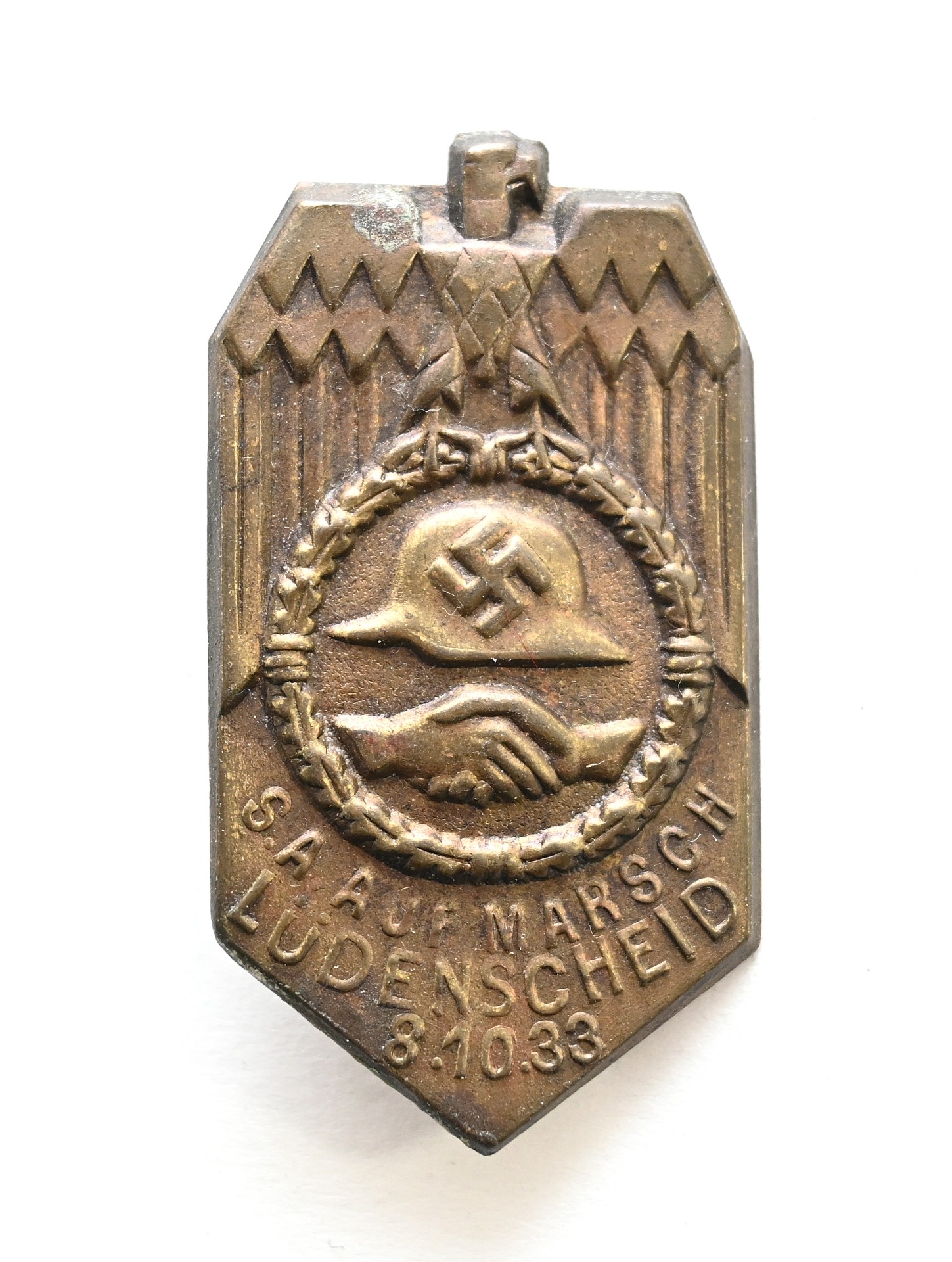 The badge or Abzeichen shows overall normal signs of wear. It's complete with pin on the back. Issued during the SA Aufmarsch in Lüdnscheid that took place on the 8th of October 1933.
