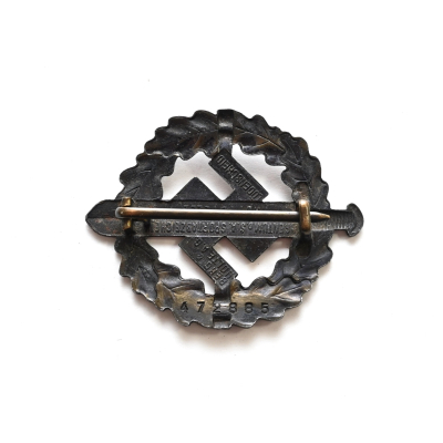 Complete with working pin and catch. Marked on the back with 'Berg & Nolte A.G.' from Lüdenscheid, 'Eigentum D. S.A. Sportabzeichen Hauptstelle' and issue number '472885', meaning it was produced between February 1935 untill the start of 1937.