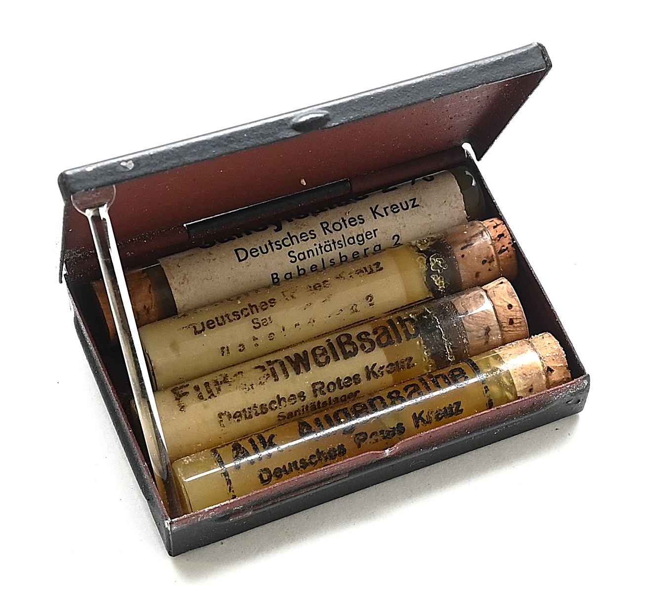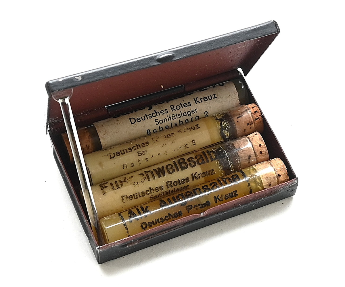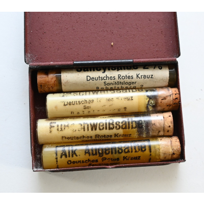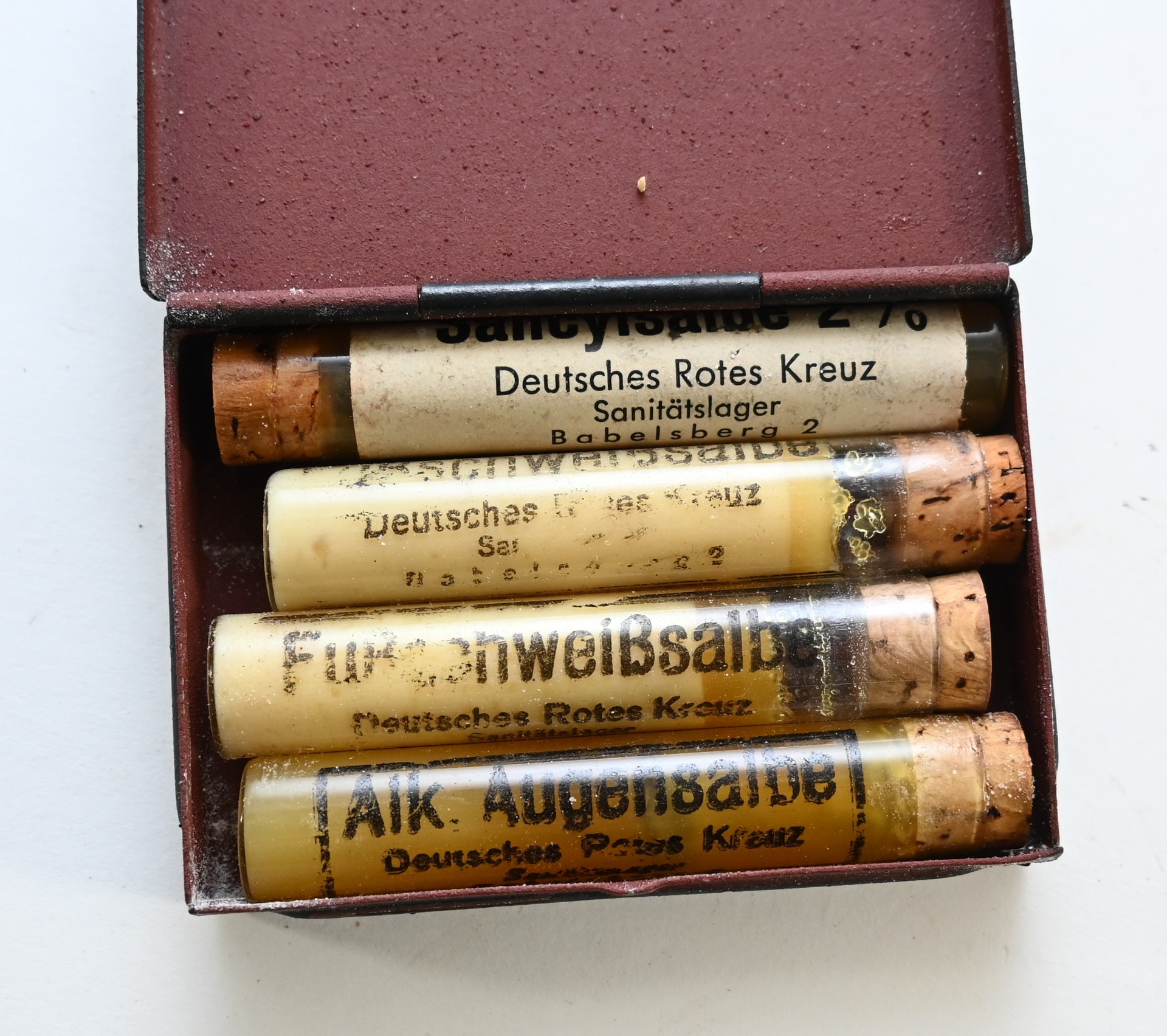 The container shows overall normal signs of wear. It contains all of it's original color and the 'Salbe' text on the lid is intact. On the inside we find 4 uncommon glass! D.R.K. marked ointment tubes and an eye ointment stick.