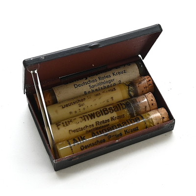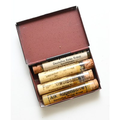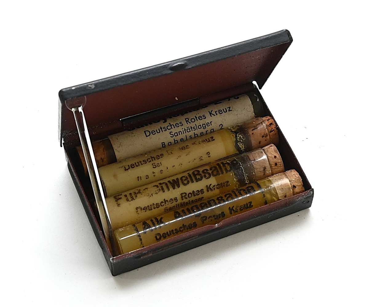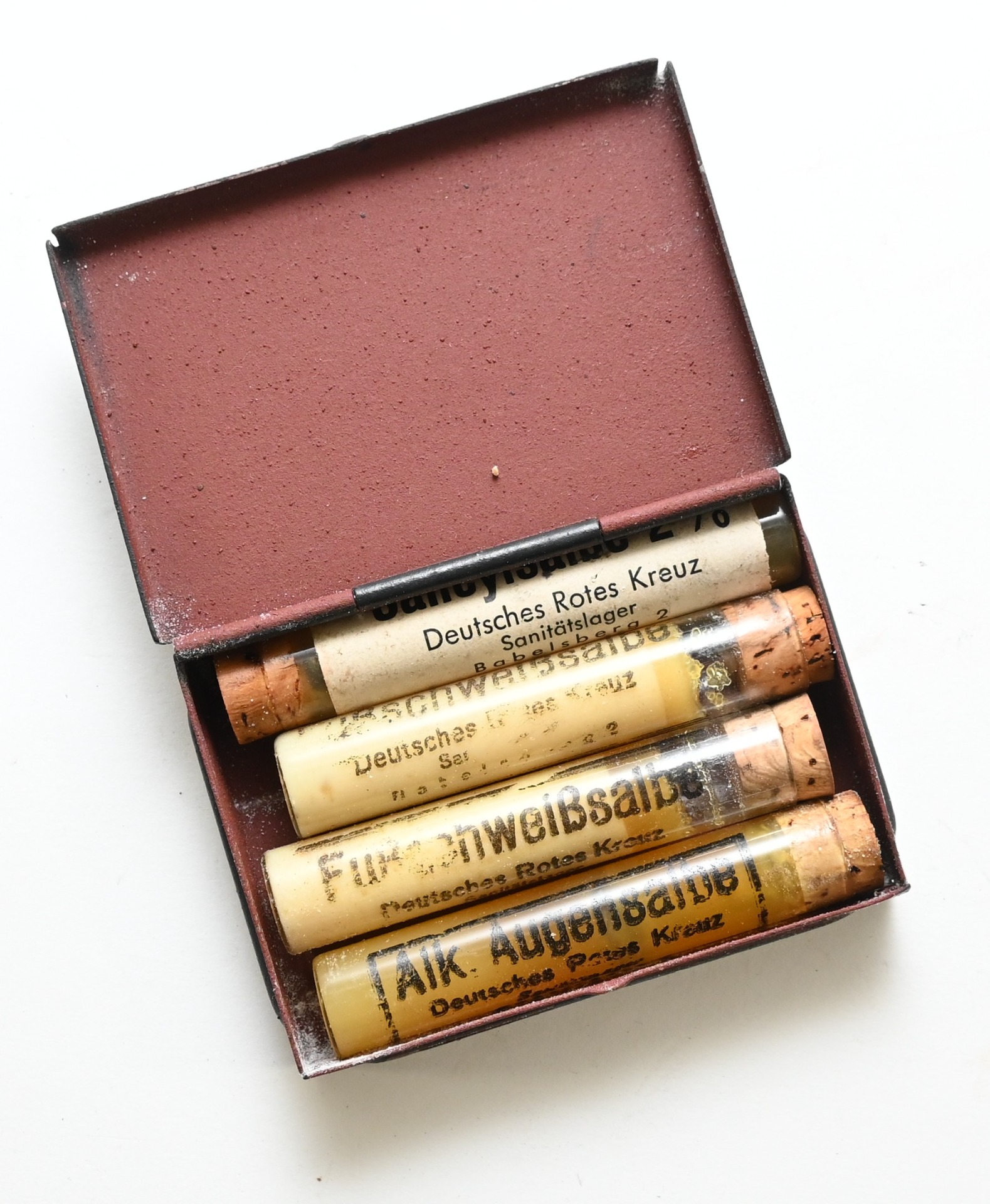 The container shows overall normal signs of wear. It contains all of it's original color and the 'Salbe' text on the lid is intact. On the inside we find 4 uncommon glass! D.R.K. marked ointment tubes and an eye ointment stick.