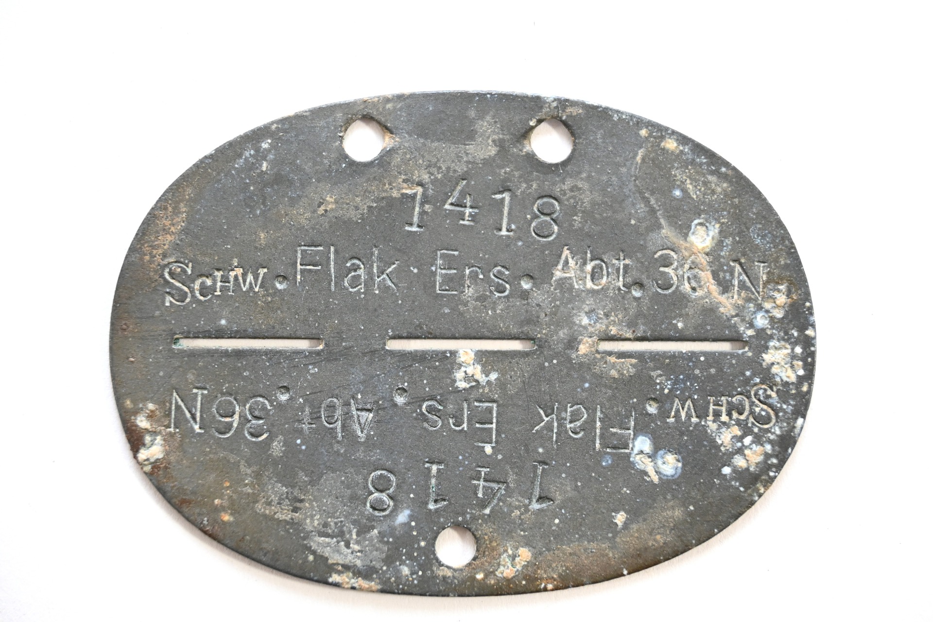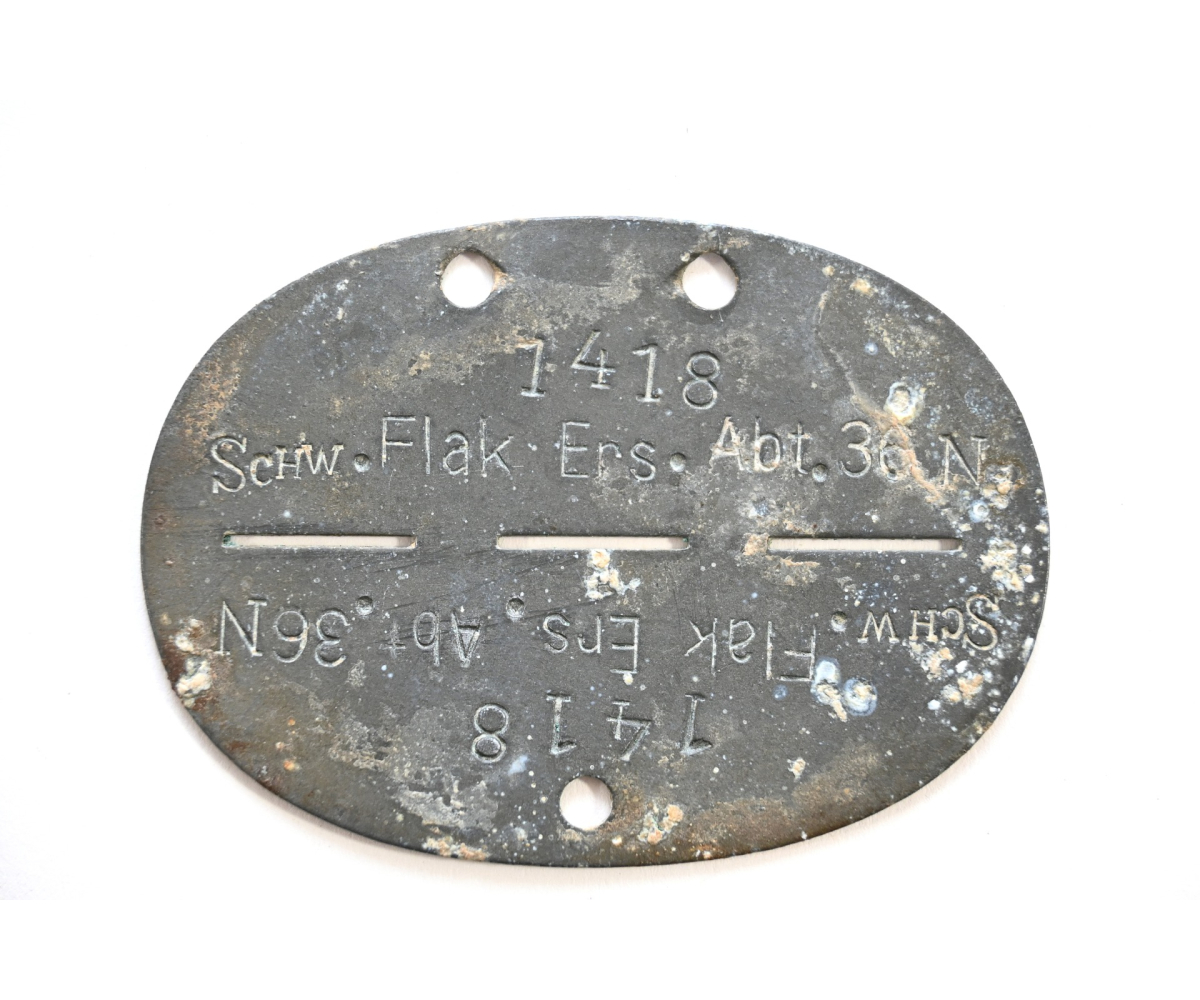The tag or 'Erkennungsmarke' shows overall normal signs of wear. It belonged to a soldier who served in a batterie of schwere Flak Ersatz Abteilung 36N. This unit was formed in late August 1939 in Wolfenbüttel. In 1941 it was converted to a heavy (Schwere) Flak unit. In 1944 the unit was enlarged to a total of 8.batteries.