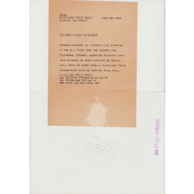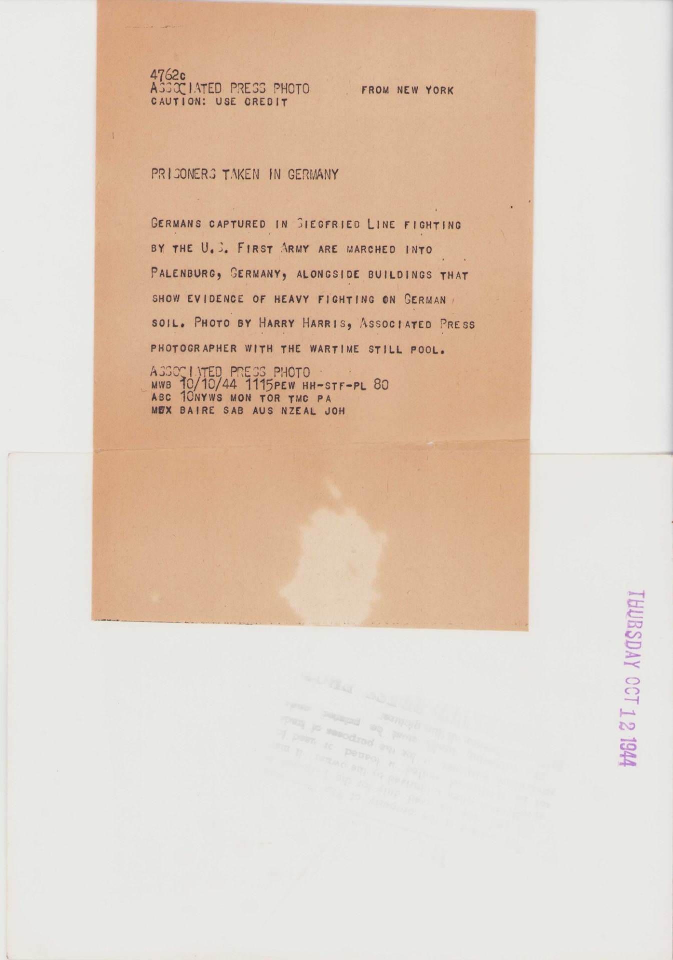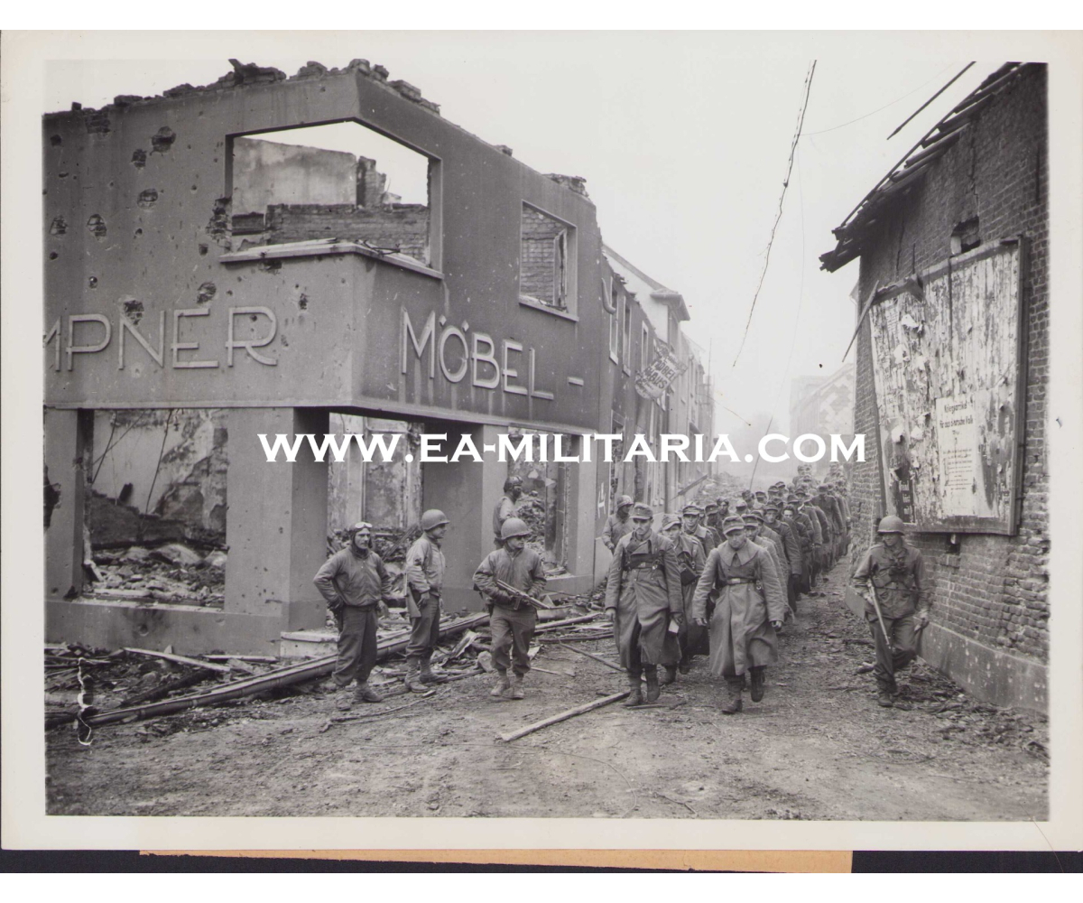 The photograph shows overall normal signs of storage wear. Complete with paper caption on the back which reads 'German captured in the Siegfried line fighting by the U.S. First Army are marching into Palenburg'.