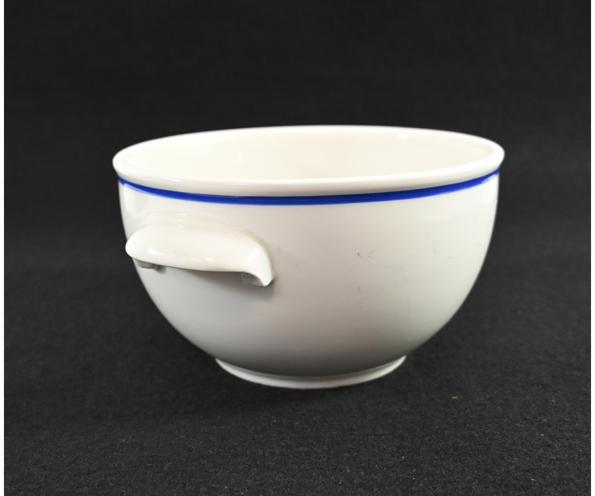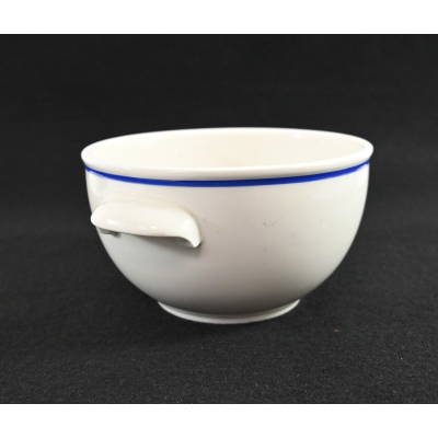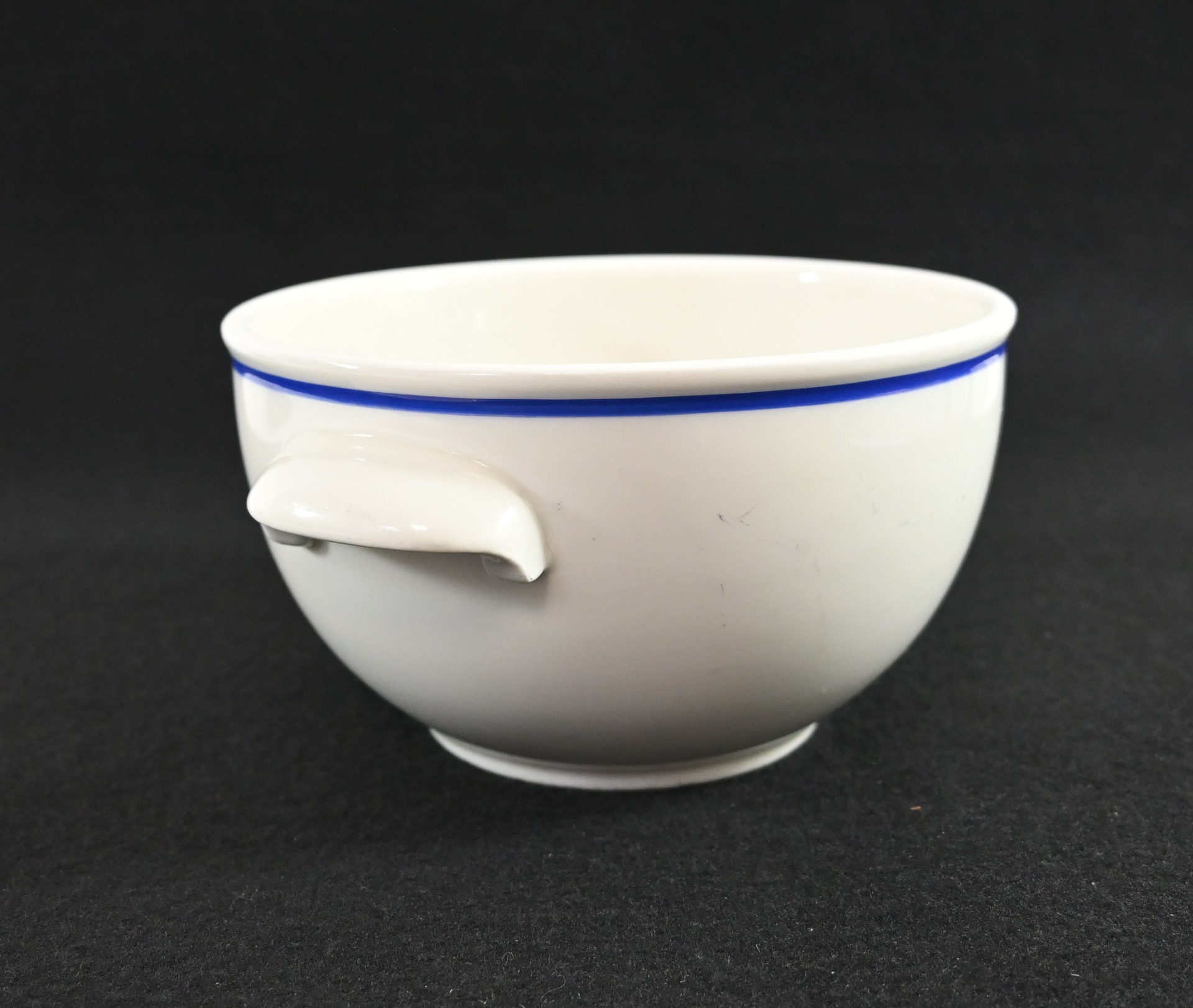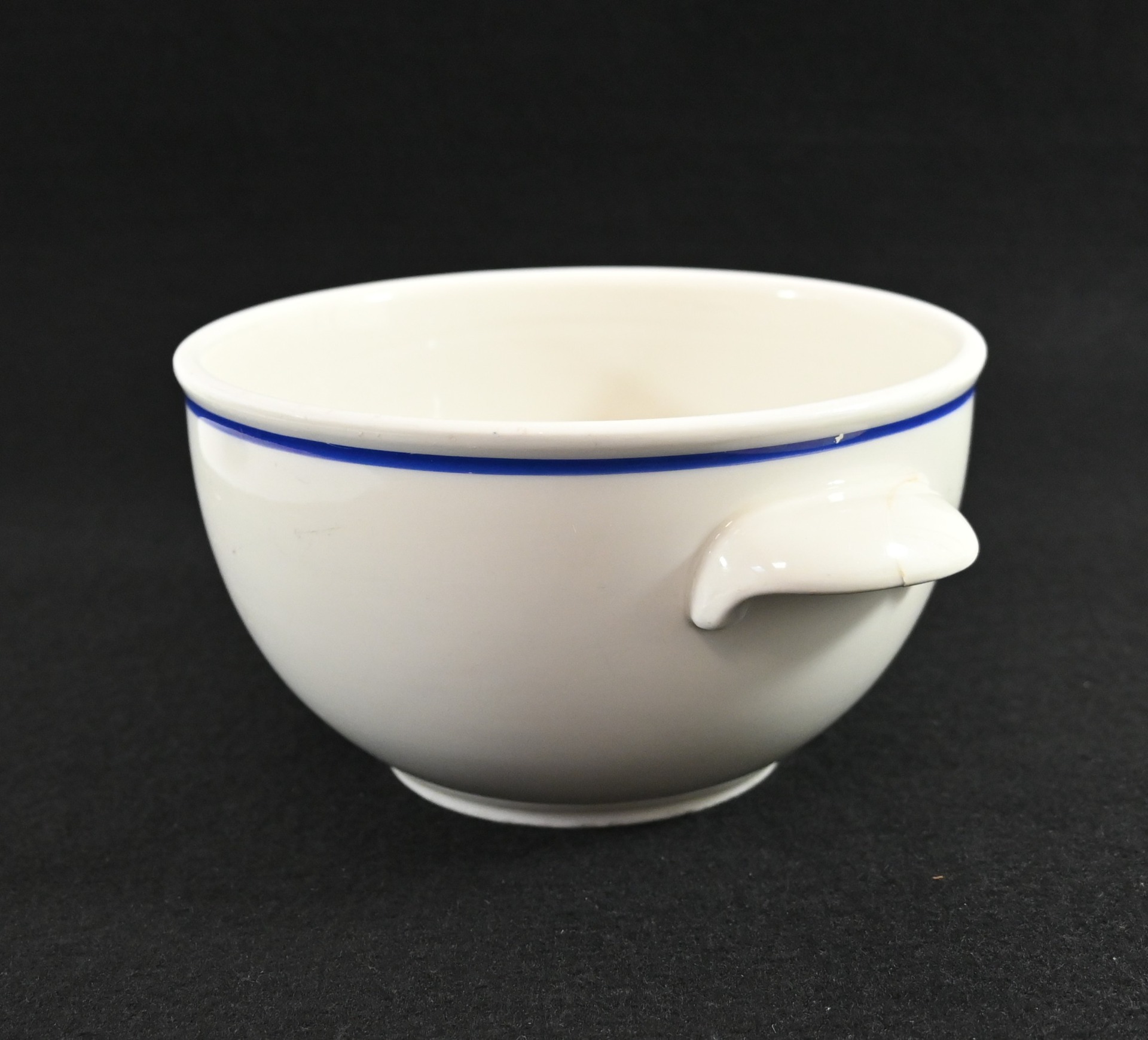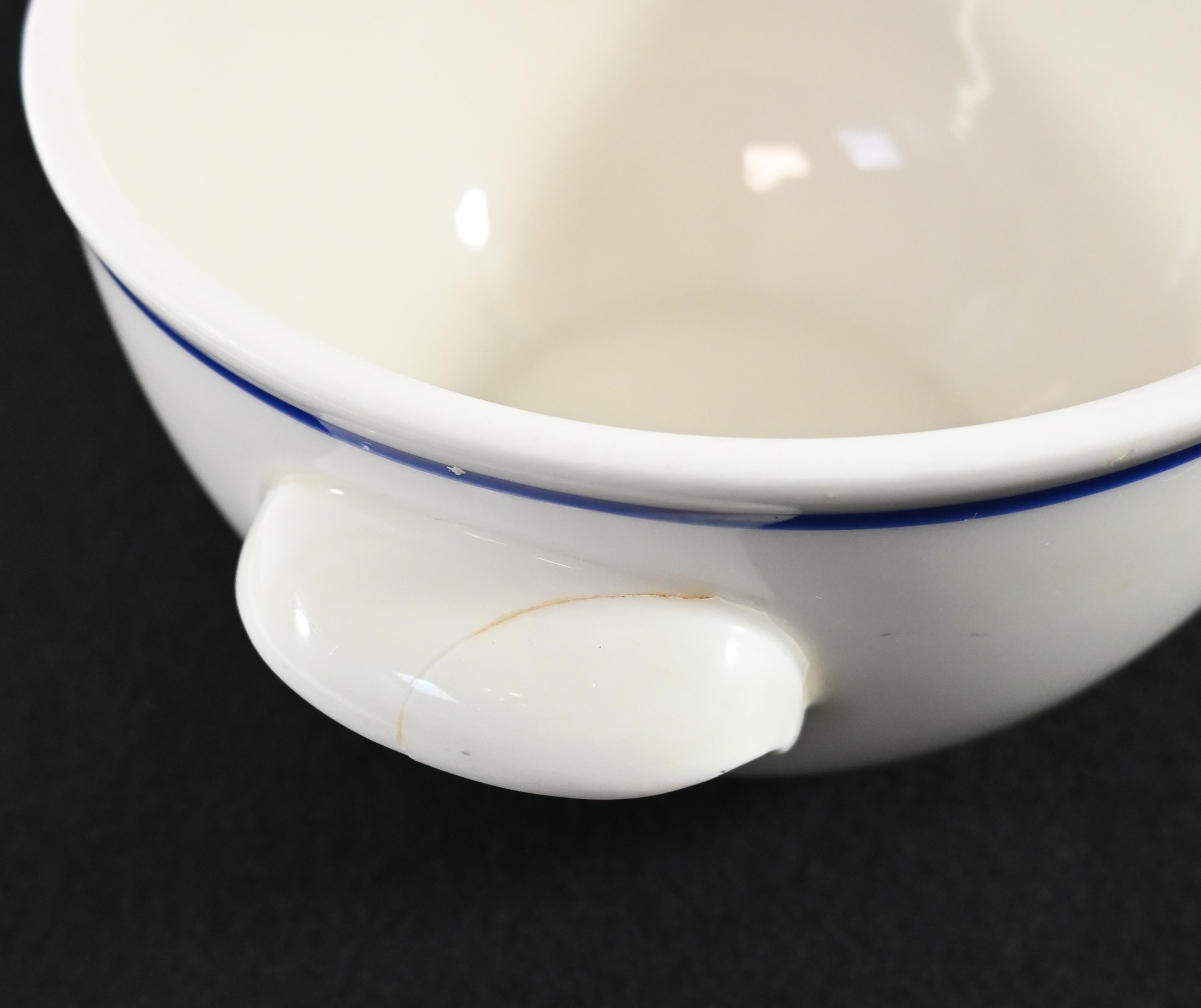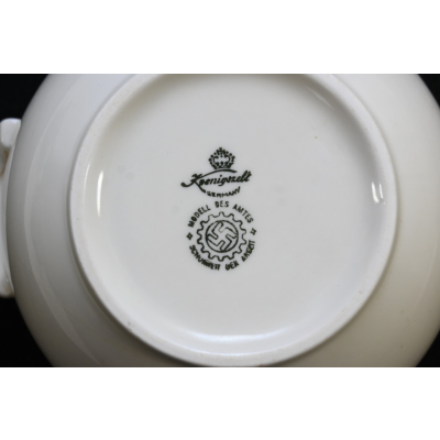 The soup serving tureen shows overall signs of wear. On of the ears/handles have been repaired at some point. Everything is solid. Nicely marked on the bottom with the 'Modell des Amtes' marking.