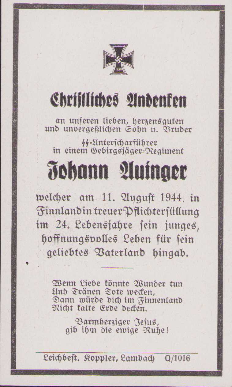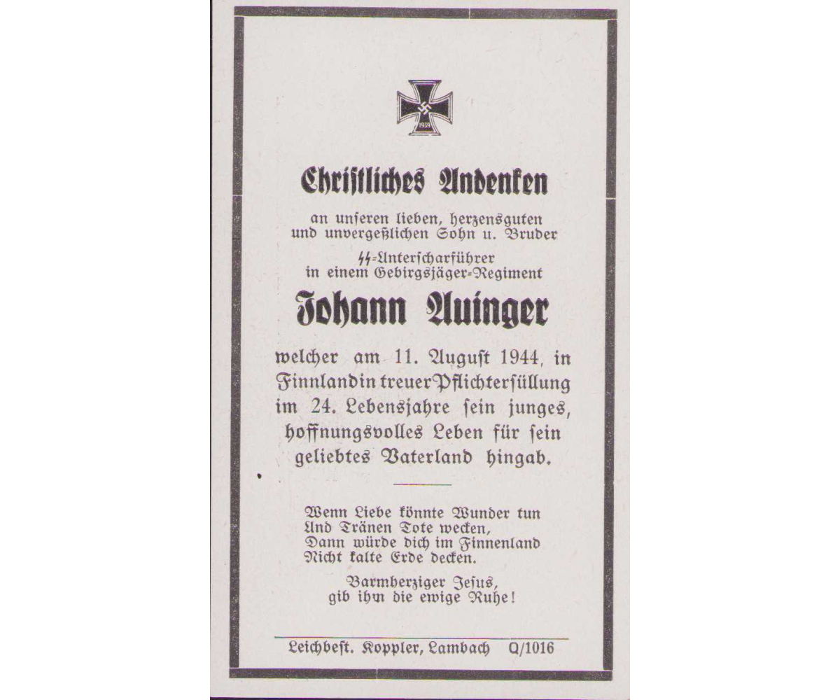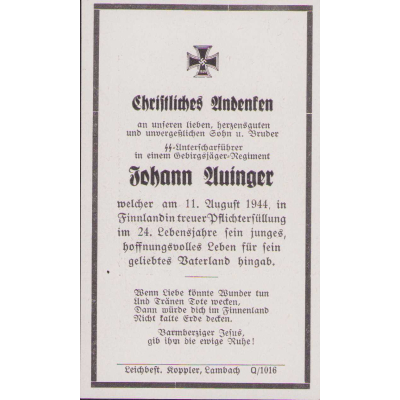 The card shows signs normal of wear. Johann Auinger was a Unterscharführer. He died 25km nord of Kiestinki in SS-Lazarett Schaarisee. He lies on the war cemetery of Salla.
