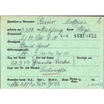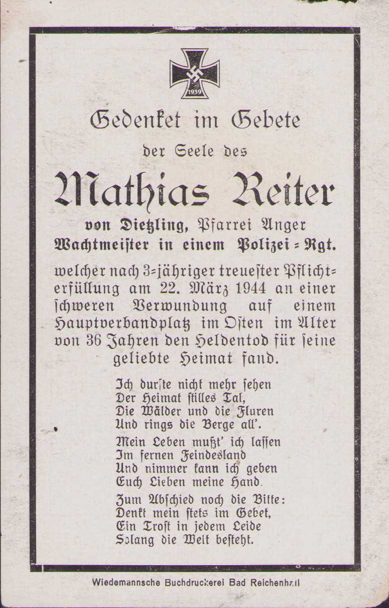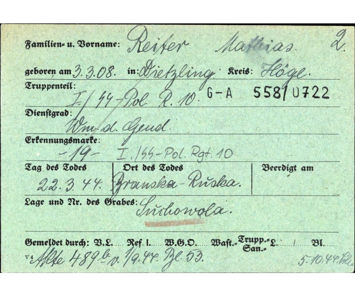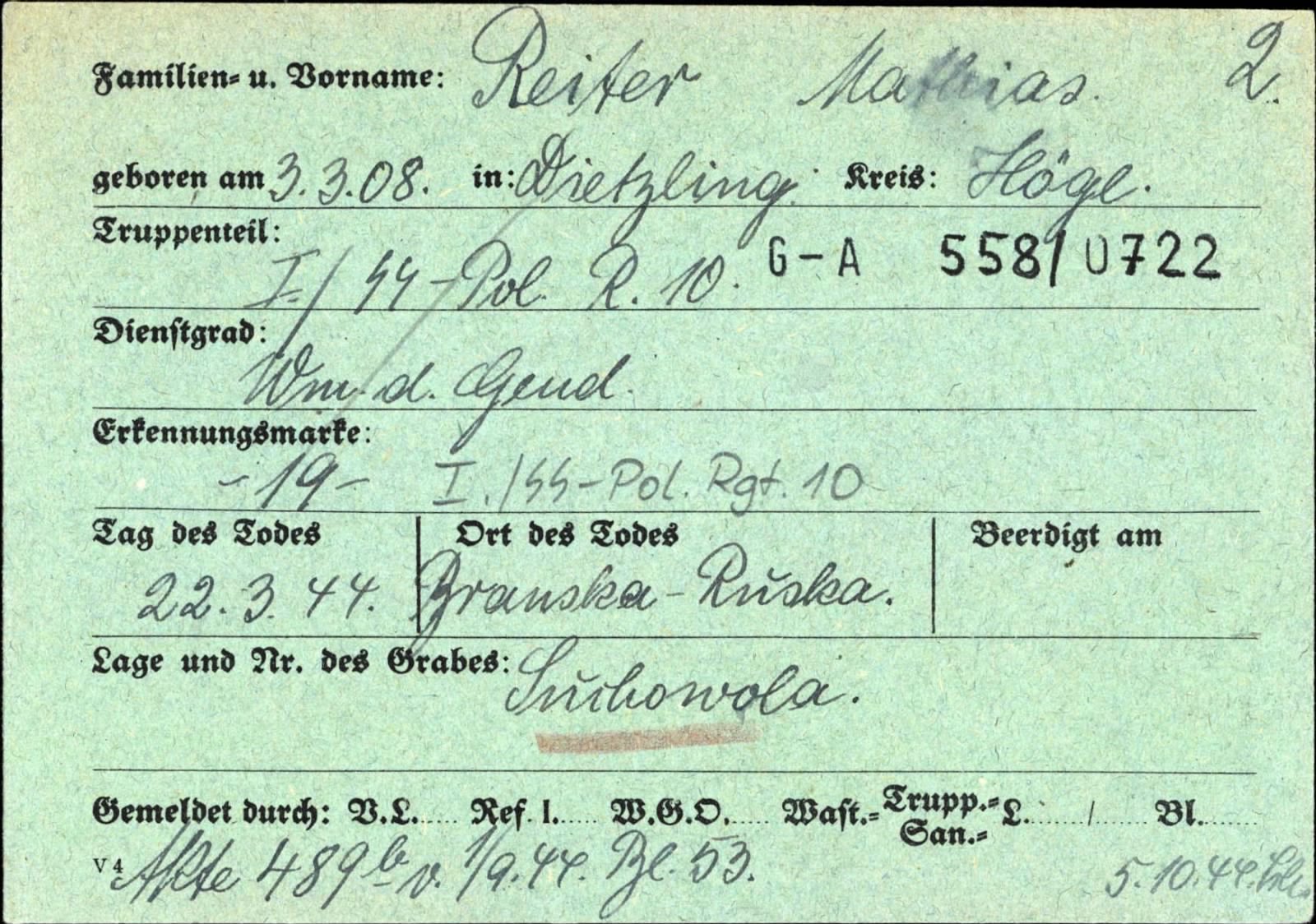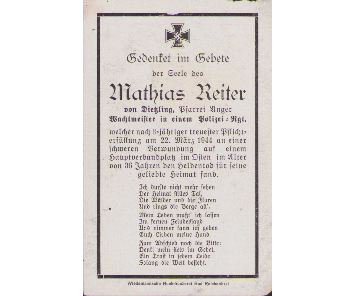 Death notice of Mathias Reiter who died in March 1944 in the area of Branska-Ruska.