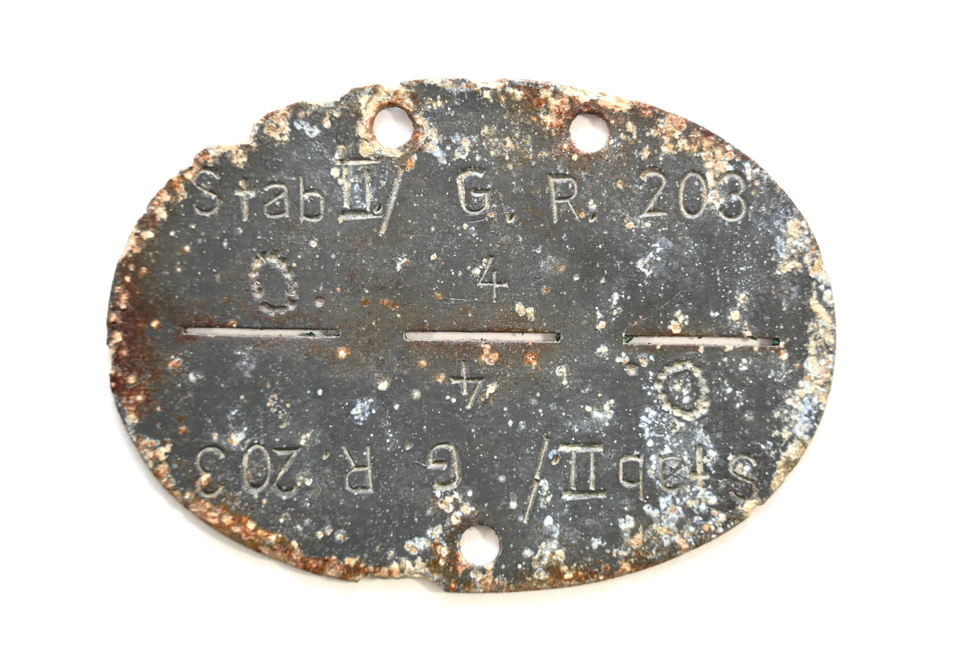 The tag shows overall signs of wear, however it's solid. It belonged to a nco/co who served in the Stab.II.Bataillon Grenadier Regiment 203. The regiment was formed in October 1942 from Infanterie Regiment 203 and was part of the 76.Infanterie-Division. In February 1943 the regiment was destroyed in Stalingrad.