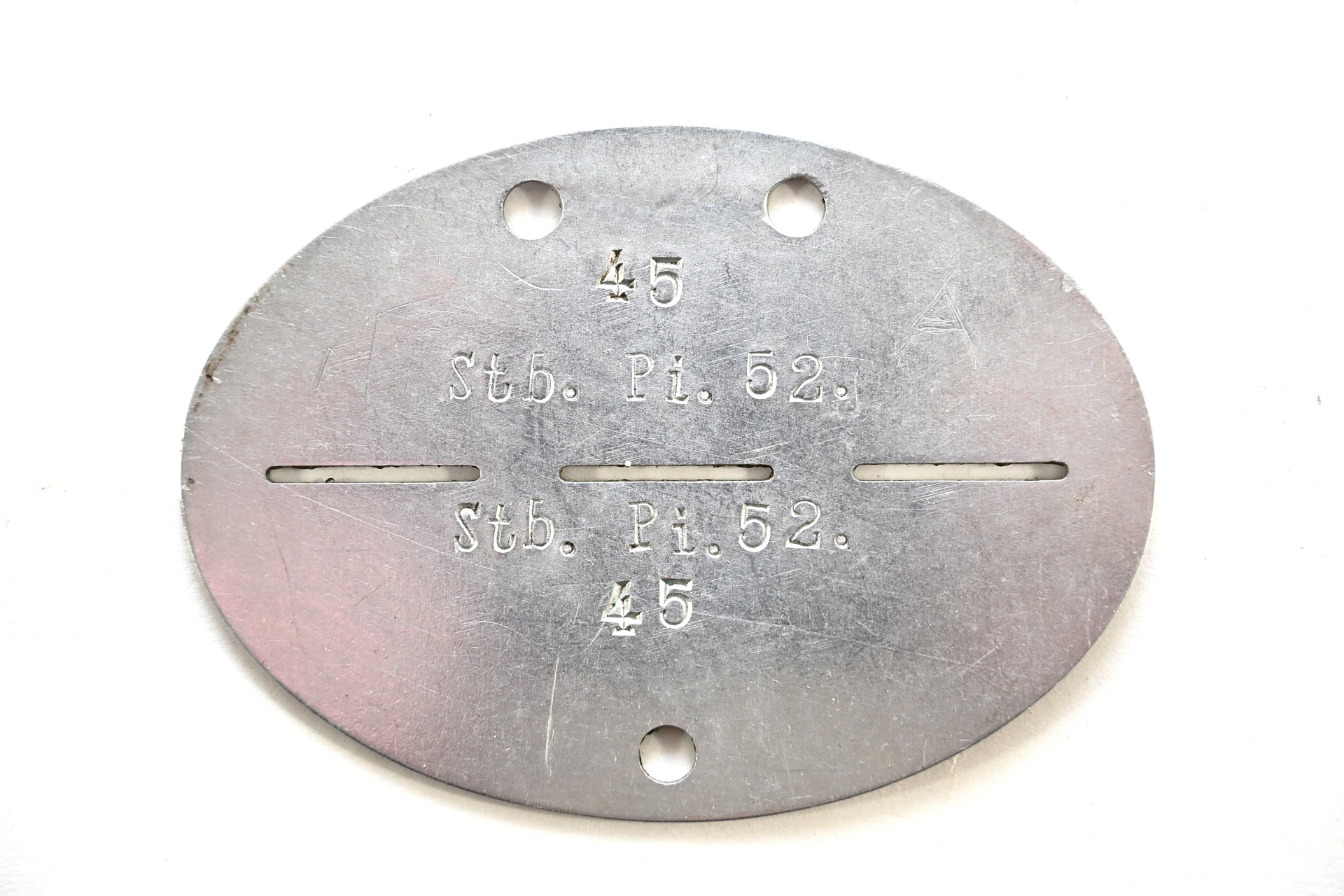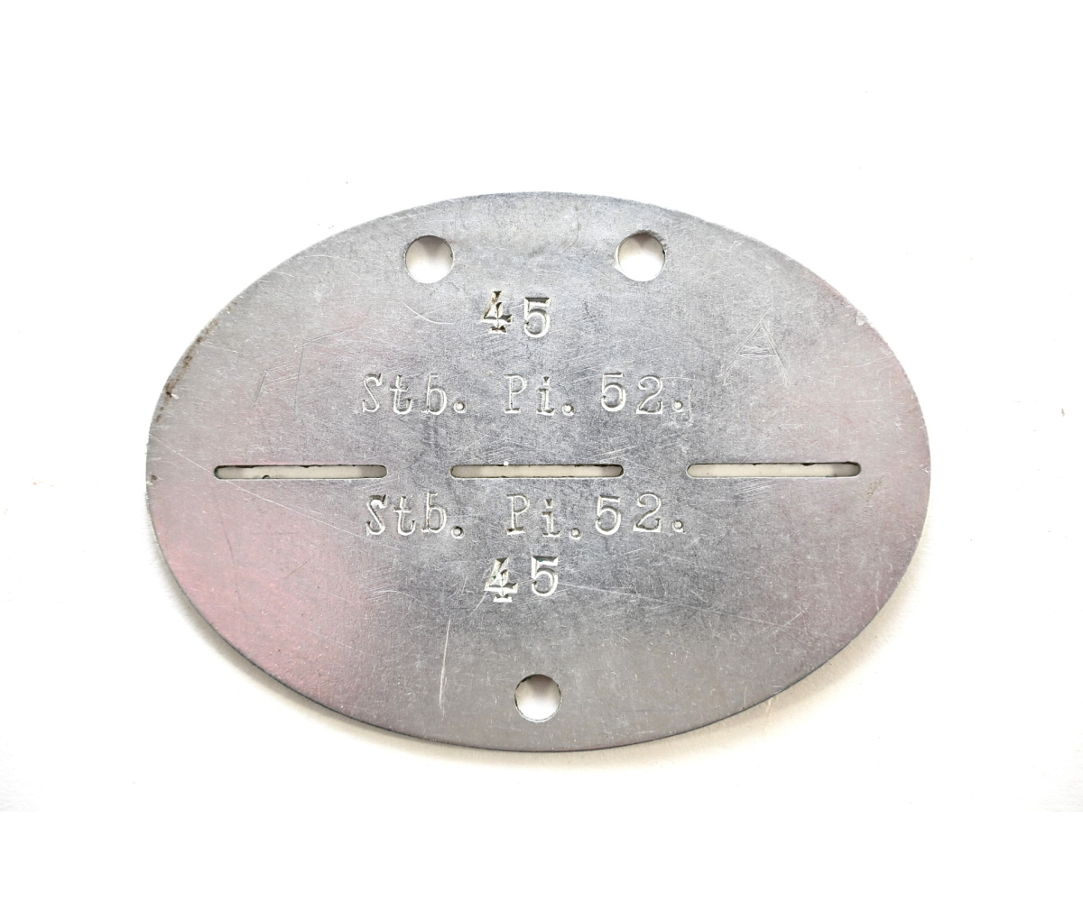 The tag or 'Erkennungsmarke' shows overall normal signs of wear. It belonged to a NCO or CO who served in the Stab Pionier Bataillon 52. This bataillon was formed in October 1936. In 1939 the bataillon became part of the Armeetruppe "K" and was stationed in the Mittelrhein area. In 1940 it participated in the invasion of France and in the summer of 1941 it operated in Southern Russia in areas like Donez, Stalino, Charkow. During the retreat of the Germany army it also operated in Hungary and at last in Slowakia.