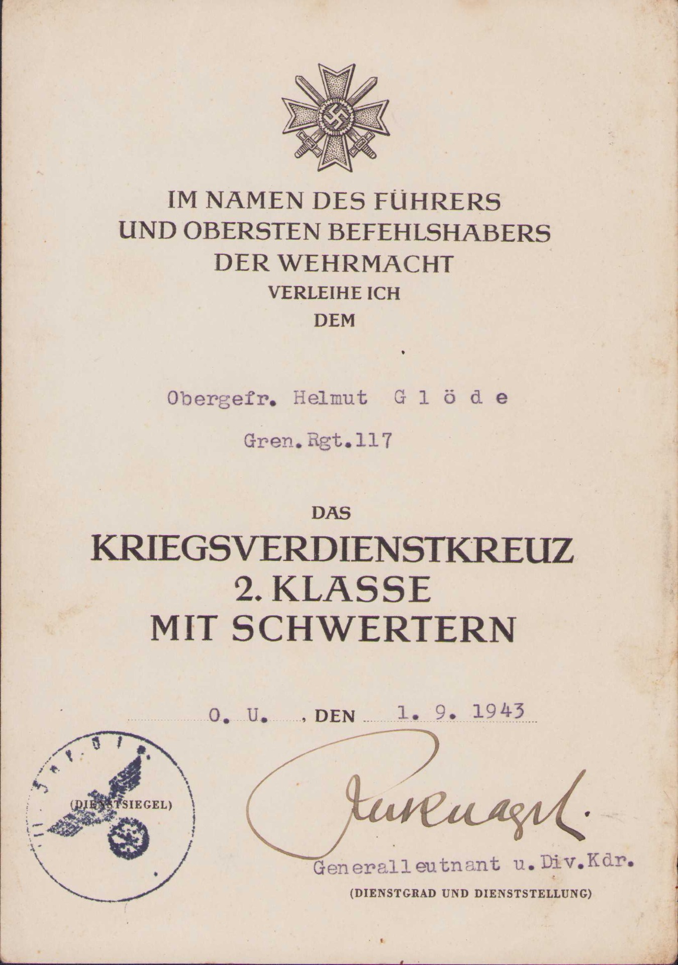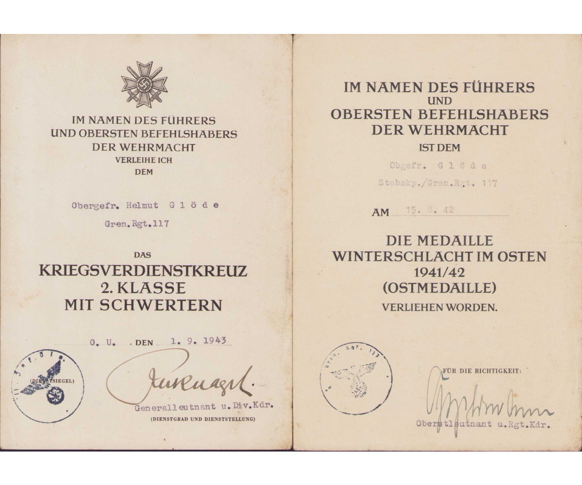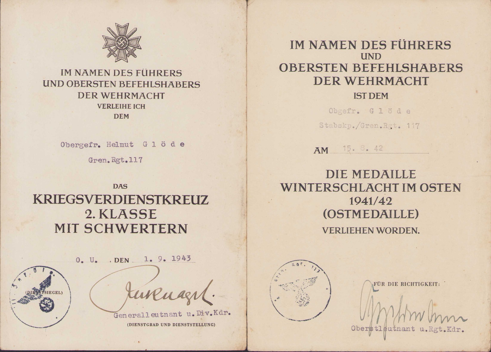 Both documents show overall normal signs of wear. They belonged to Obergefreiten Helmut Glöde who served in the Stabskompanie Grenadier Regiment 117. This regiment was formed in November 1940 and was part of the 111.Infanterie-Division. It saw its first combat during the invasion of Russia.