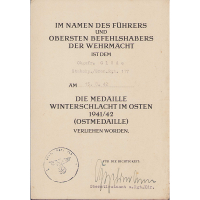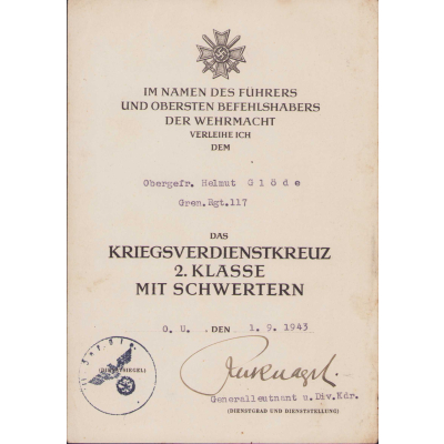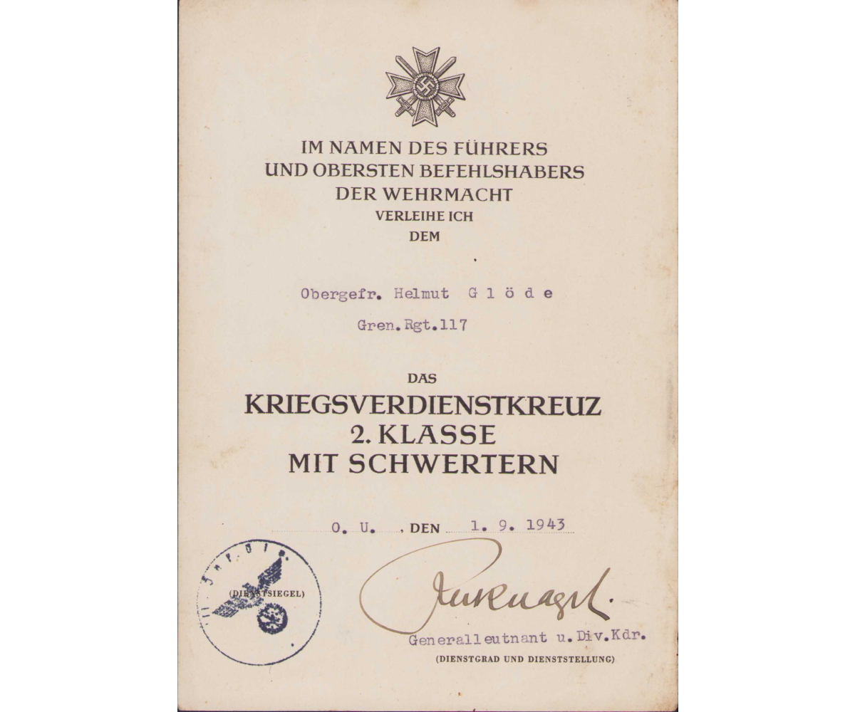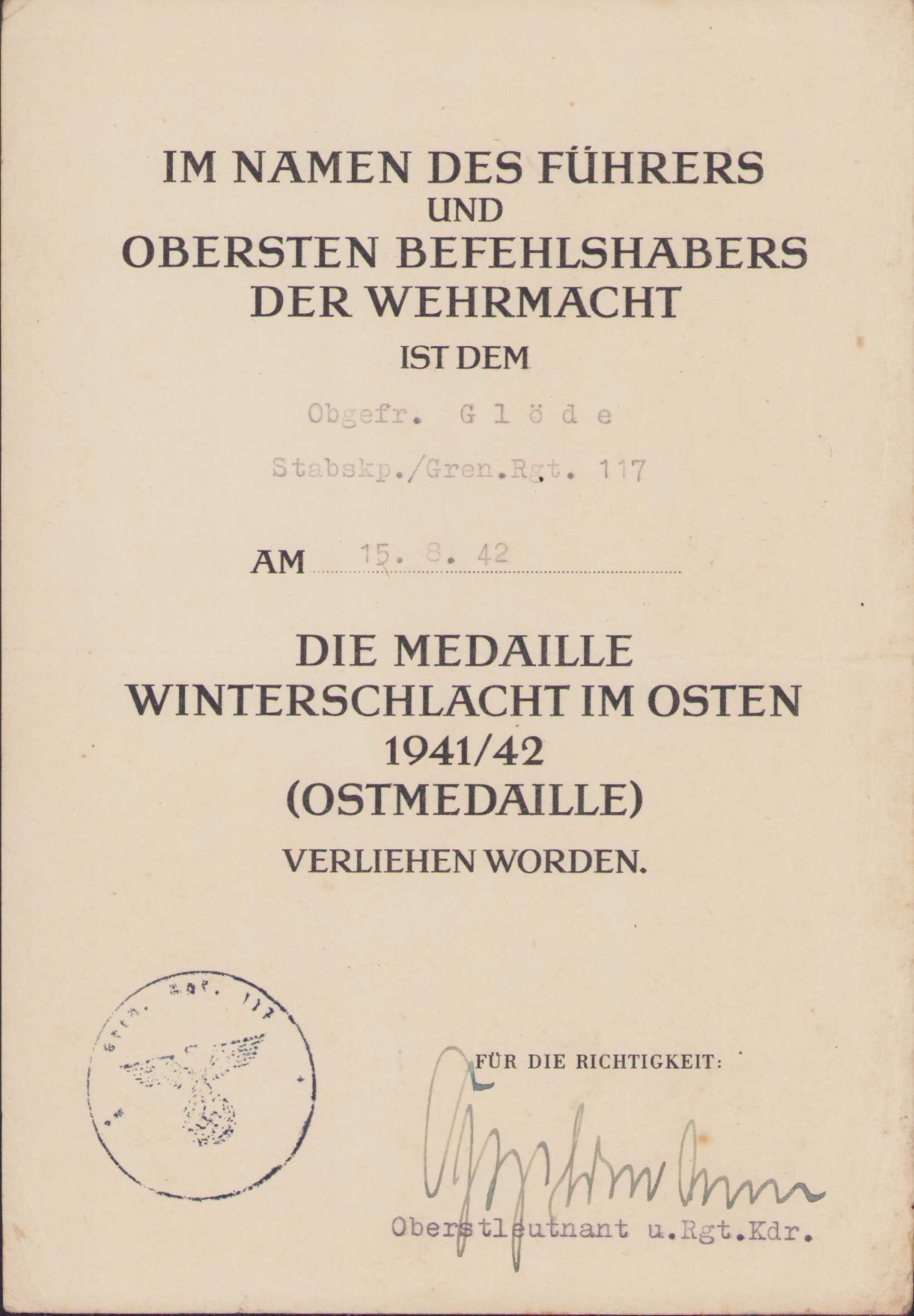 Both documents show overall normal signs of wear. They belonged to Obergefreiten Helmut Glöde who served in the Stabskompanie Grenadier Regiment 117. This regiment was formed in November 1940 and was part of the 111.Infanterie-Division. It saw its first combat during the invasion of Russia.