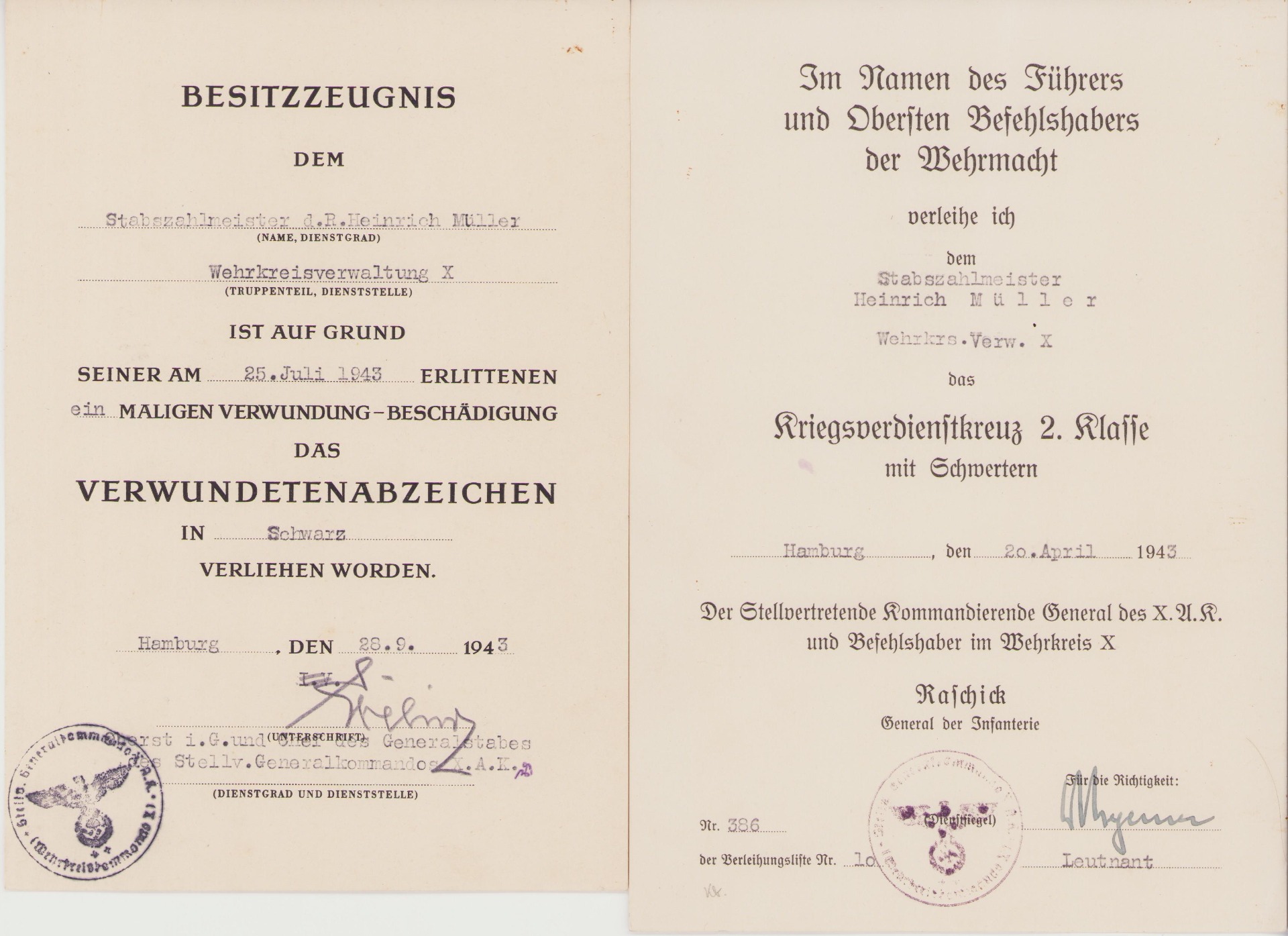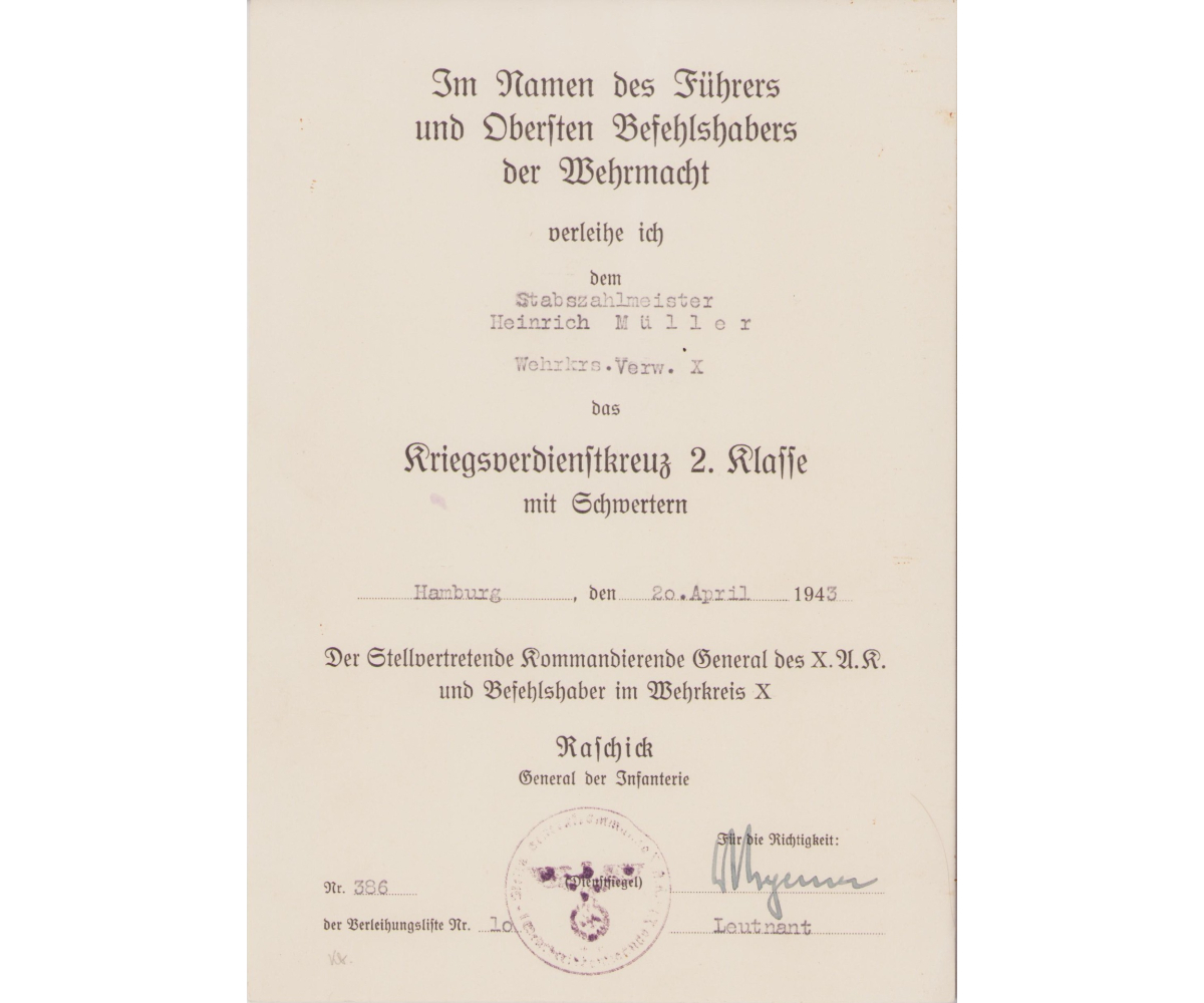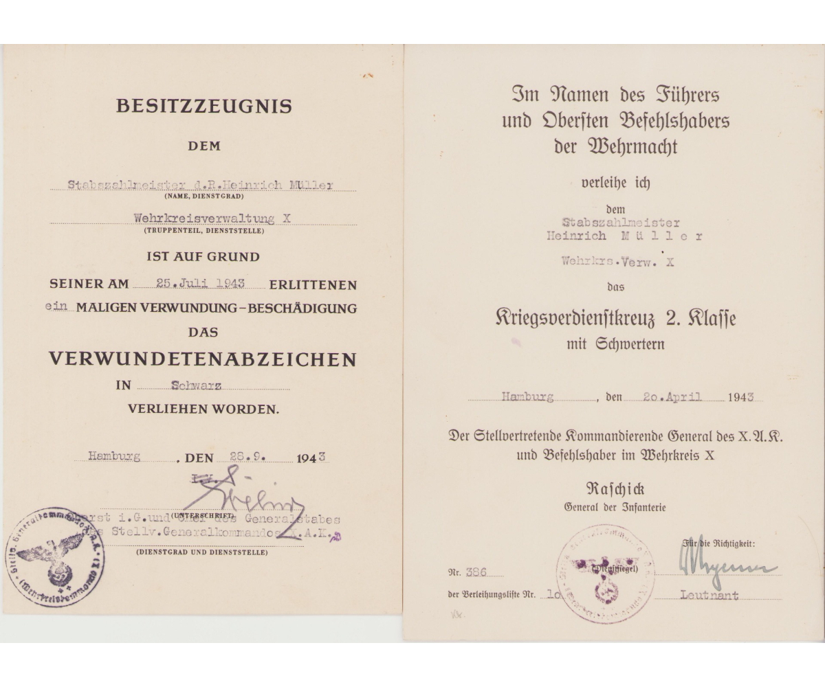 The set shows overall normal signs of wear. They are named to Stabszahlmeister Heinrich Müller who served within the Wehrkreisverwaltung X.
