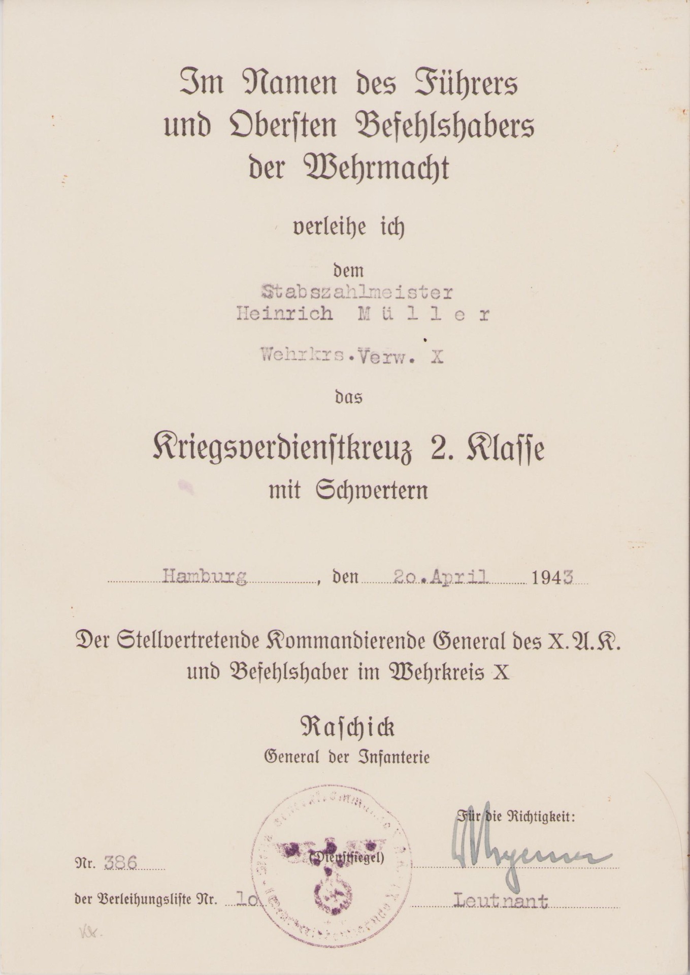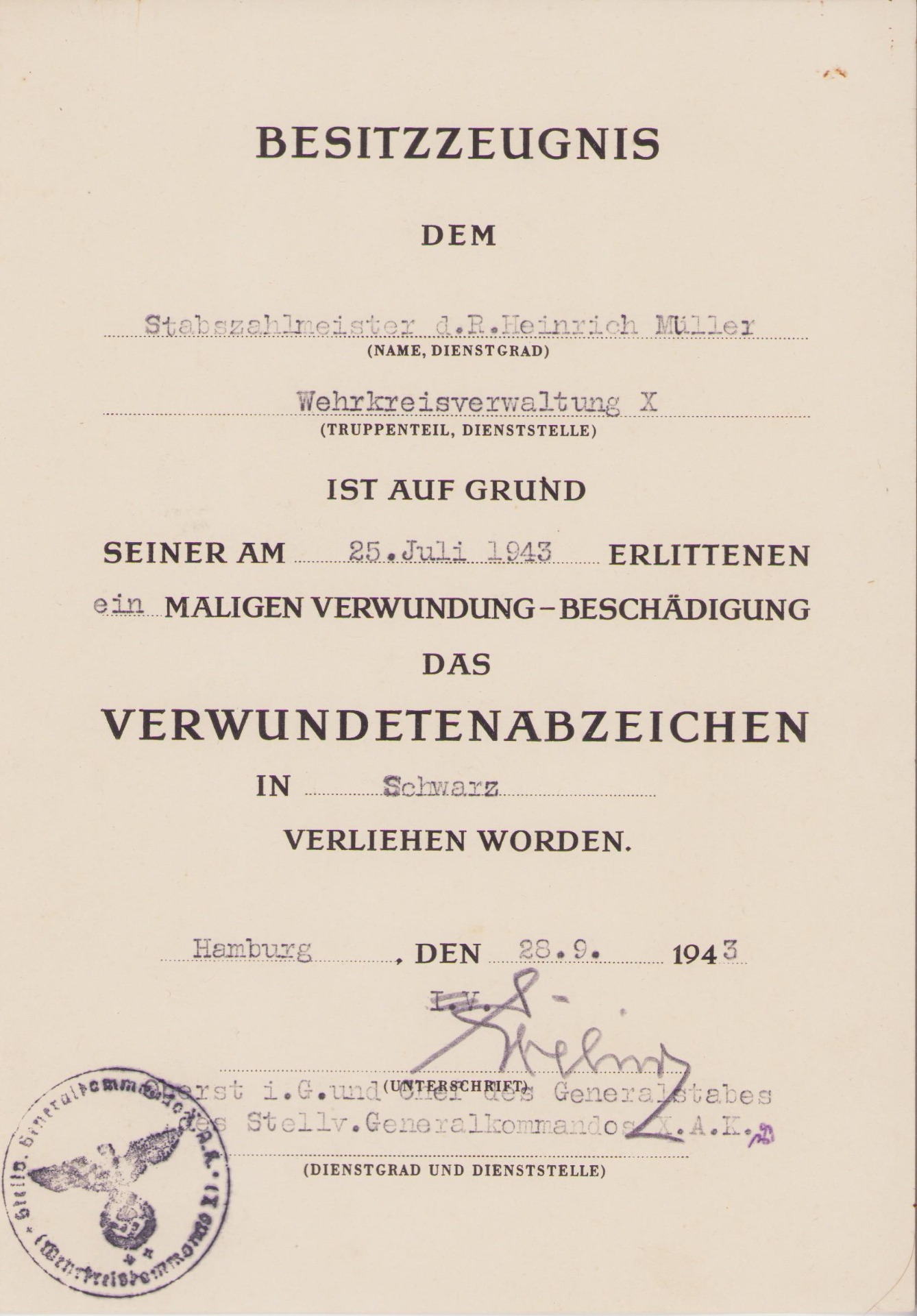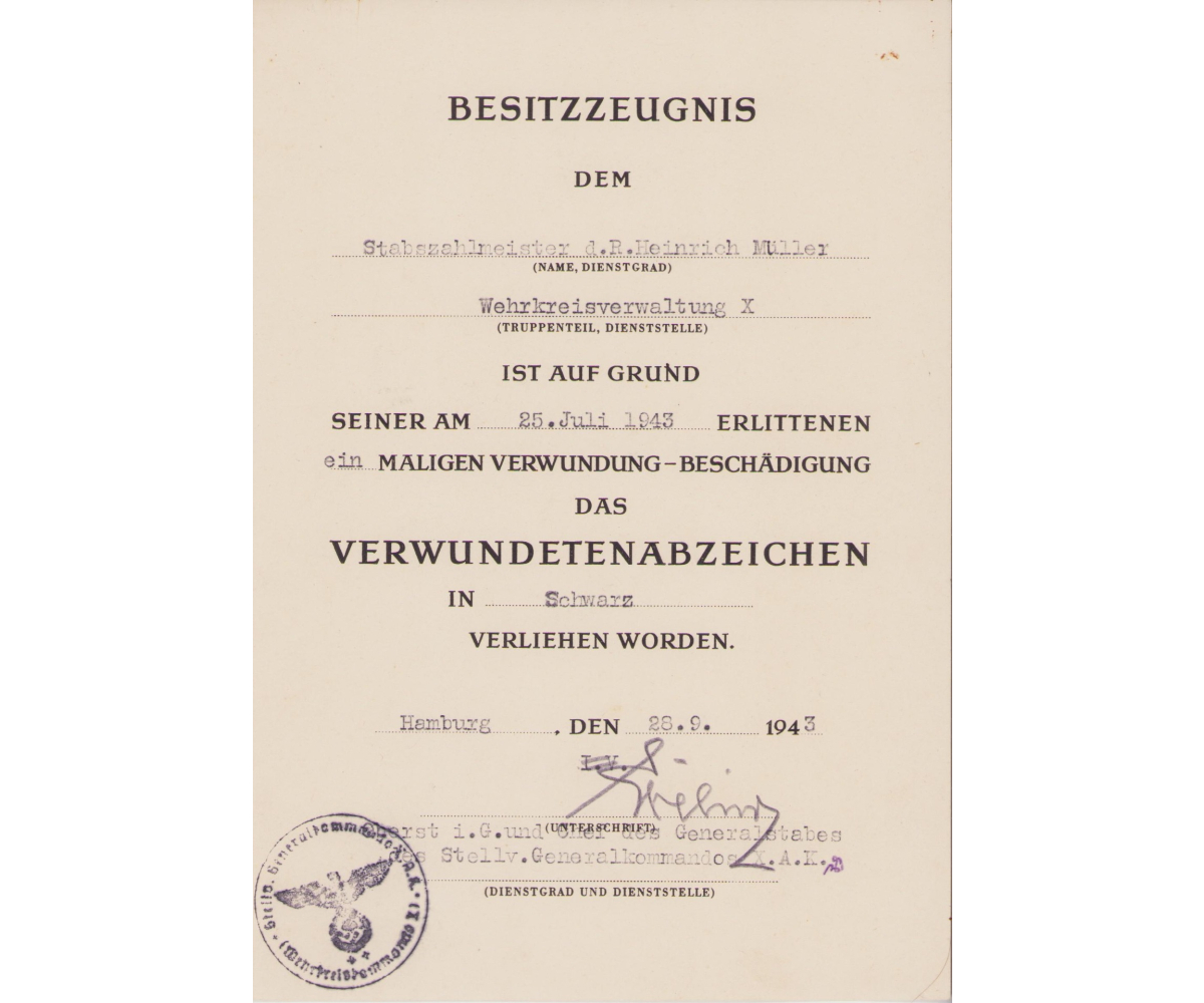 The set shows overall normal signs of wear. They are named to Stabszahlmeister Heinrich Müller who served within the Wehrkreisverwaltung X.