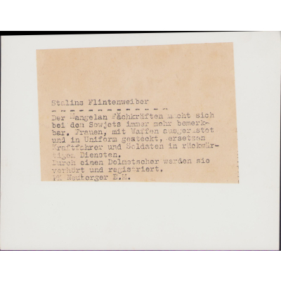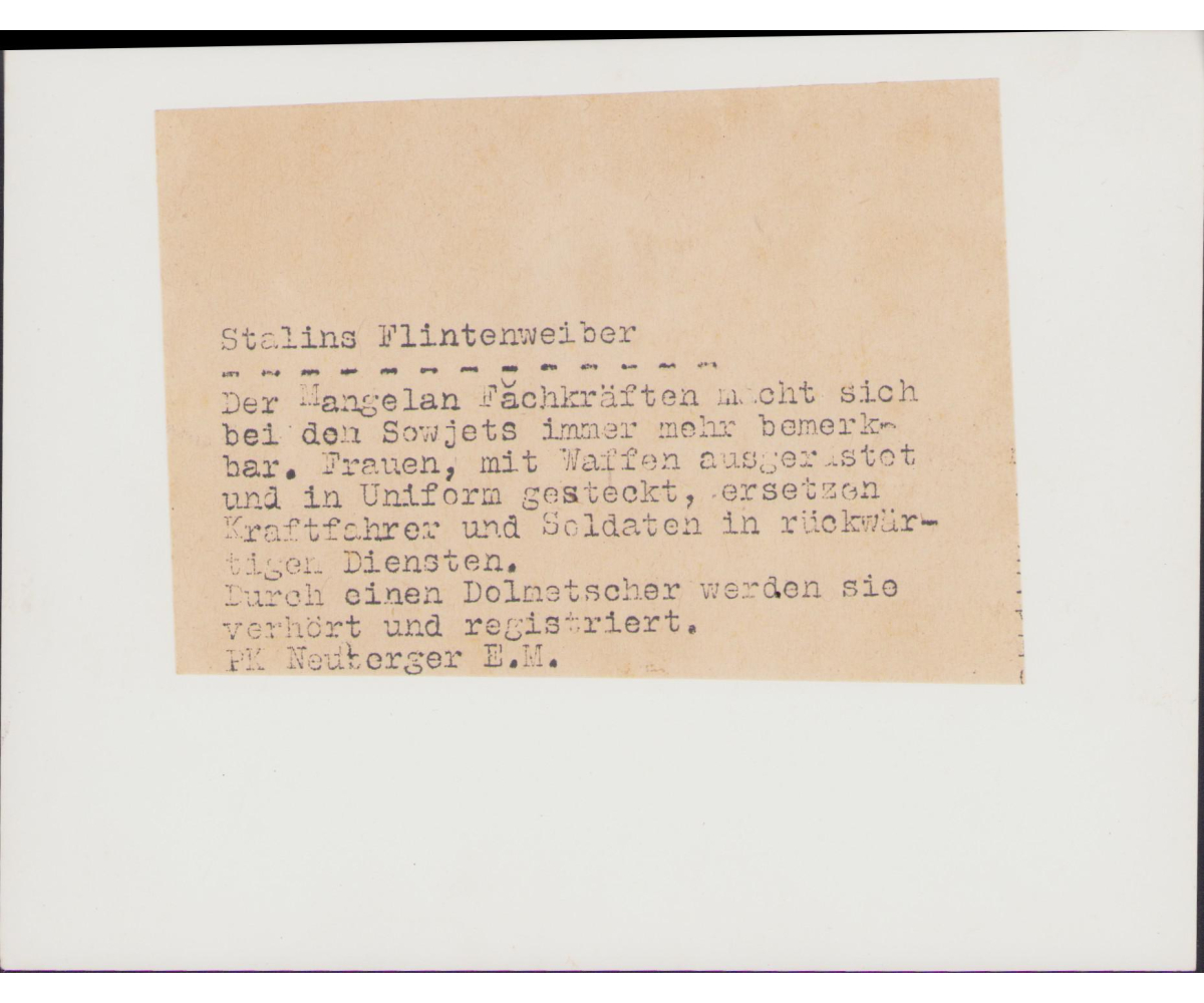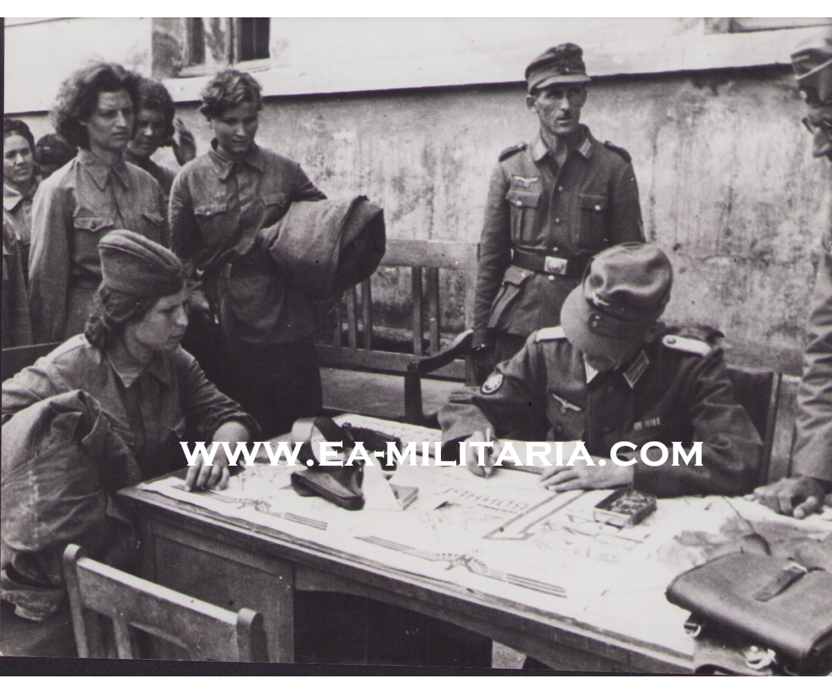 The photograph shows overall normal signs of storage wear. It's complete with paper caption on the back. Here a Gebirgsjäger registers a group of Russian women soldiers.