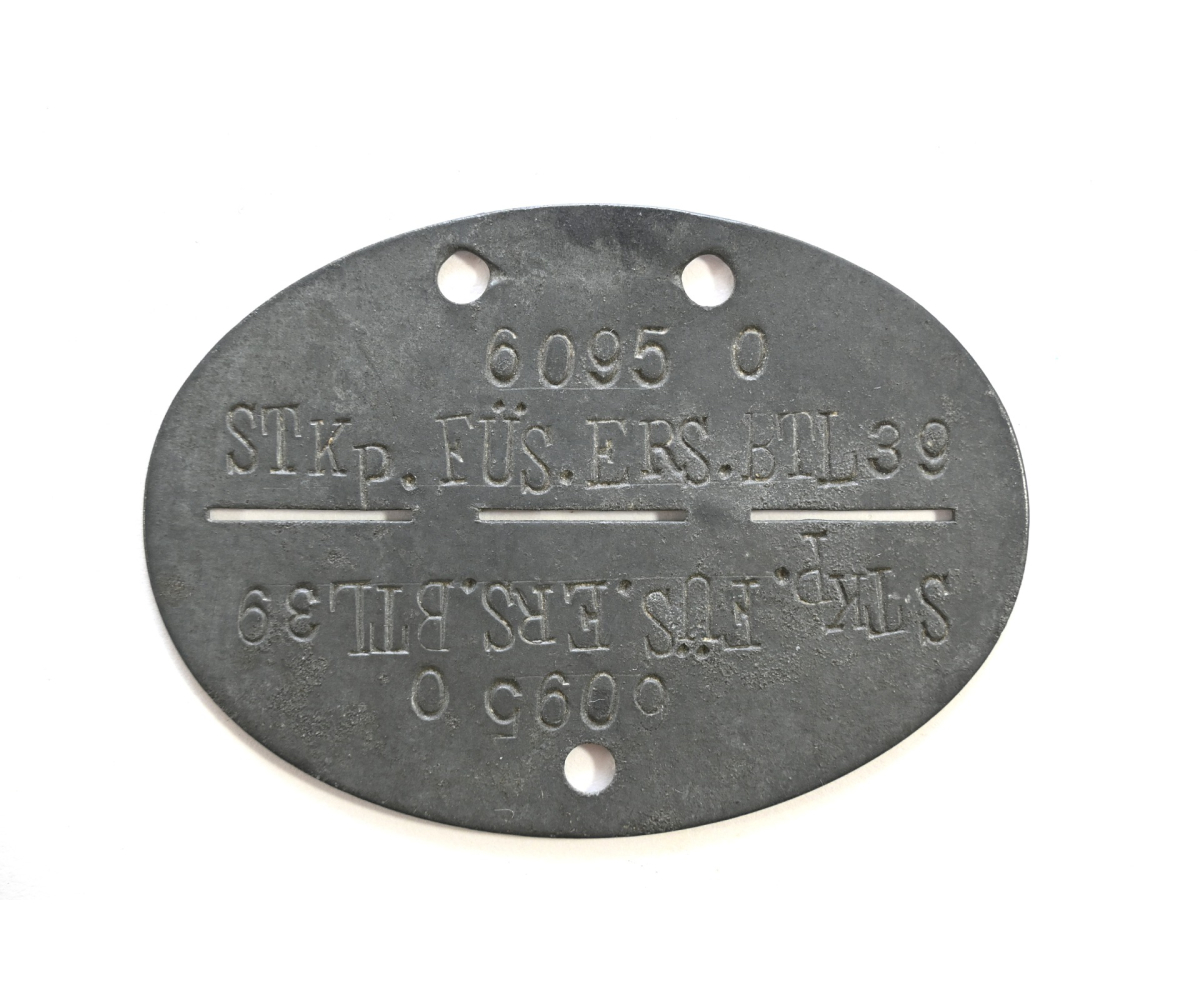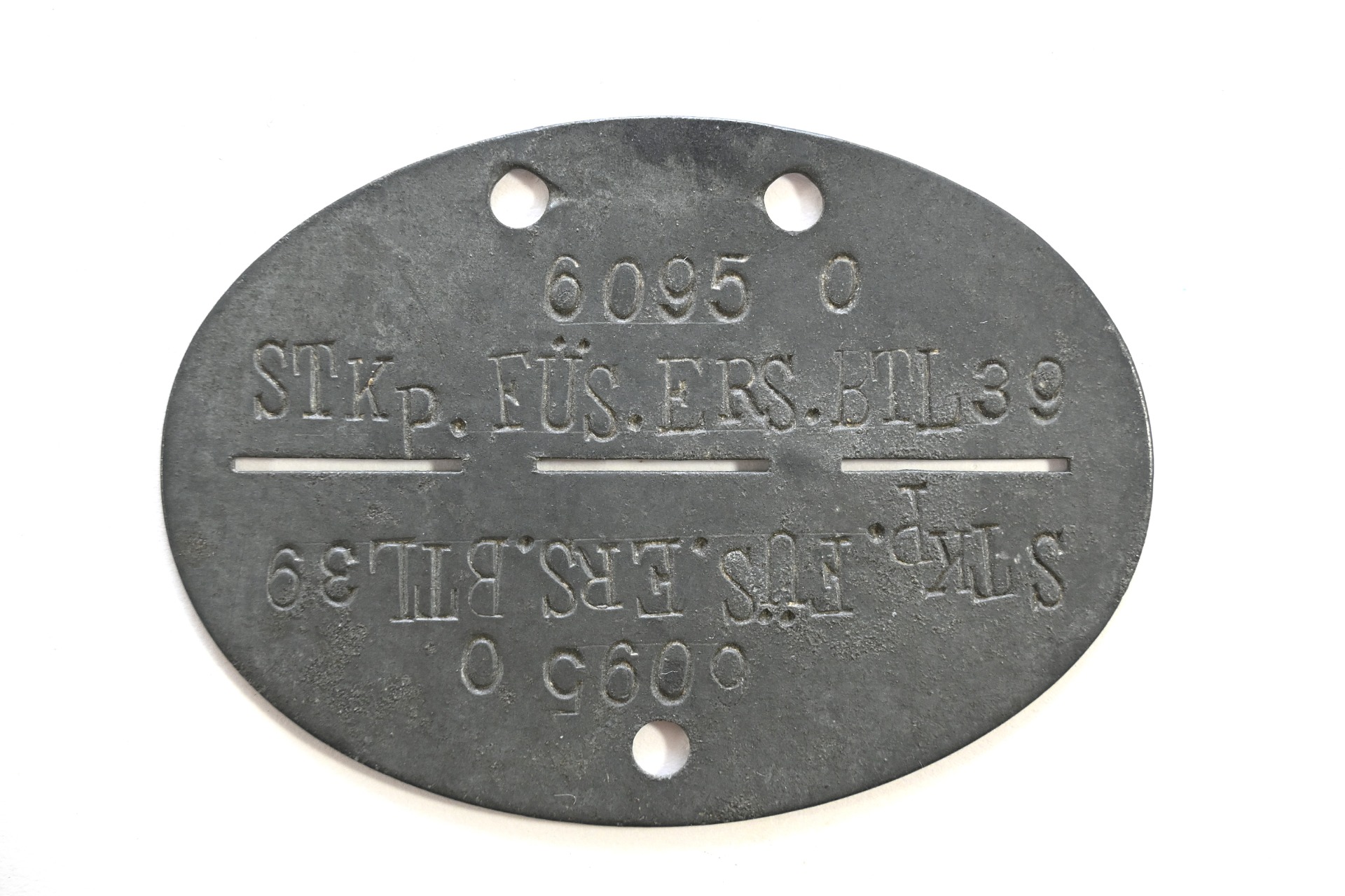 The tag shows overall normal signs of wear. It belonged to a soldier who served/was drafted in the Stammkompanie Füsilier Ersatz Bataillon 39. This bataillon was formed in August 1939 in Dusseldorf as Infanterie Ersatz Bataillon 39. It trained and supplied soldiers for Infanterie Regiment 39 which was part of the 26.Infanterie-Division. This division (and her units) saw combat during the invasion of Belgium, France and later in Russia. It fought in areas like Rshew, Donbogen, Kursk, Smolensk and Kowel. After the division was destroyed in the summer of 1944 in the area of Cholm the remains were used to form the 26.Volks-Grenadier-Division. This division was put into action during the Ardennes Offensive in late 1944 and early 1945.
