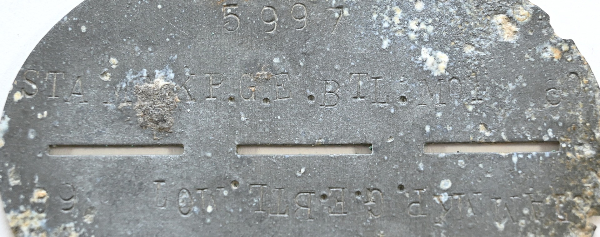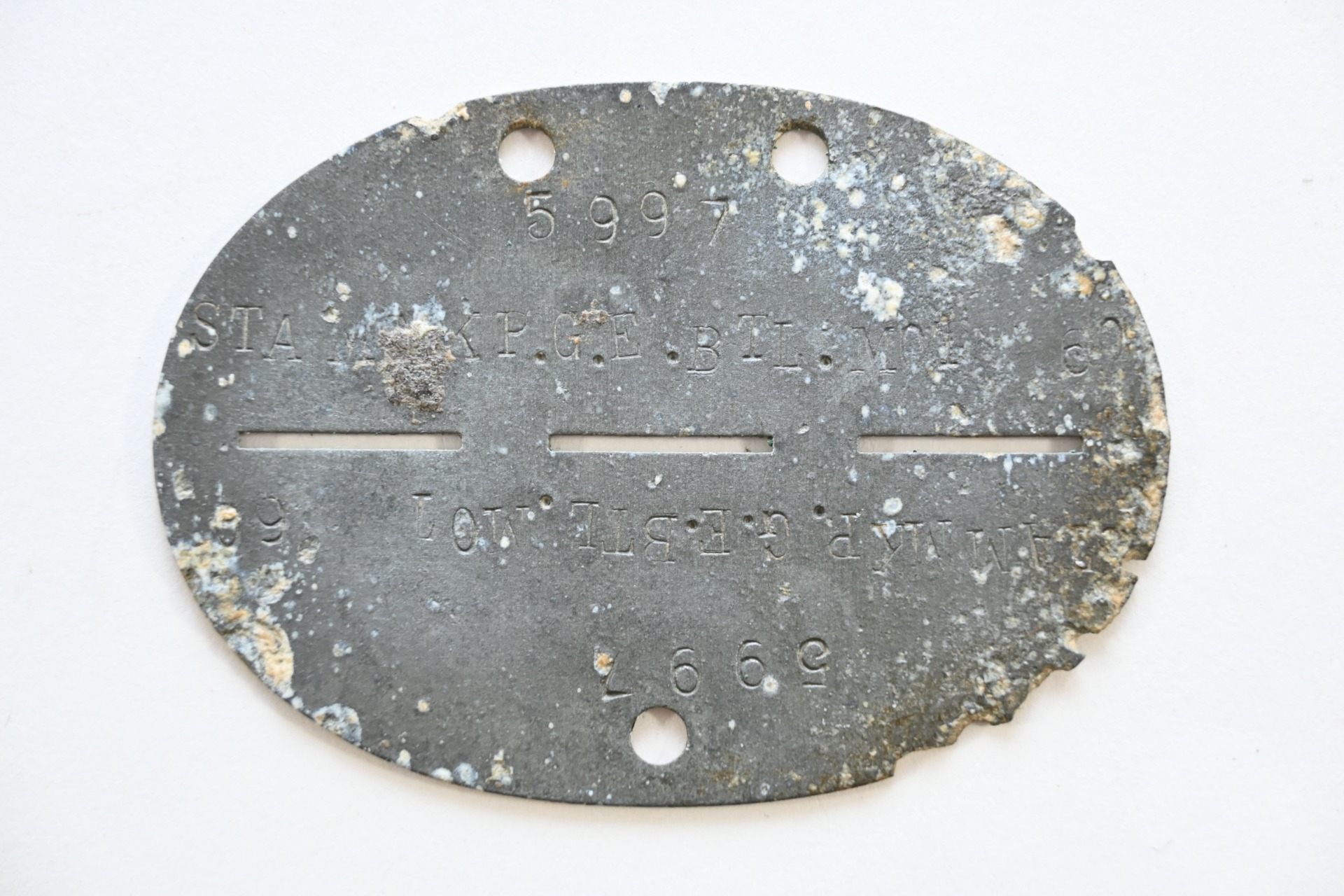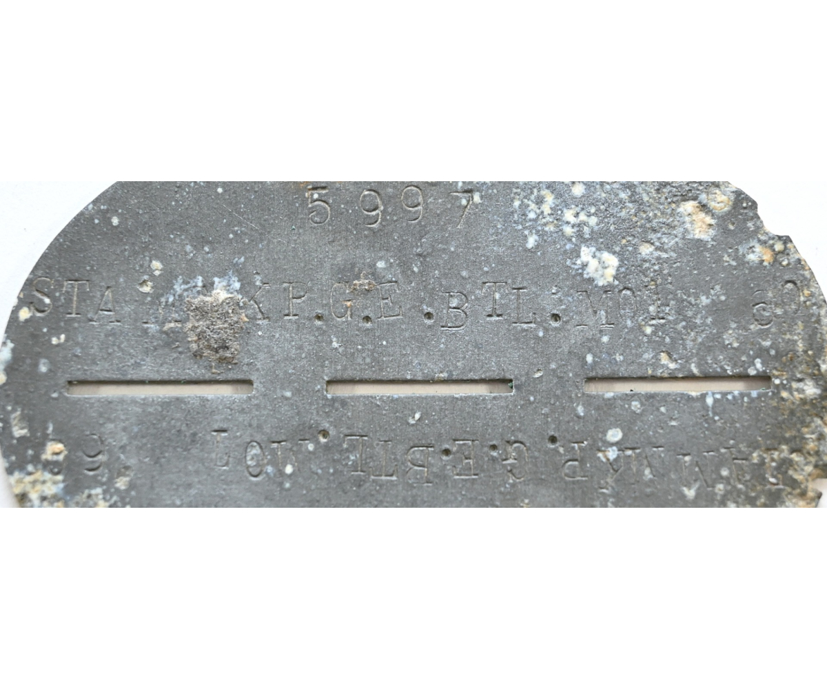 The tag or 'Erkennungsmarke' shows signs of wear. It belonged to a soldier who was drafted in the Stammkompanie Grenadier Ersatz Bataillon motorisiert 60. The bataillon was formed in August 1939 as Infanterie Ersatz Bataillon 60. In November 1942 it was renamed Grenadier Ersatz Bataillon (motorisiert) 60. Since the beginning the bataillon trained and supplied soldiers for the (Panzer)Grenadier Regiment 60. This regiment was part of the 16.Infanterie-Division which was also known as the 'Windhund Division'.