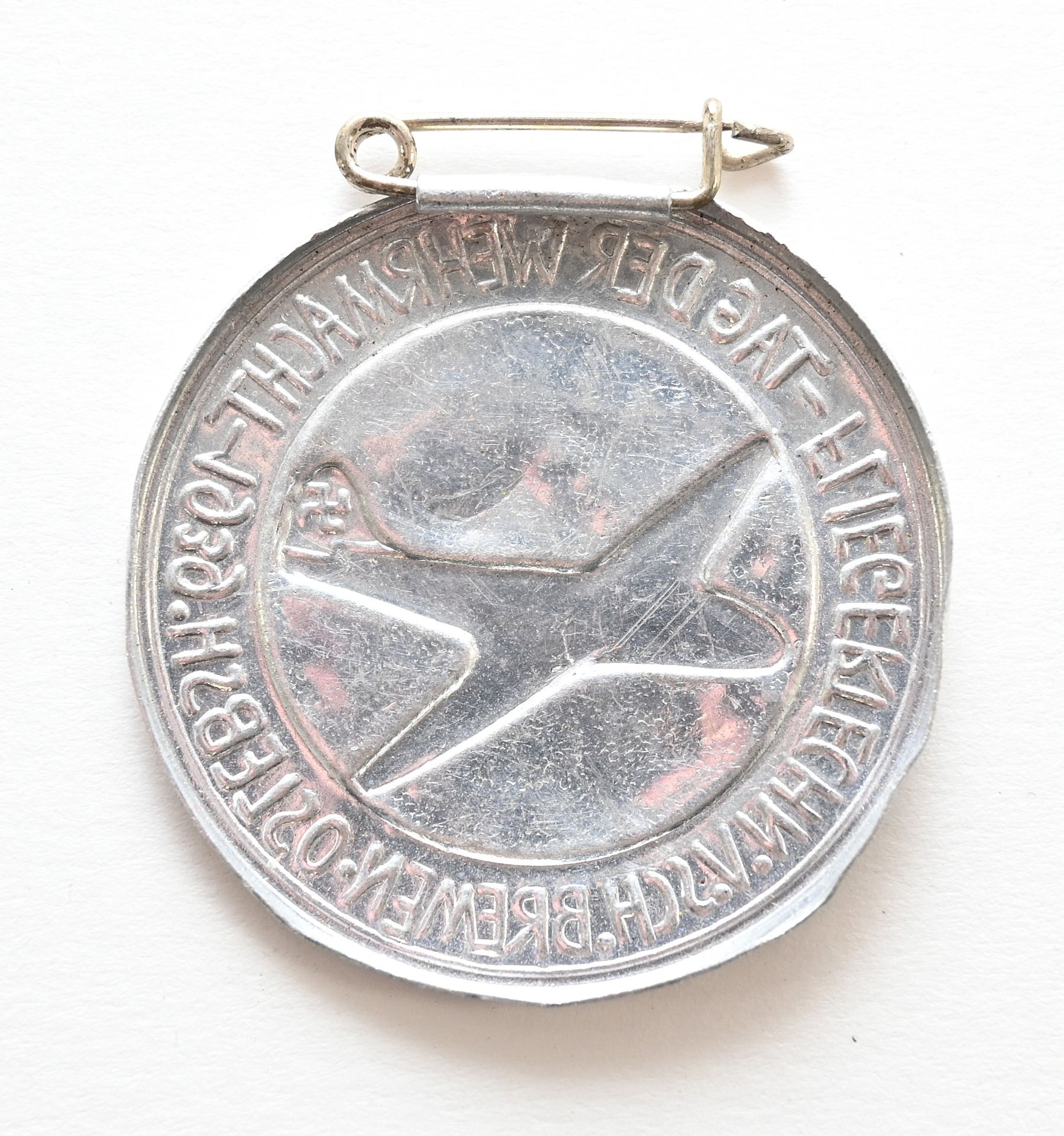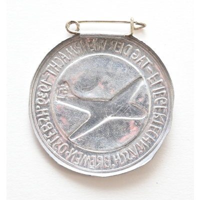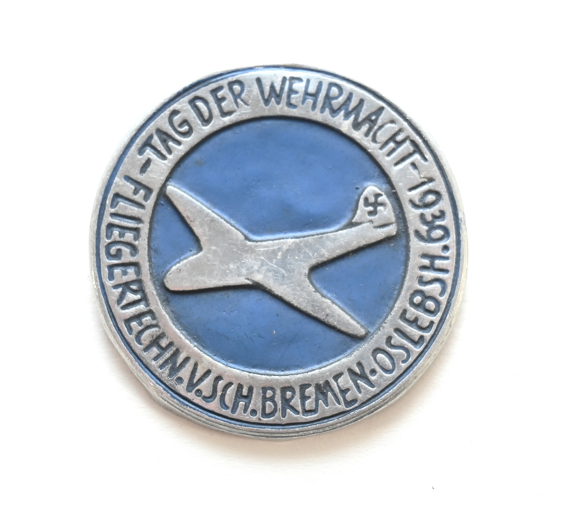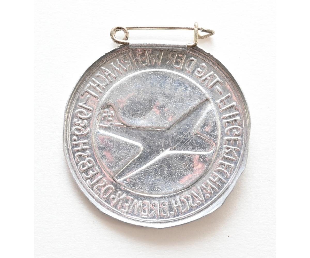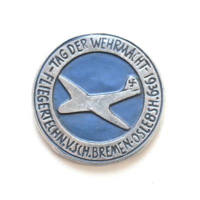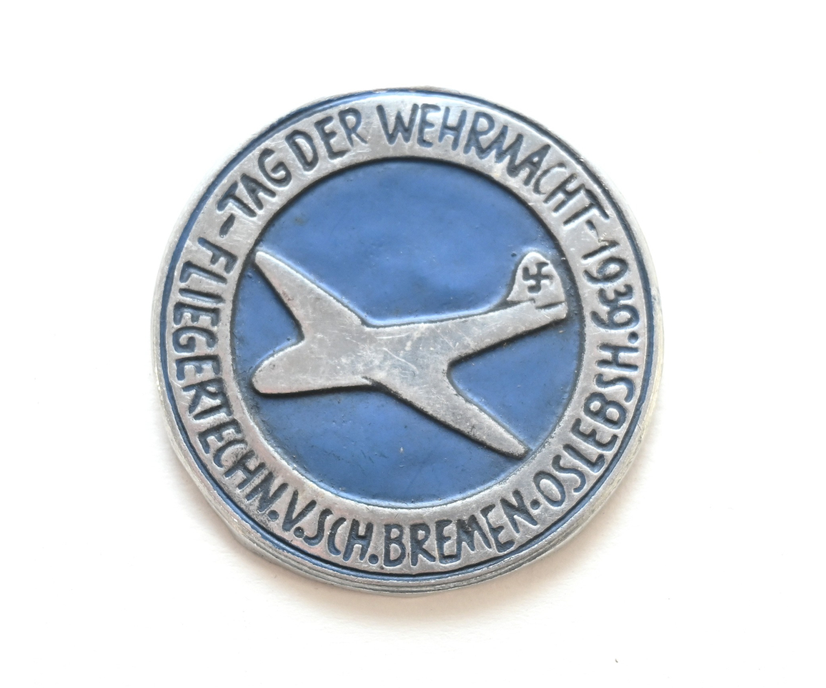 The badge or 'Abzeichen' shows overall normal signs of wear. It's complete with pin on the back. Issued during the Tag der Wehrmacht of 1939 for the Fliegertechnische Vorschule Bremen-Oslebsh.