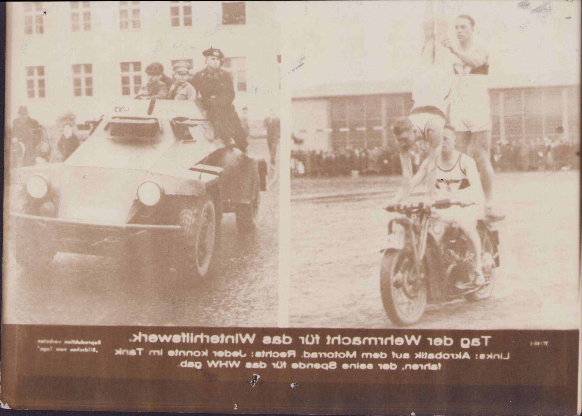 The photograph shows overall normal signs of wear. On the left photo wwe see 3 Wehrmacht soldiers on a motorcycle doing acrobatic stuff and the right photo shows a Panzer scout vehicle with a Panzer soldier and Hitler Youth in it.