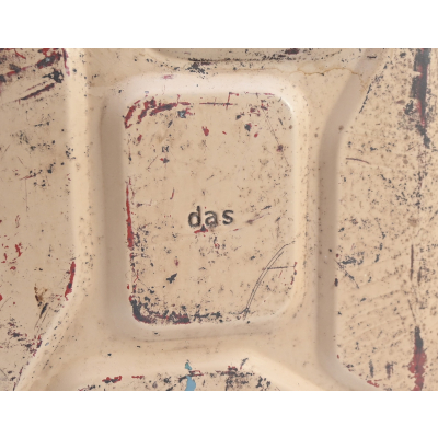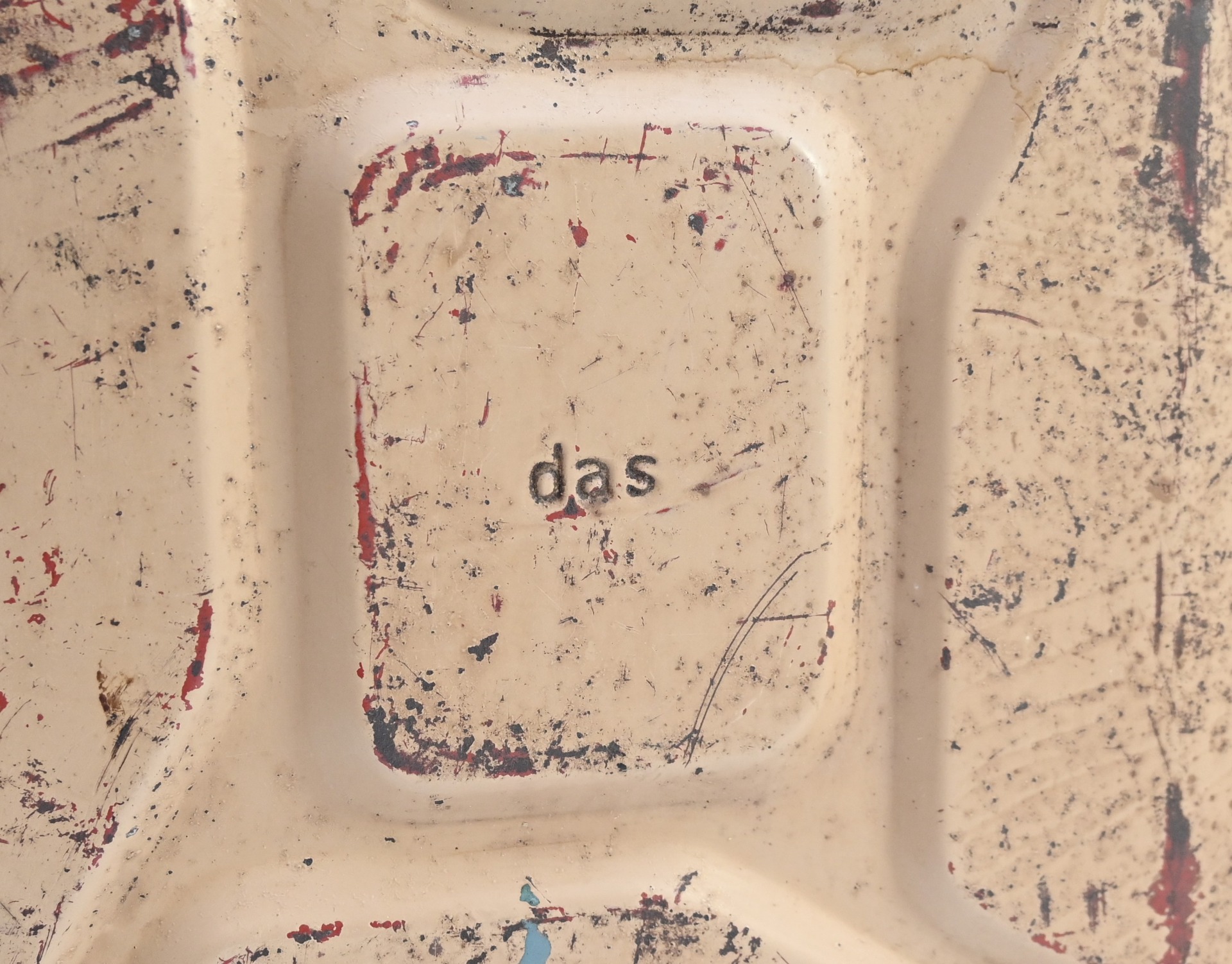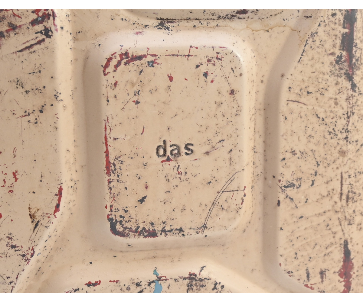 The jerrycan shows overall normal signs of wear. No holes in the bottom. There seems to be an old, small repair. Around 85% of its original tan color is still present. It's dated 1944 and marked by the manufacturer 'das'.