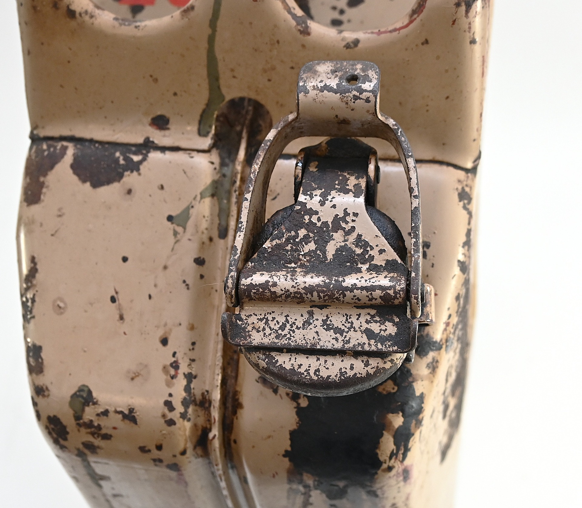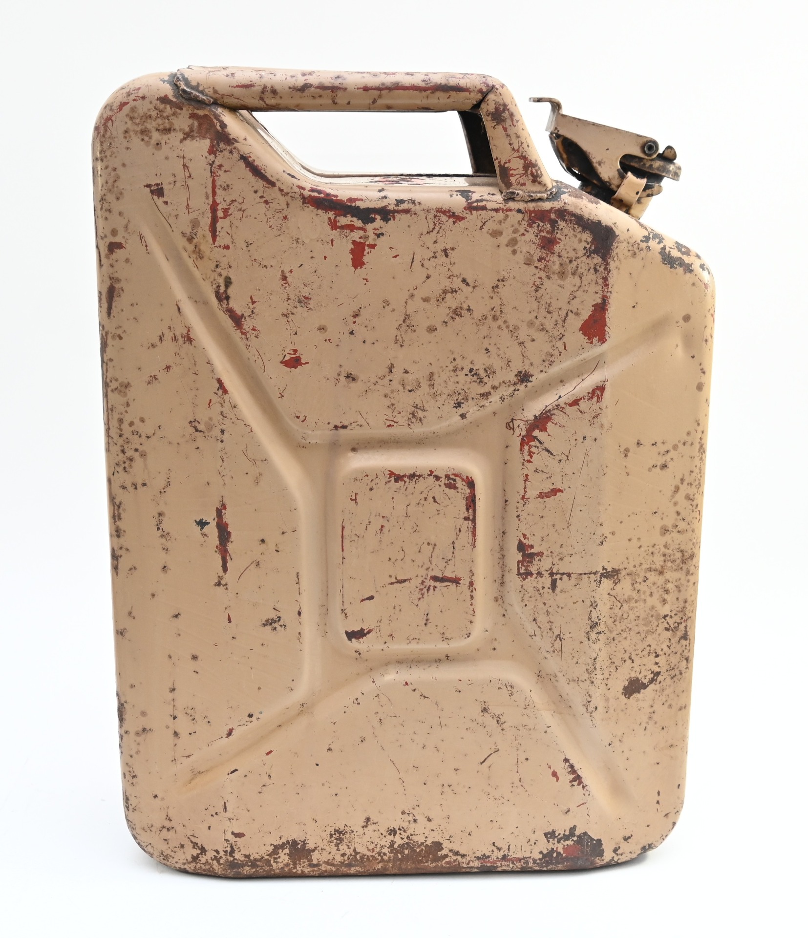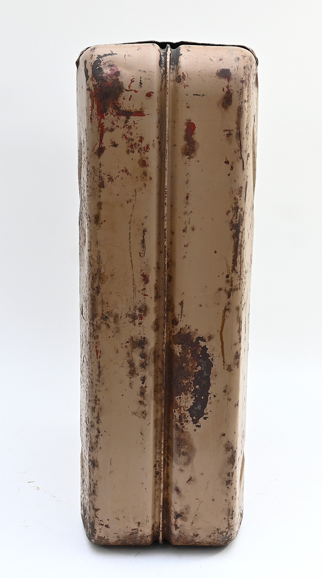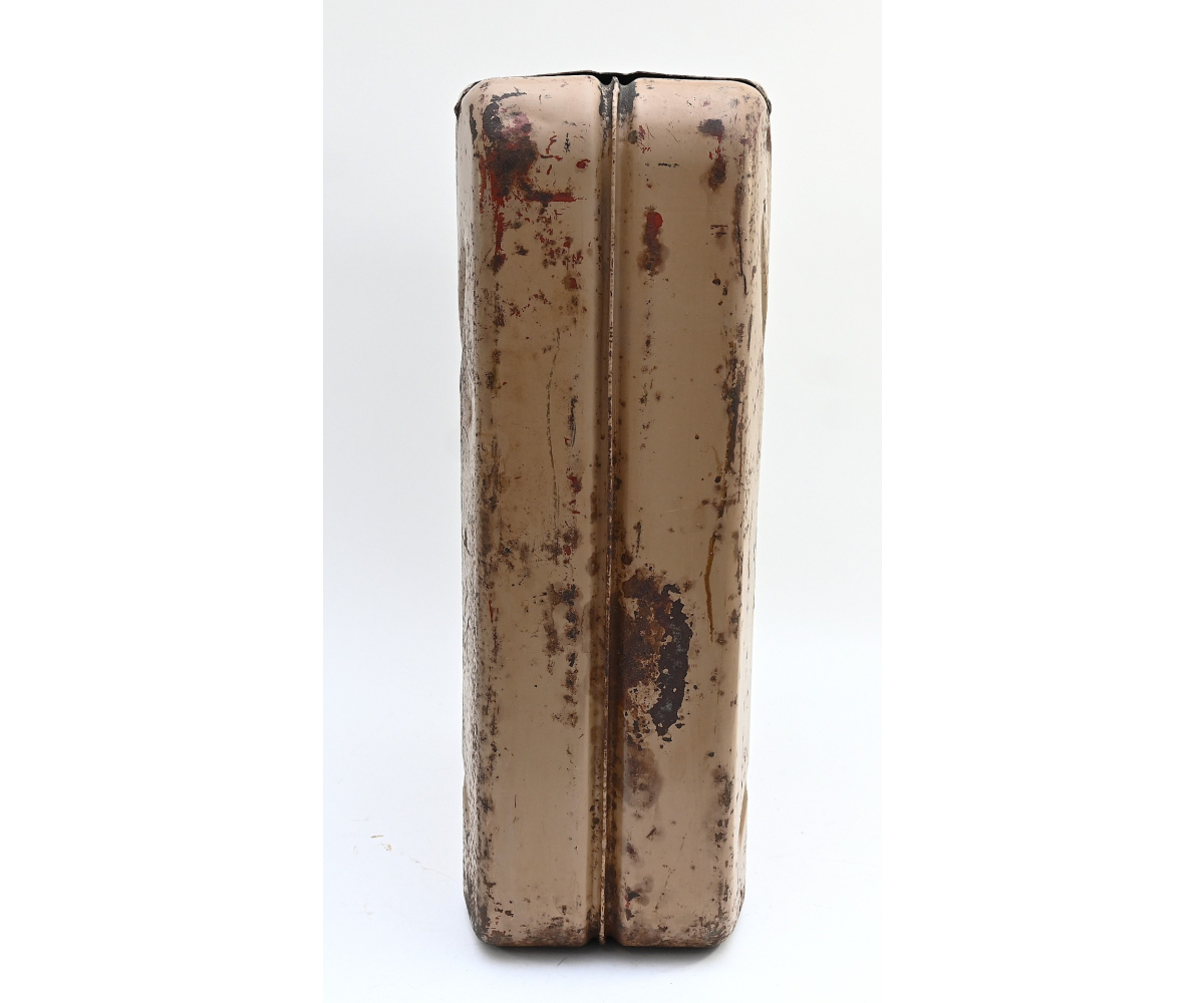 These tan colored jerrycans are getting harder to find. This one was used, after the war, to store oil.