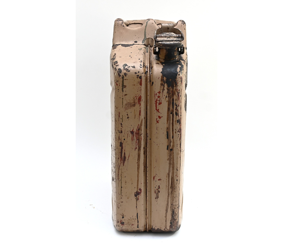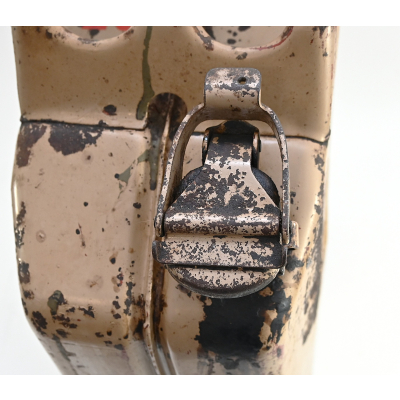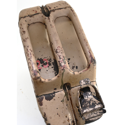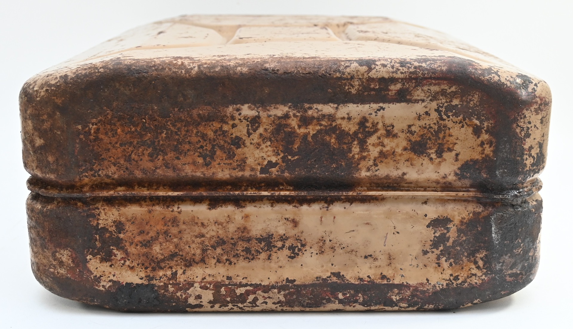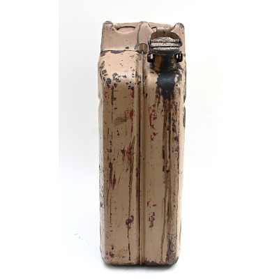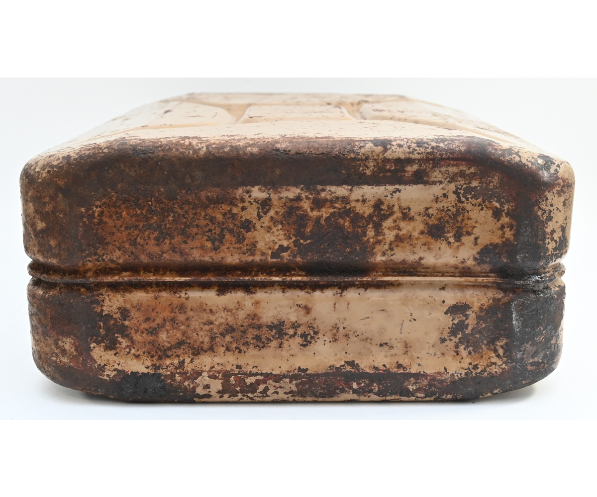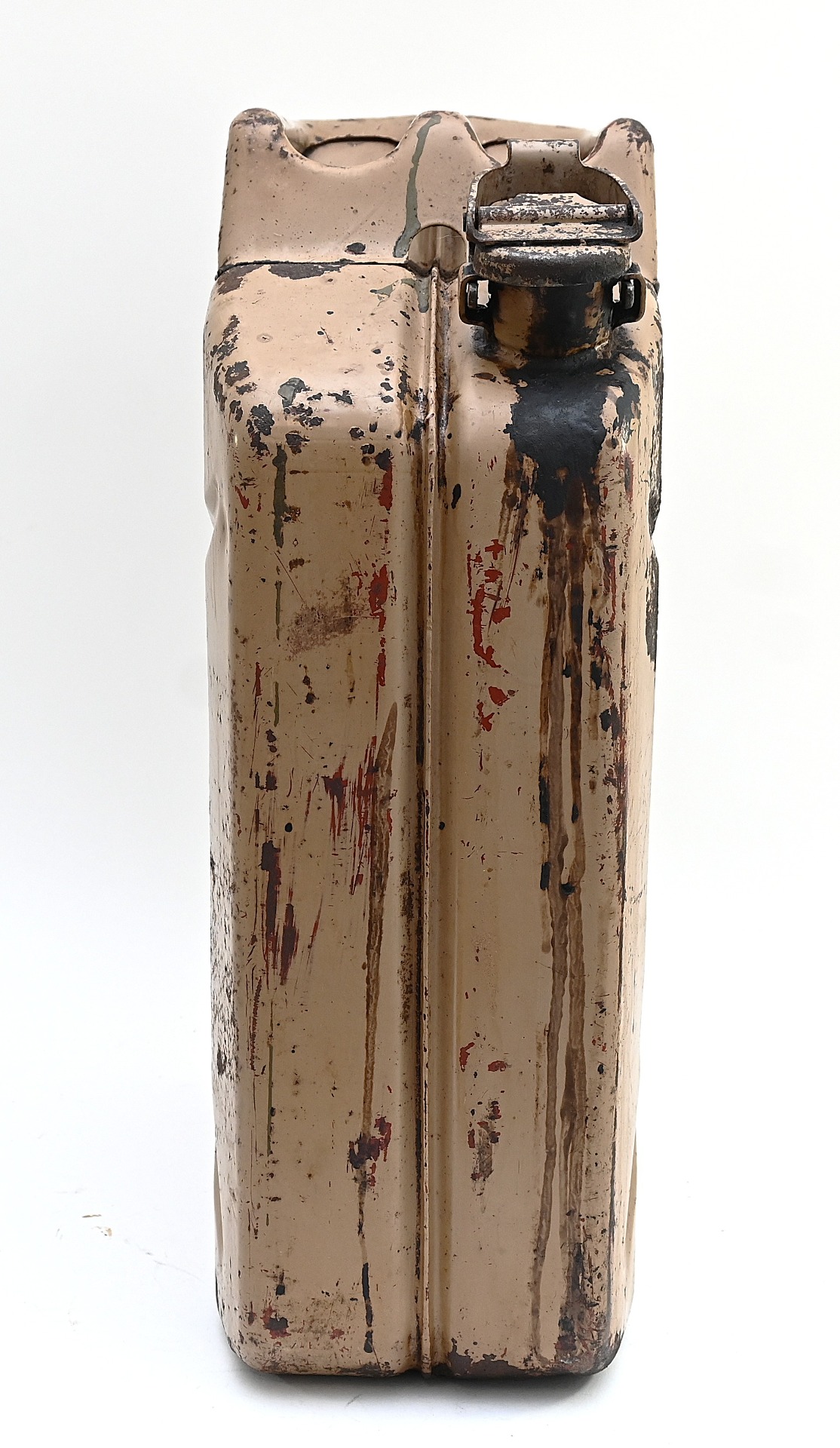 These tan colored jerrycans are getting harder to find. This one was used, after the war, to store oil.