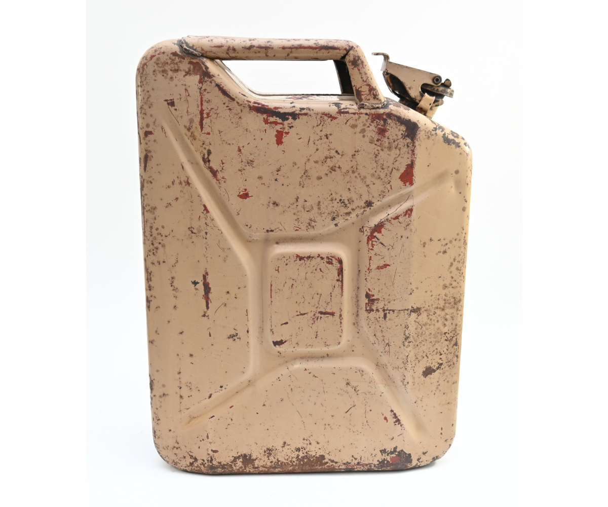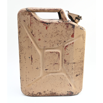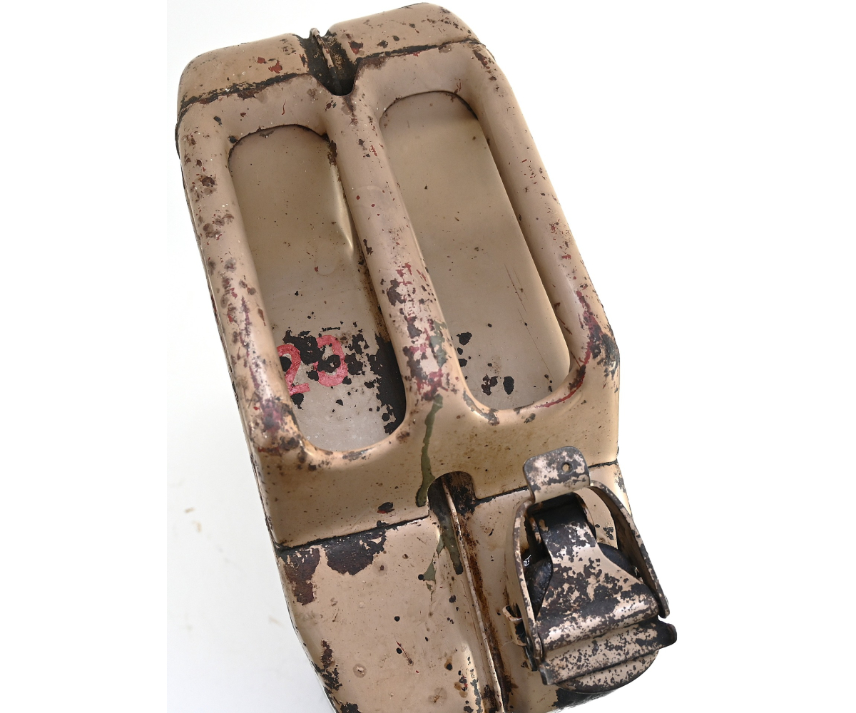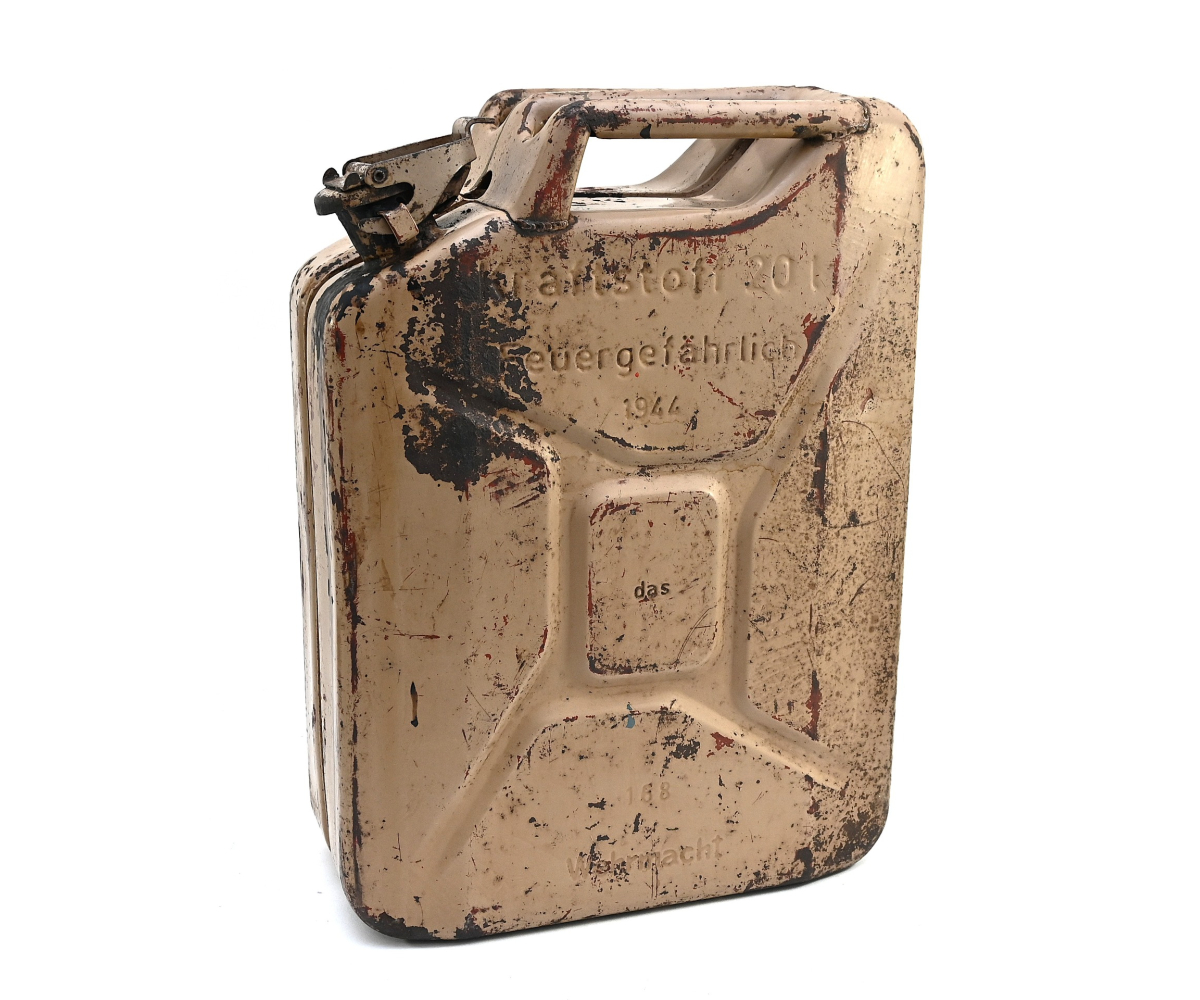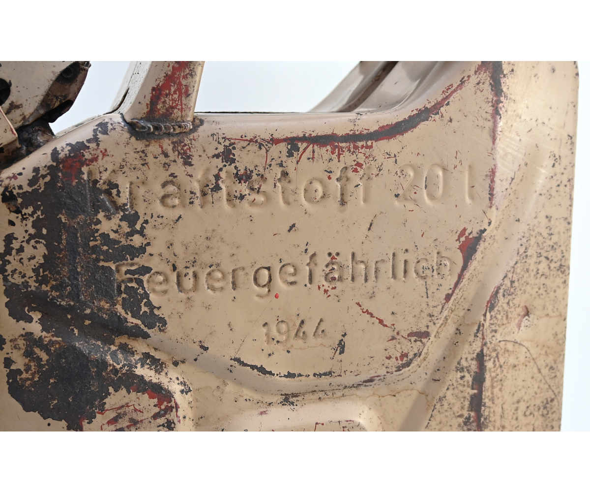 These tan colored jerrycans are getting harder to find. This one was used, after the war, to store oil.
