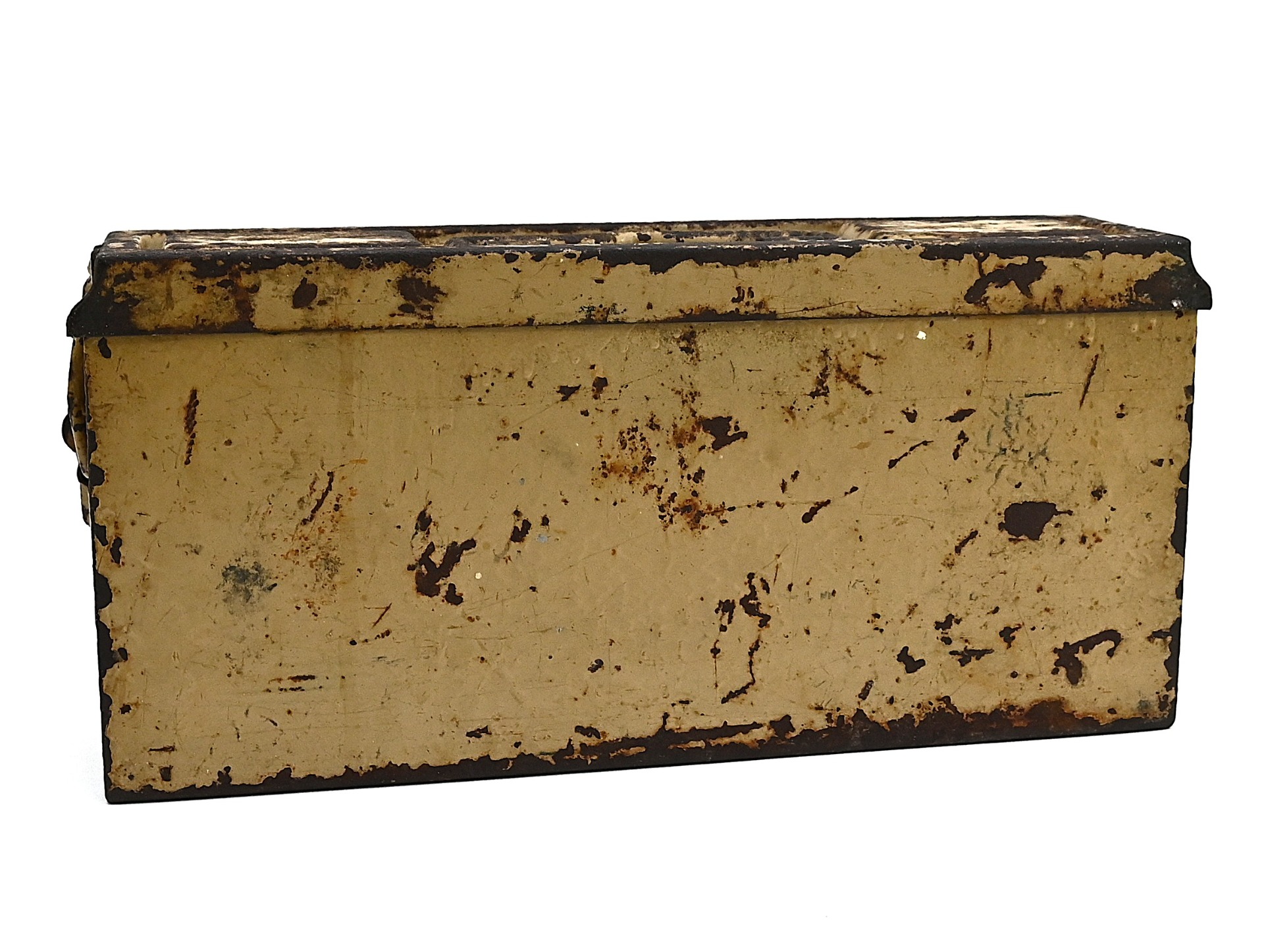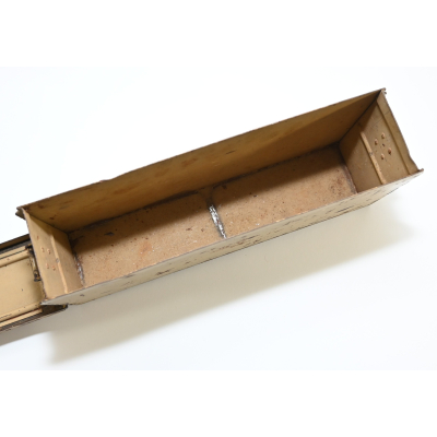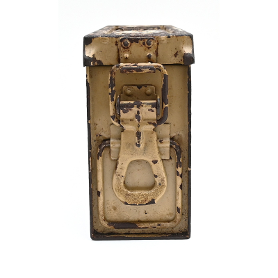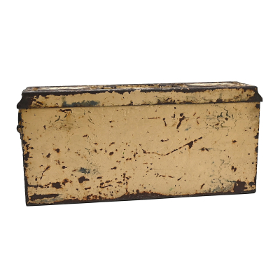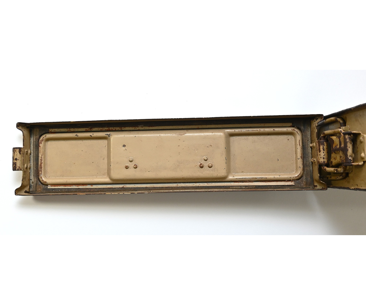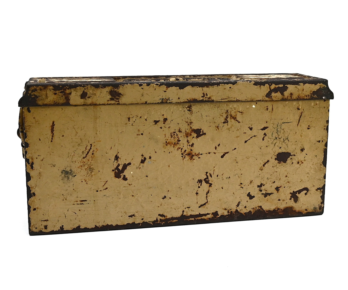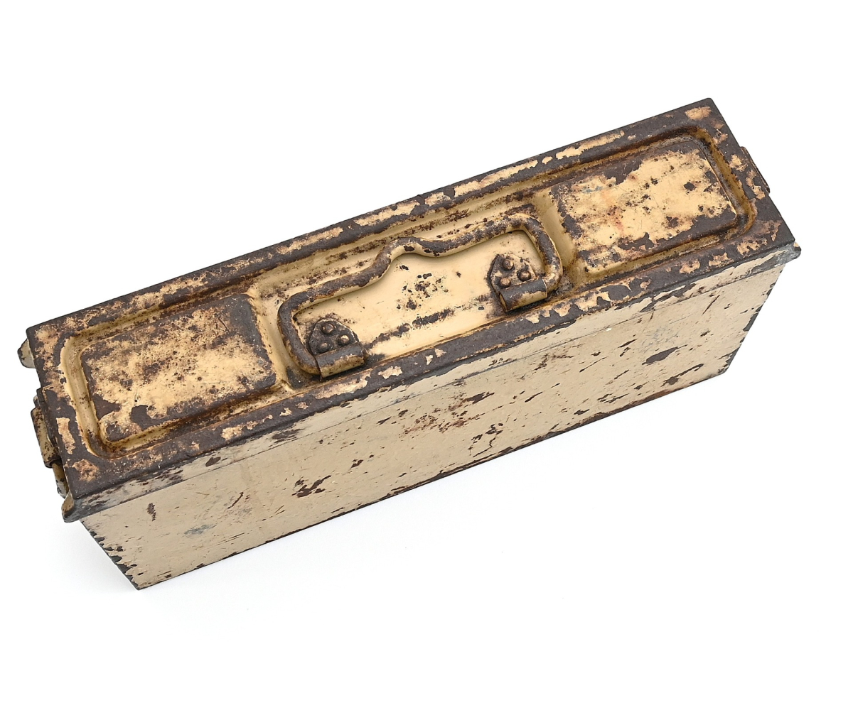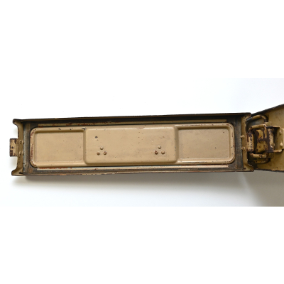The box shows overall normal signs of wear. 85% Of its original color is still present. Marked on each side with 'Patr.Kast.41.f.MG' and a 3-letter 'bdk' code on the lid.
