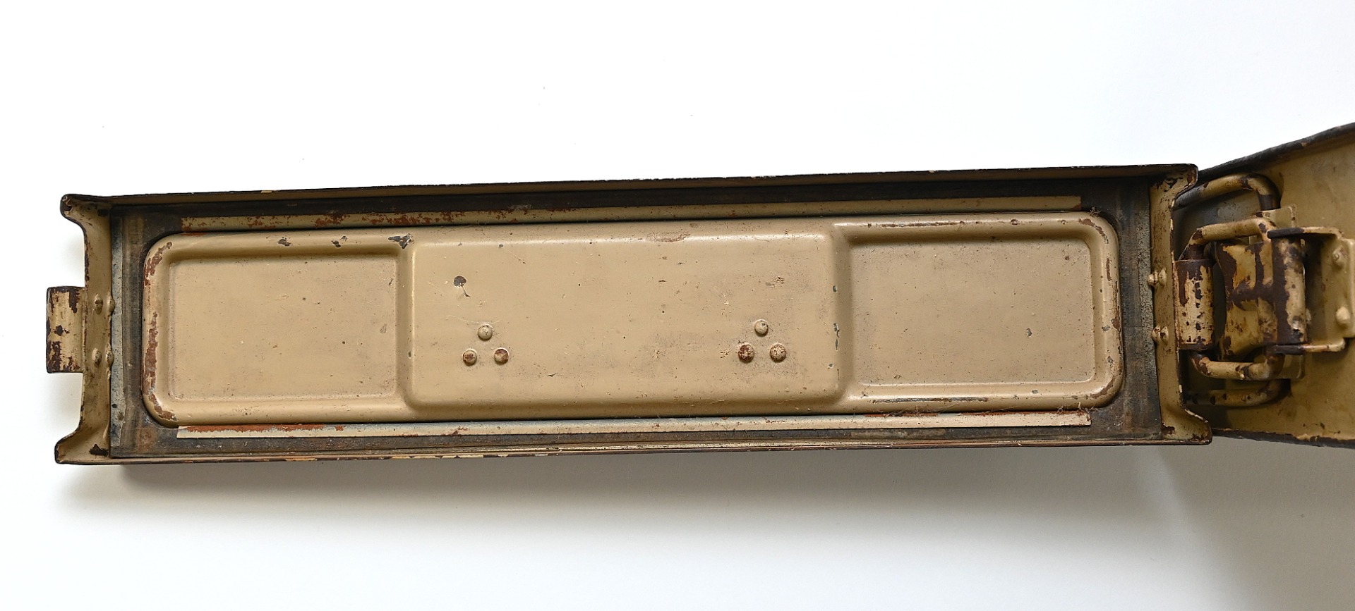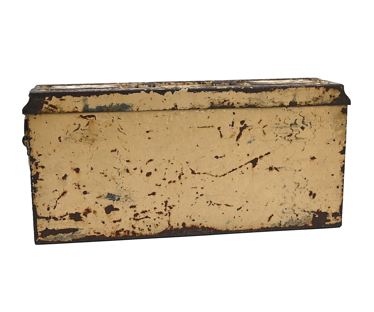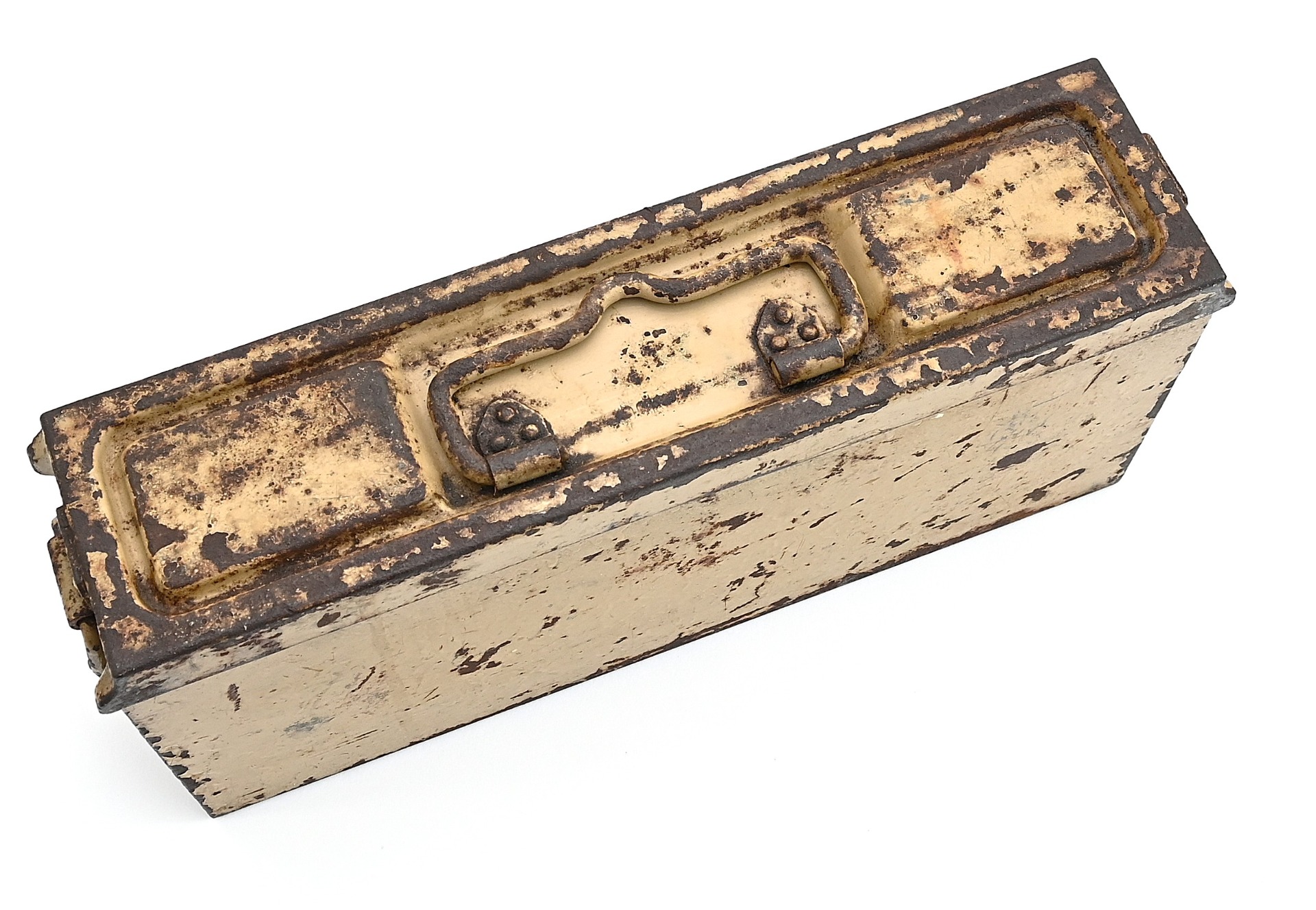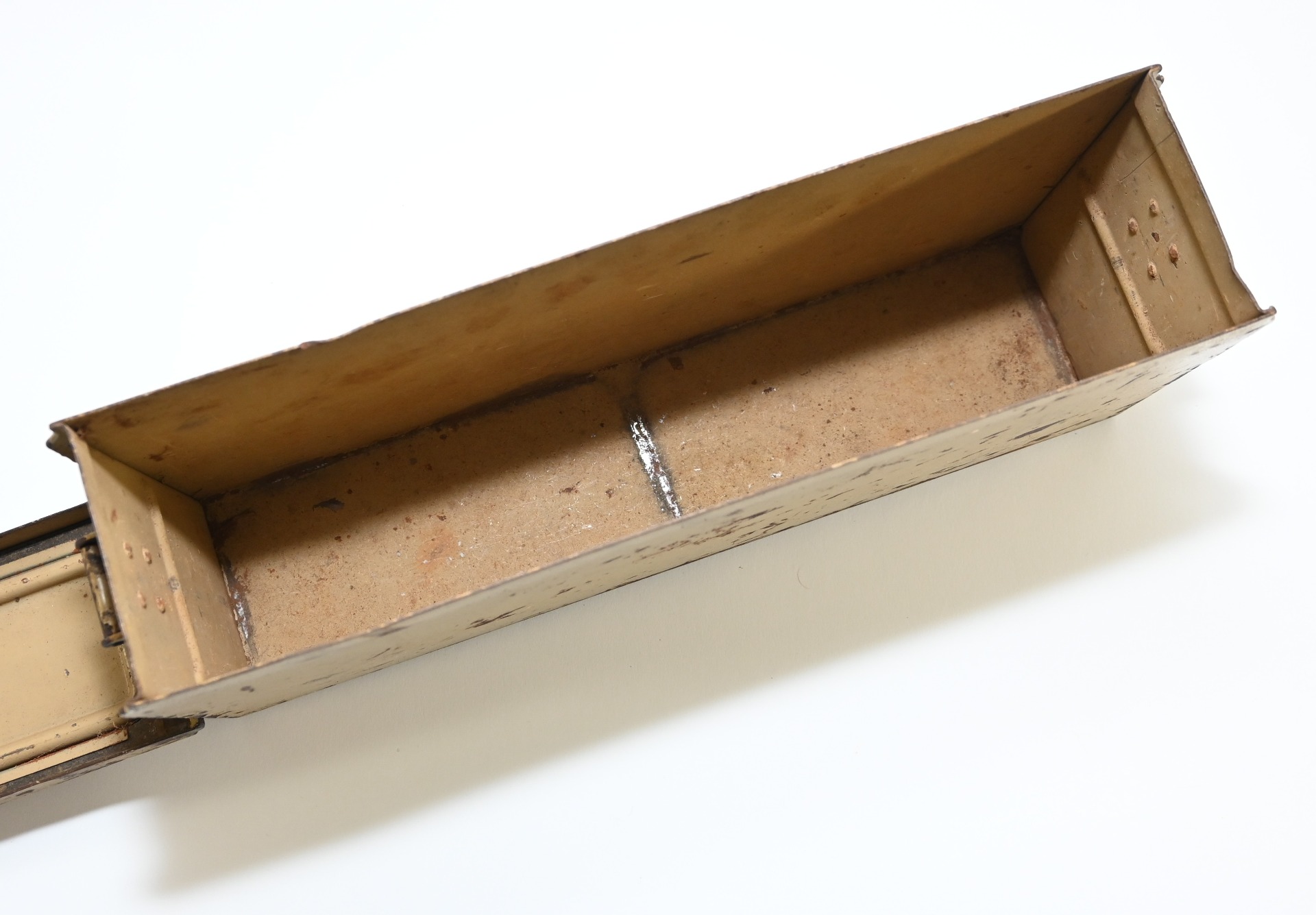 The box shows overall normal signs of wear. 85% Of its original color is still present. Marked on each side with 'Patr.Kast.41.f.MG' and a 3-letter 'bdk' code on the lid.