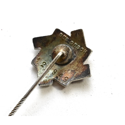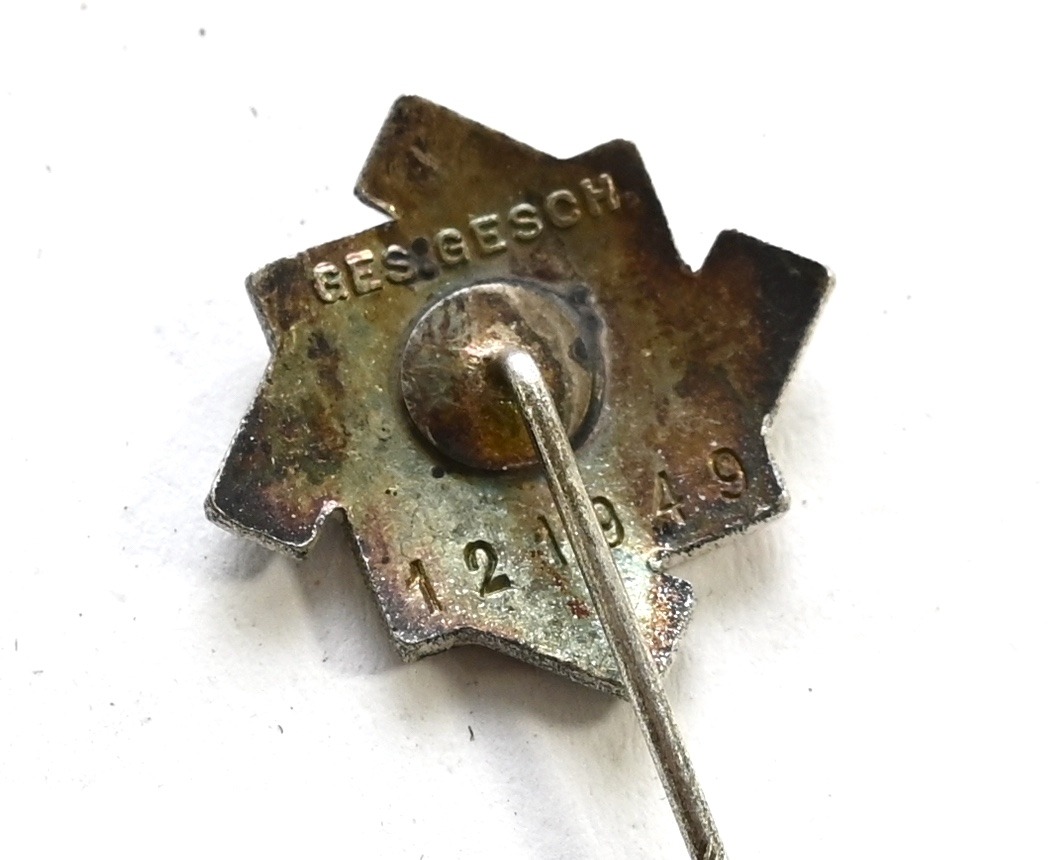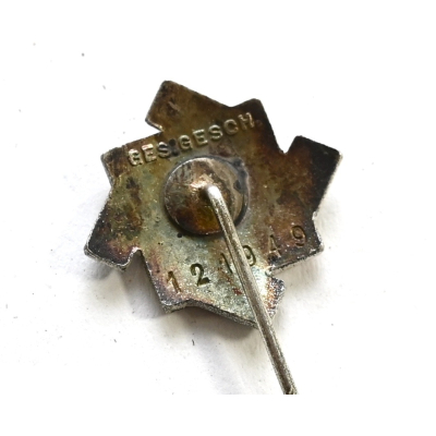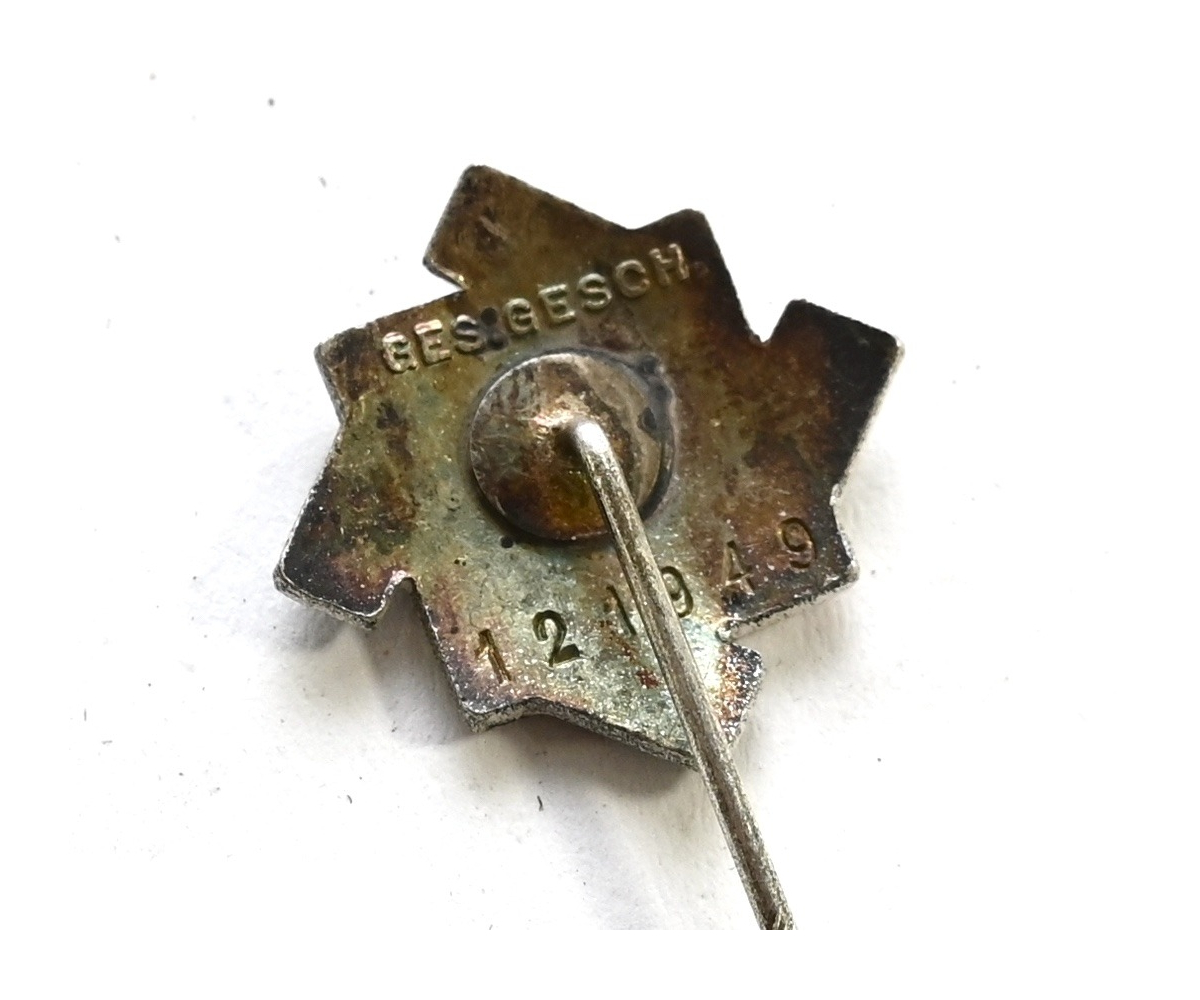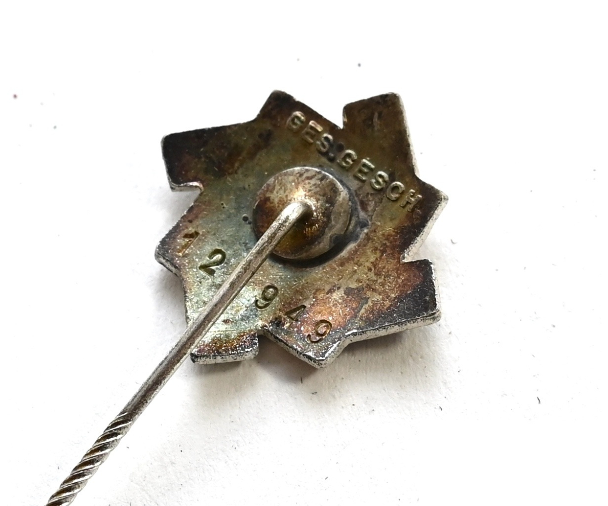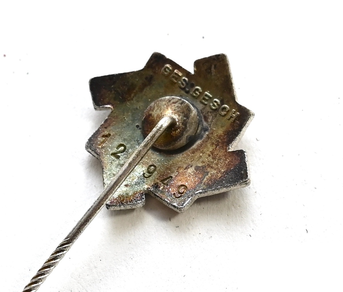 The pin shows overall normal signs of wear. Marked on the back with 'ges.gesch' and member/issue number '121949'. Not an easy to find membership stickpin.