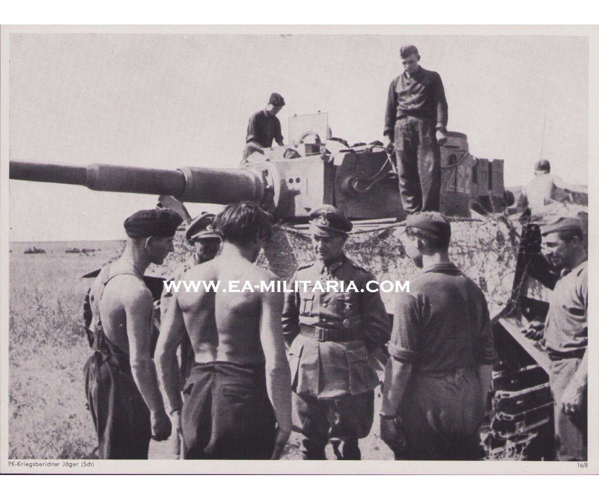The photo shows overall normal signs of storage wear. It shows a German Tiger I crew receive a visit from General von Brauchitsch. Note the nummber '222' on the side of the Tigers' turret. We think this tiger belonged to the schwere Panzer Jager Abteilung 503. Which fought on the eastern front, but from June 1944 in the Normandy area.