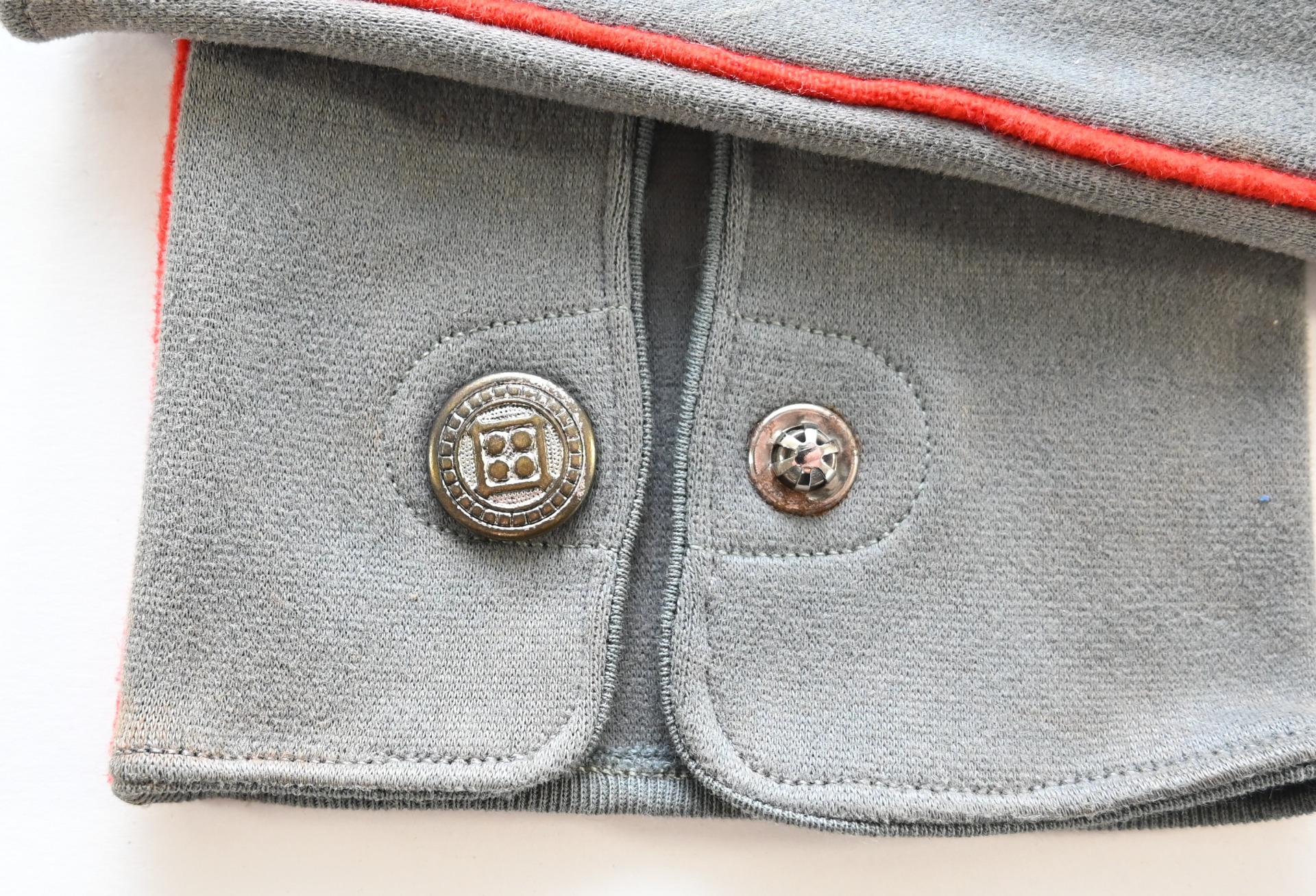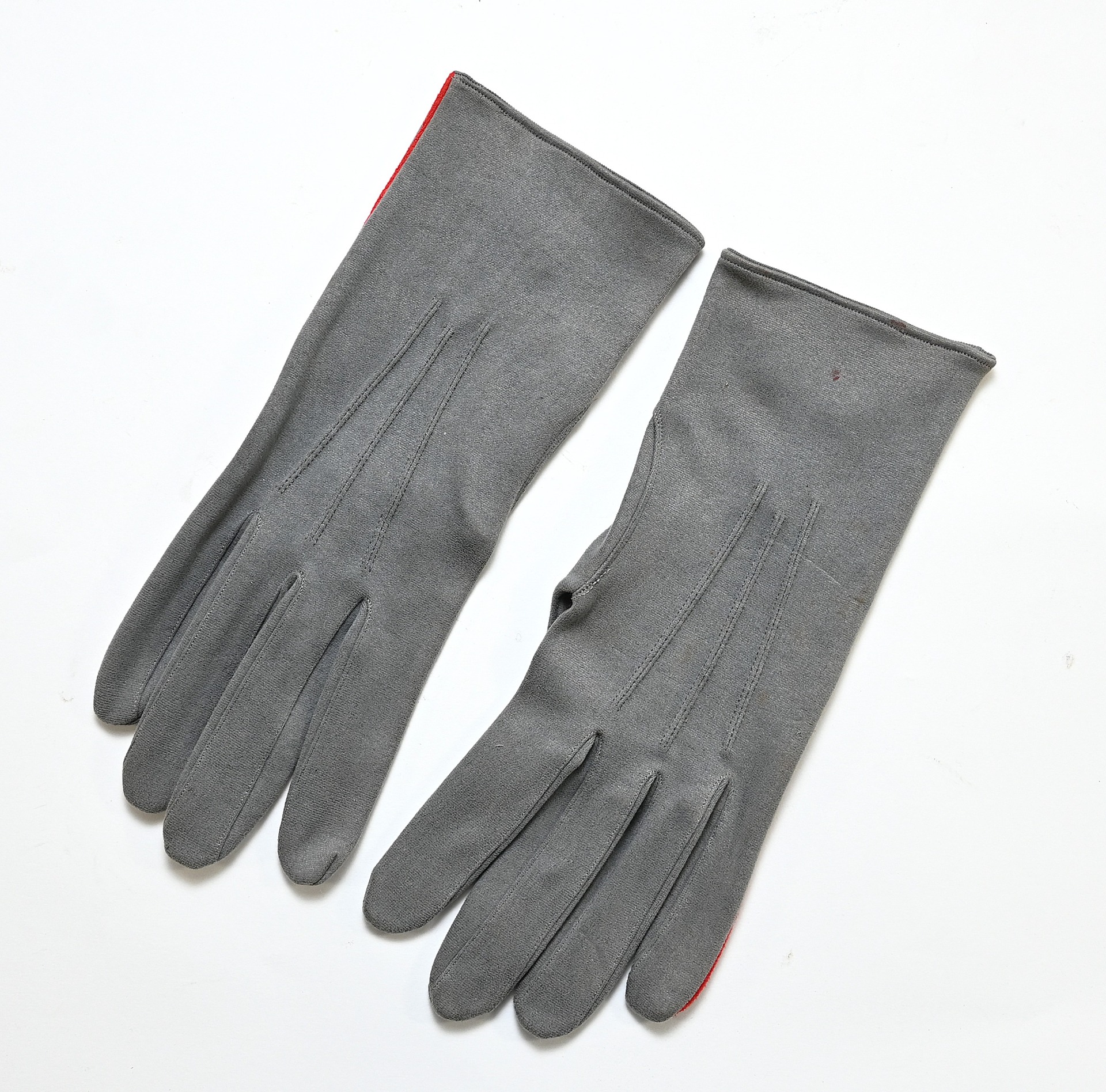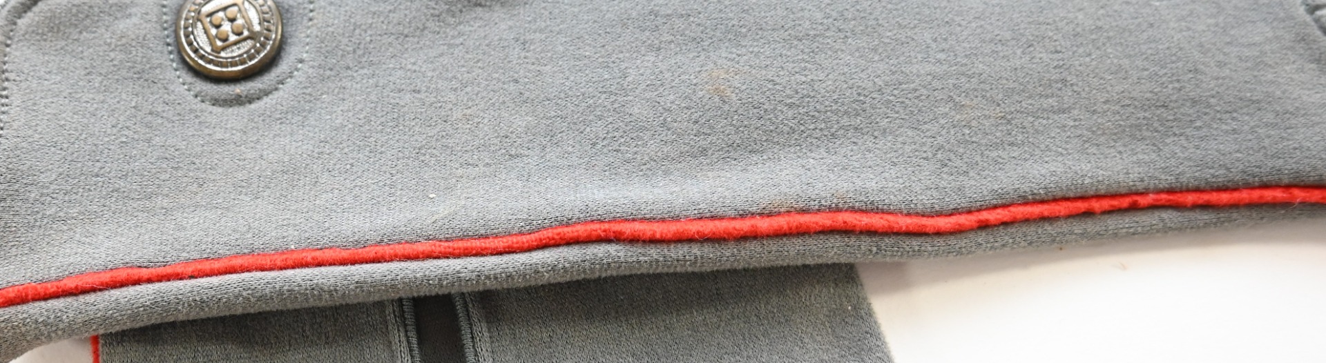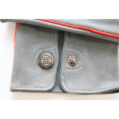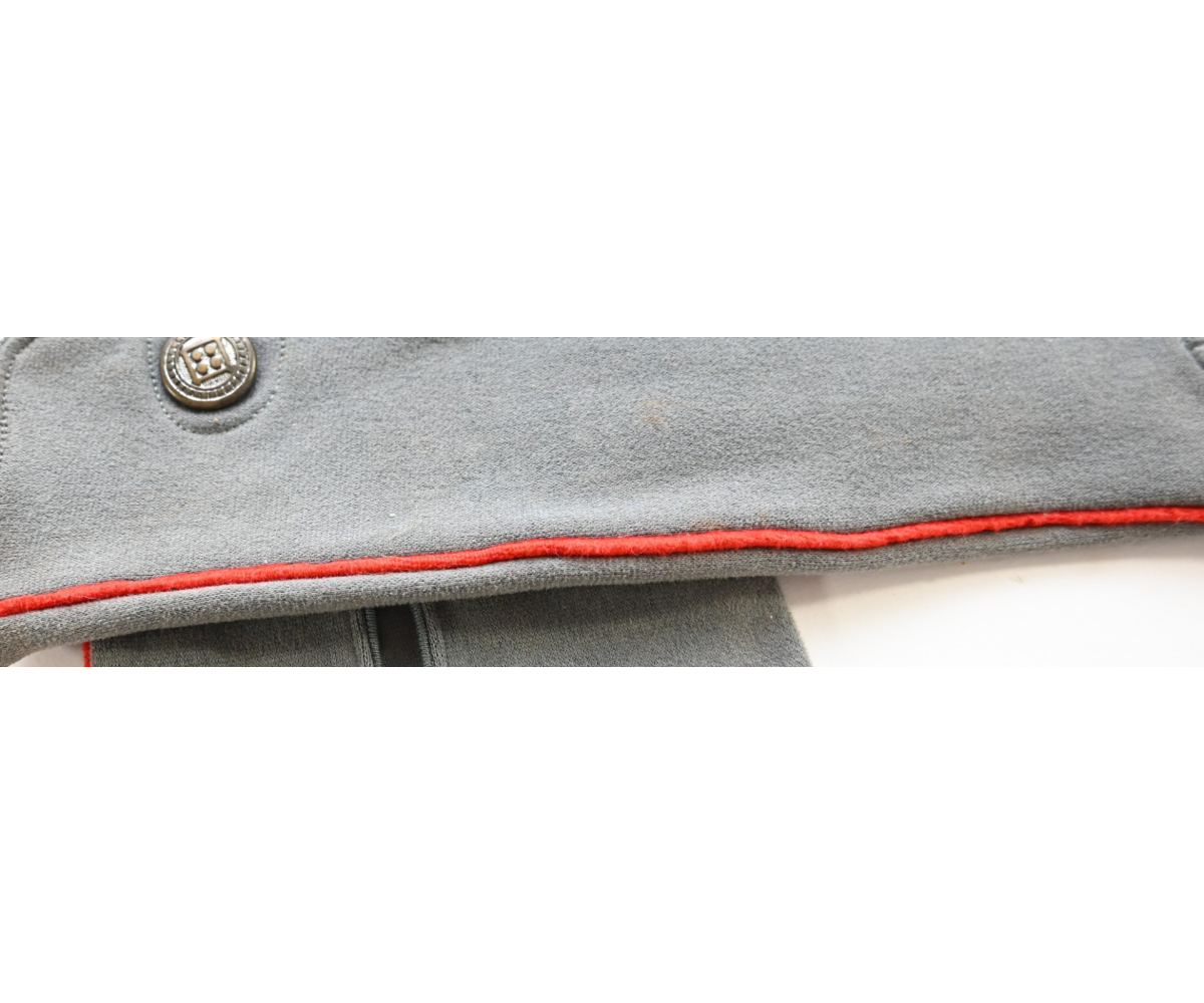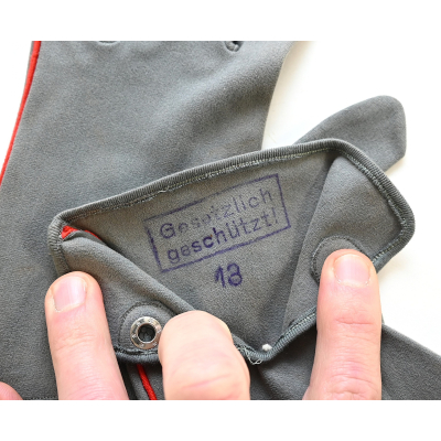 The gloves show overall minor signs of storage wear. They have no damage whatsoever. It;s a fully matching pair and one is marked on the inside. What makes this pair a bit more uncommon is the red piping. This could indicated they were purchased by a soldier who served within the Artillerie branch OR they were bought/made for a General, as they would match perfect with the red striped General's breeches and the red piped uniform.