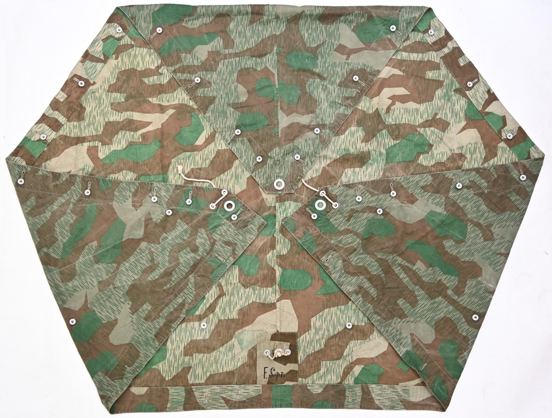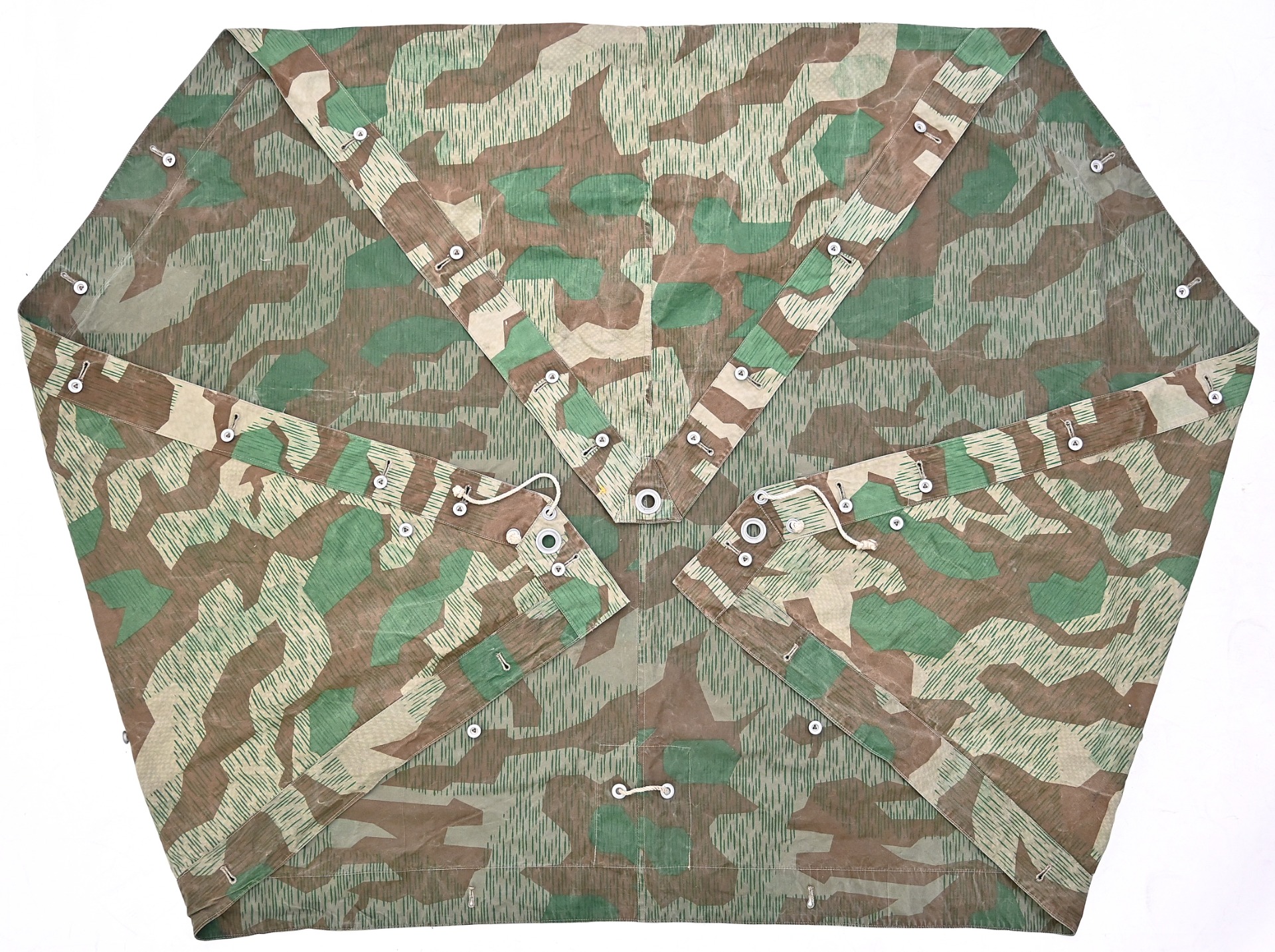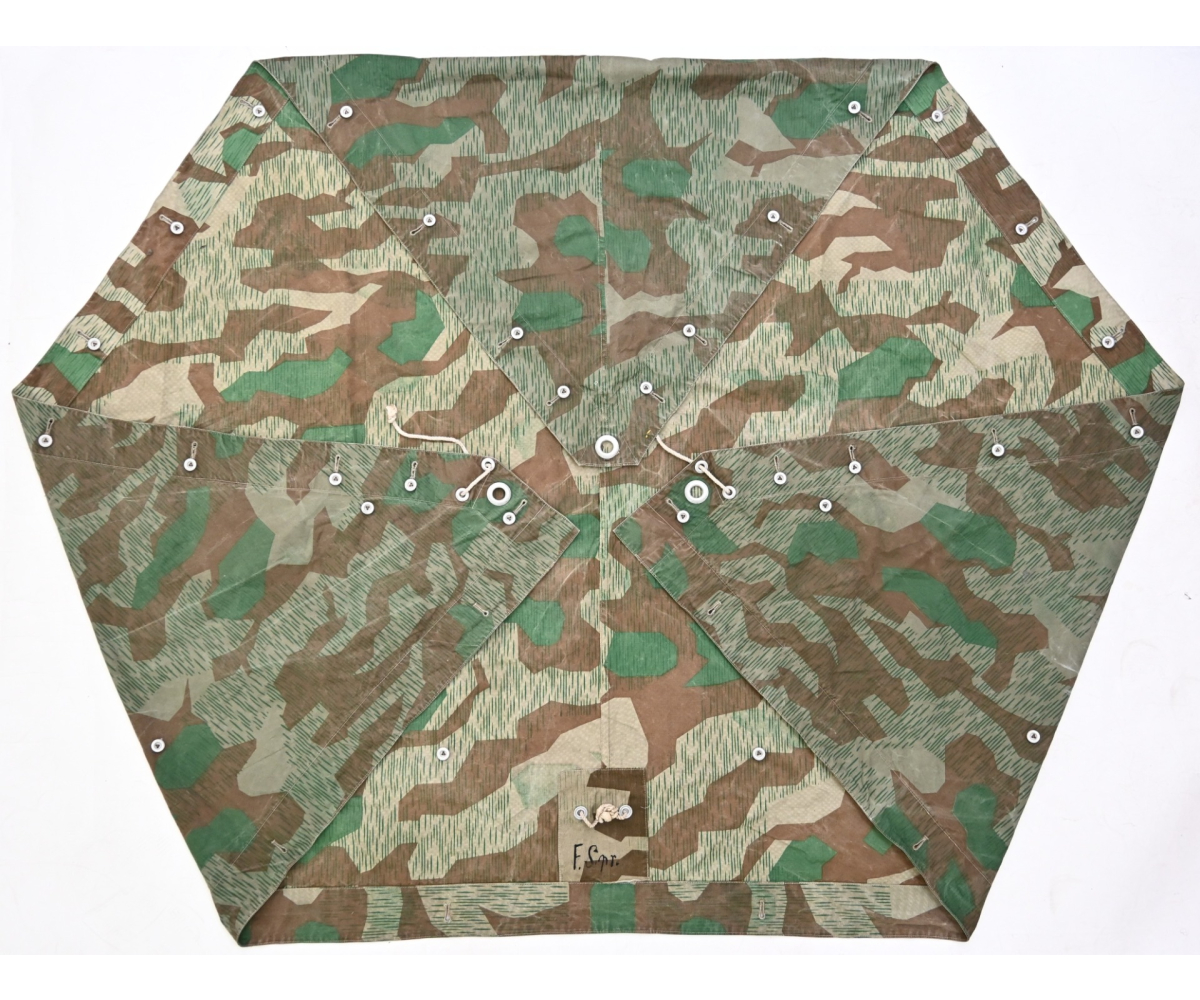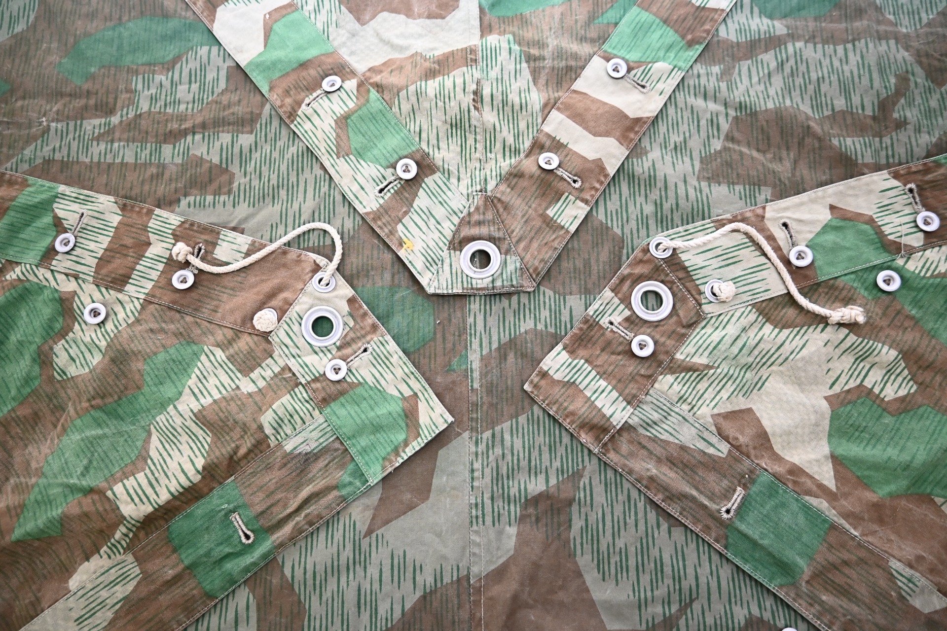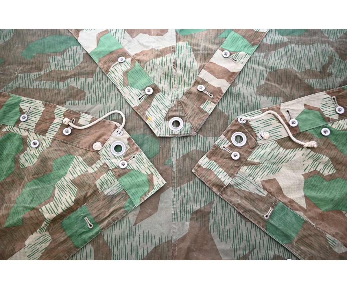 The zeltbahn shows overall normal signs of wear. It's complete with all buttons and all 3 ropes. It's is maker marked, but to hard to read.