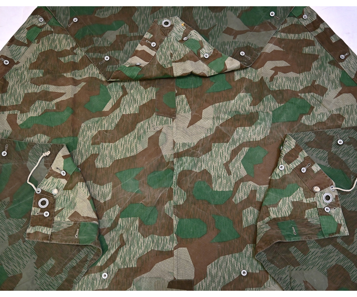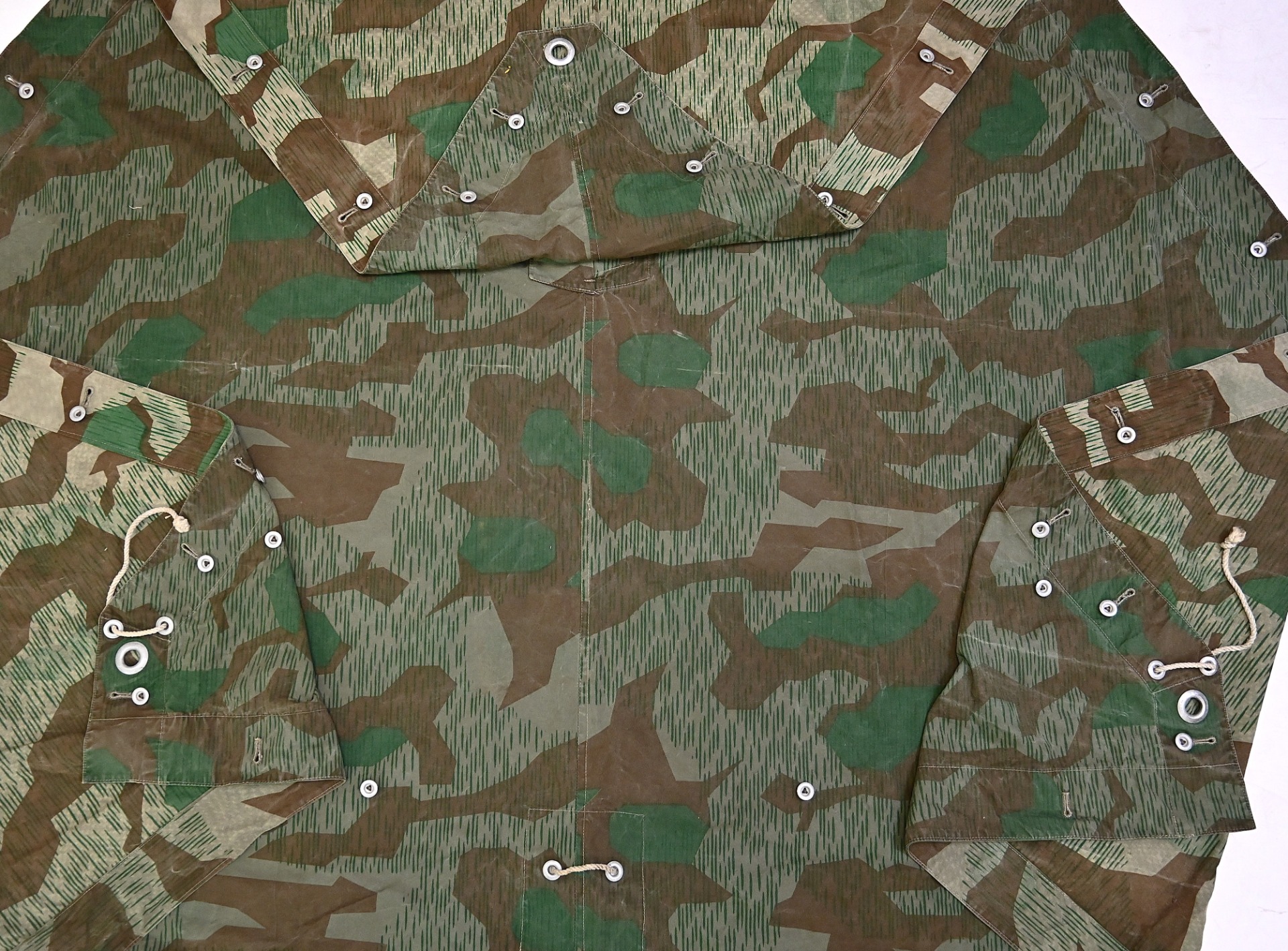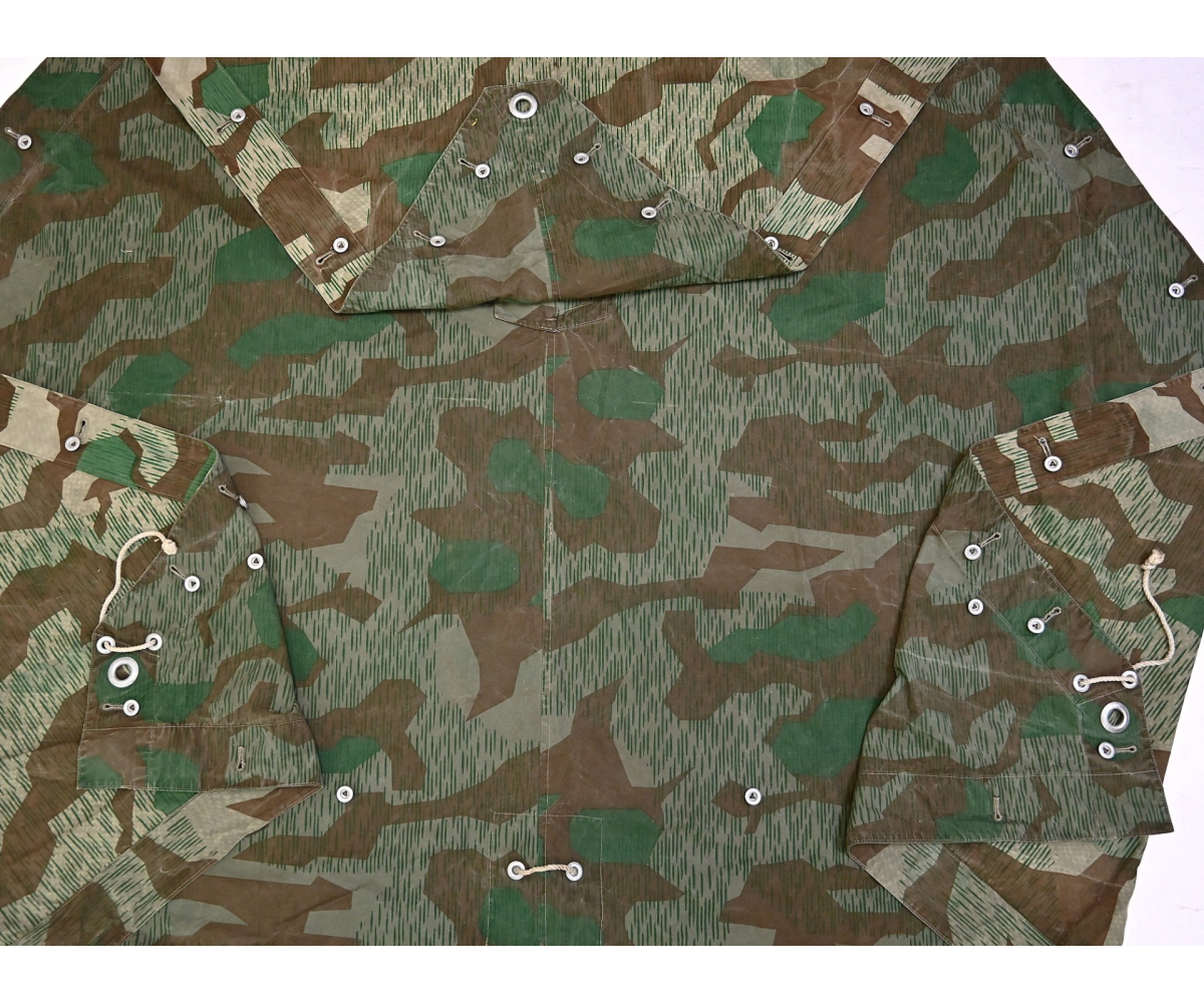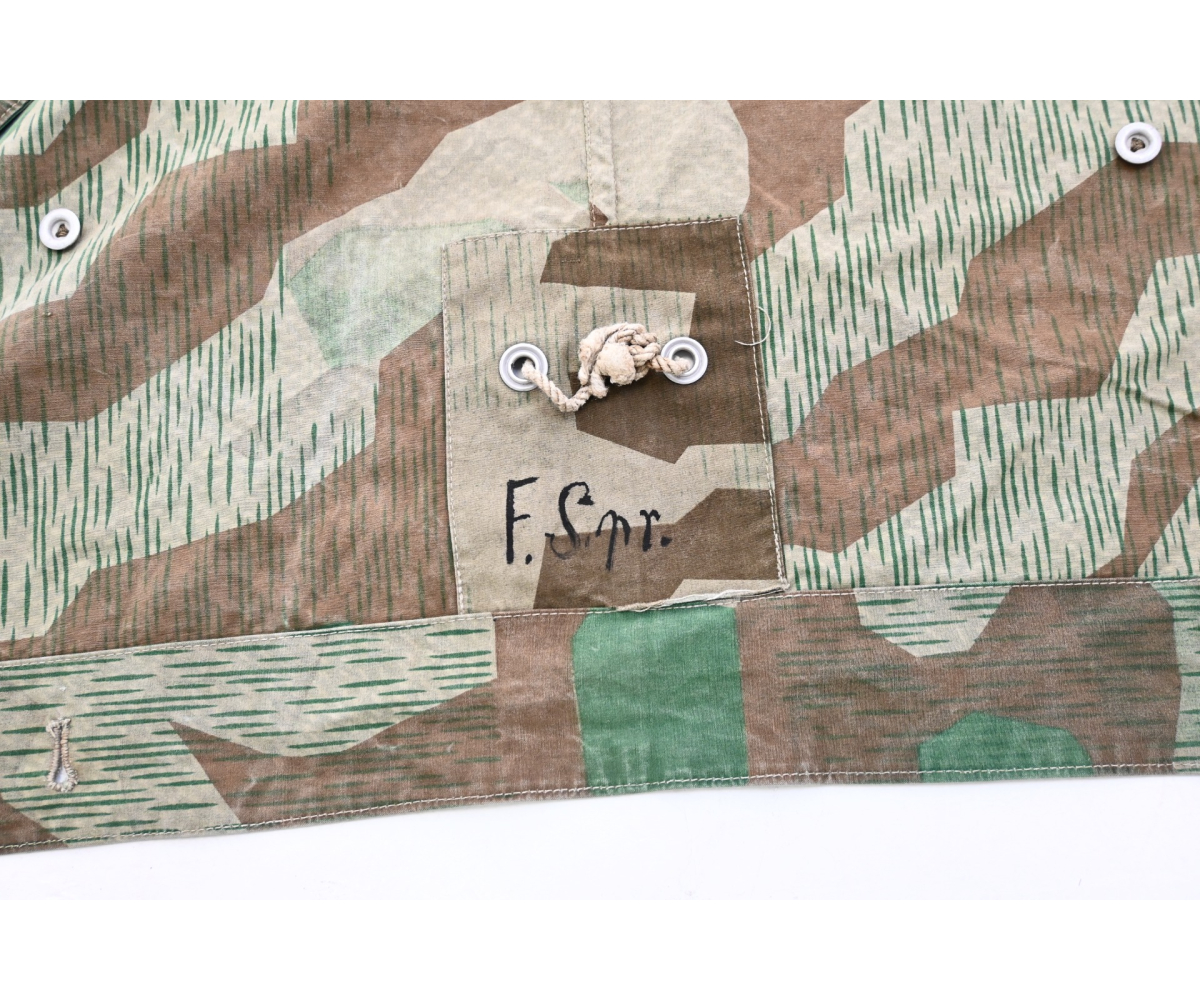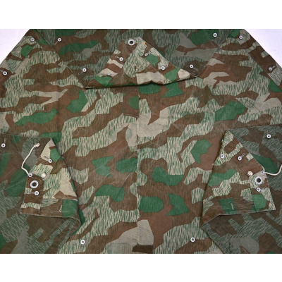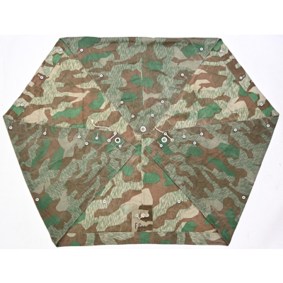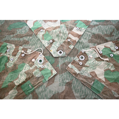 The zeltbahn shows overall normal signs of wear. It's complete with all buttons and all 3 ropes. It's is maker marked, but to hard to read.