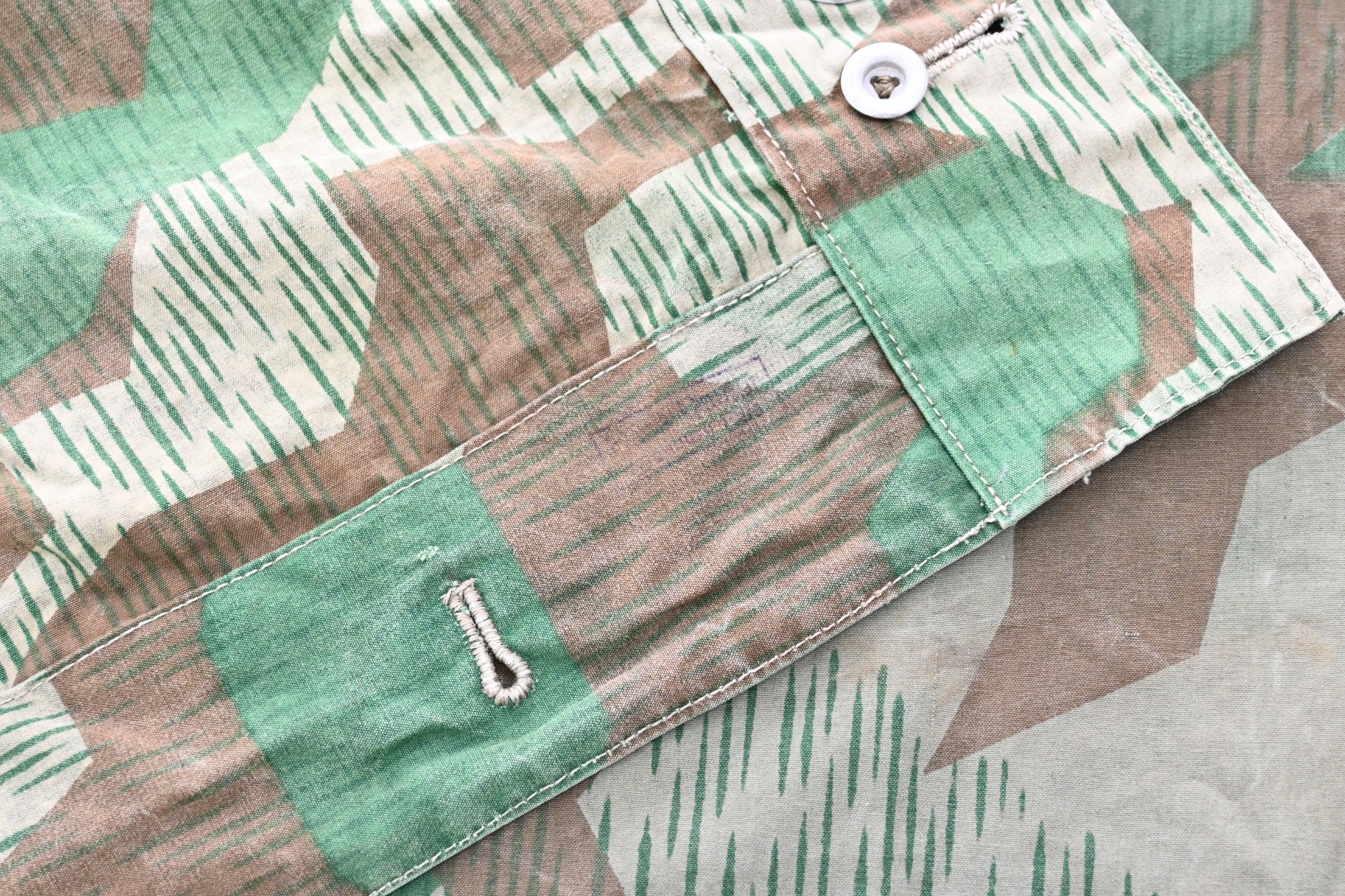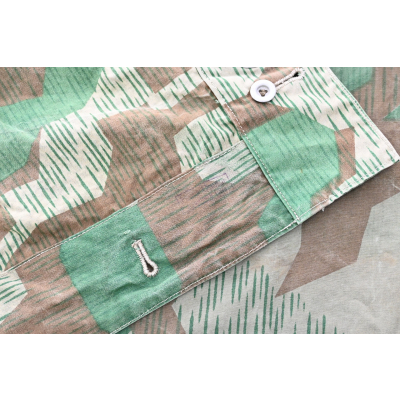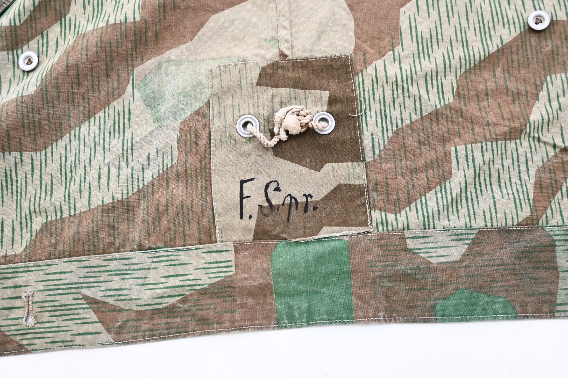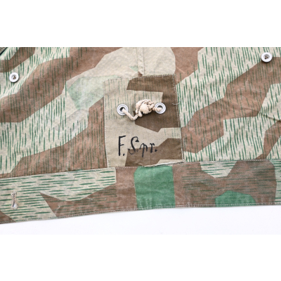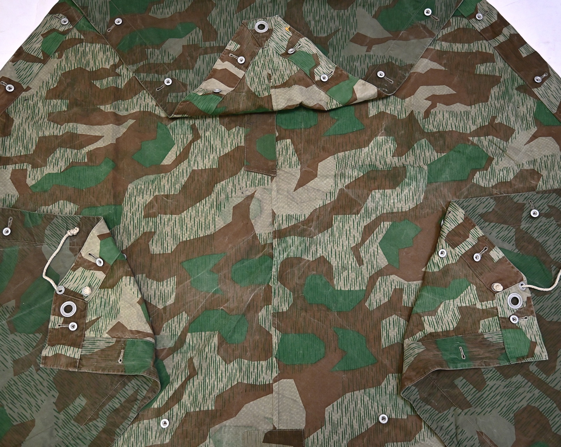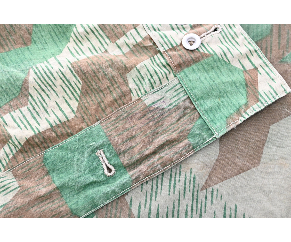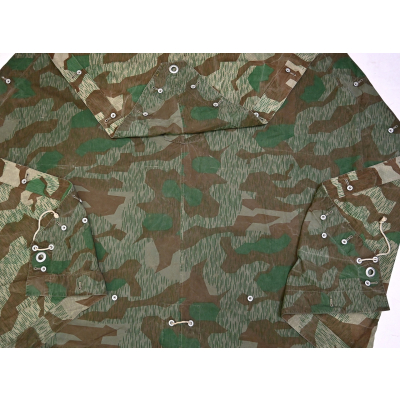 The zeltbahn shows overall normal signs of wear. It's complete with all buttons and all 3 ropes. It's is maker marked, but to hard to read.