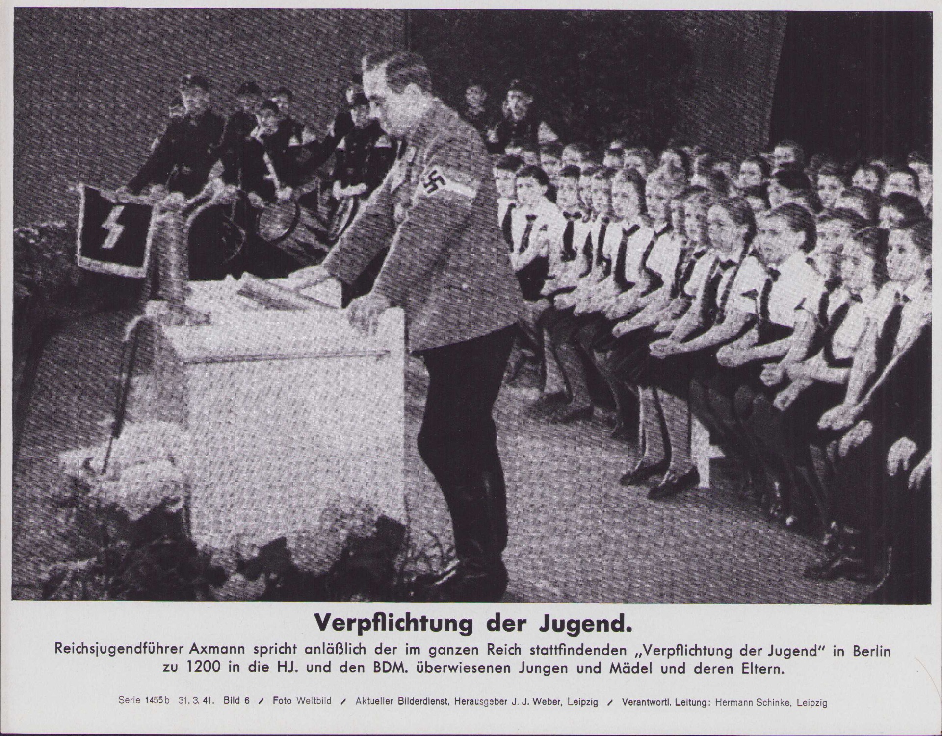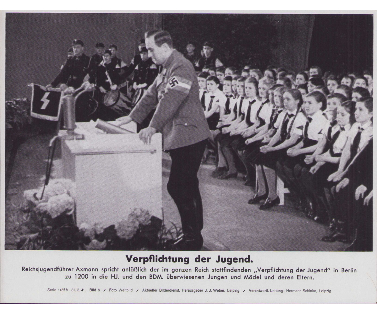 The photo shows overall minro signs of storage wear. Reichsjugendführer Axmann is speaking to members of the HJ, BDM and their parents.
