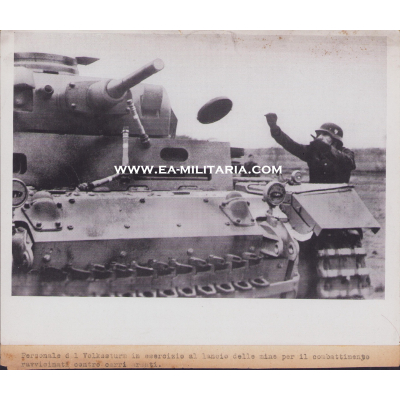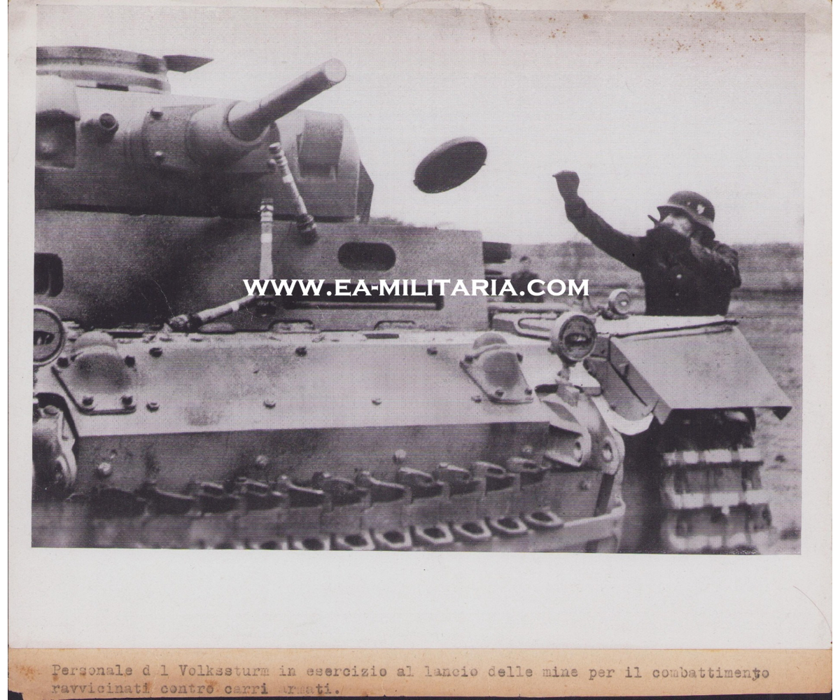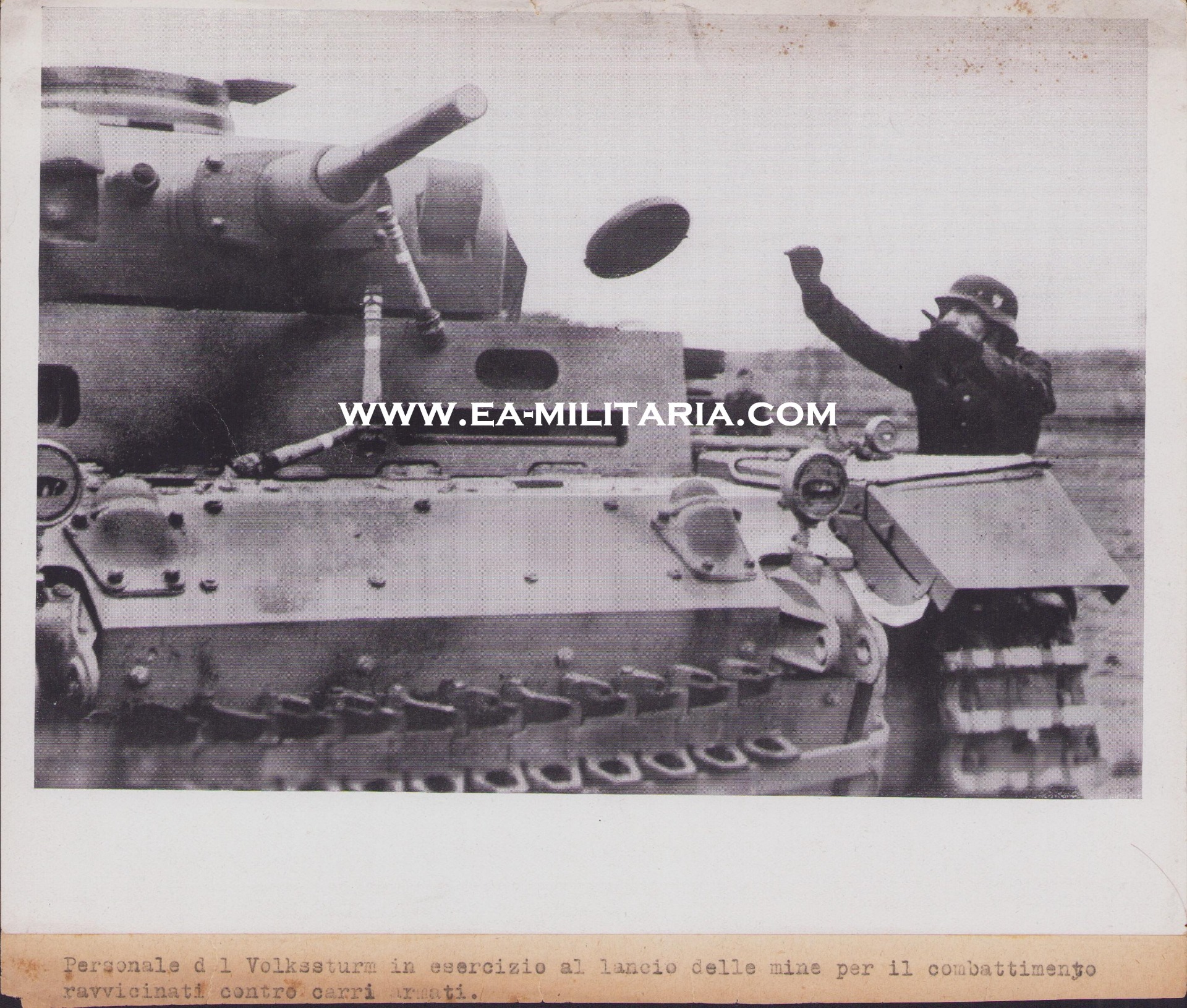 The photo shows overall normal signs of storage wear. It's complete with (Italian) paper caption on the bottom of the photo. The caption reads 'Volkssturm personnel practising launching mines for close combat with tanks'