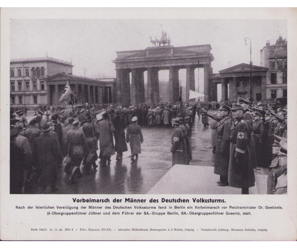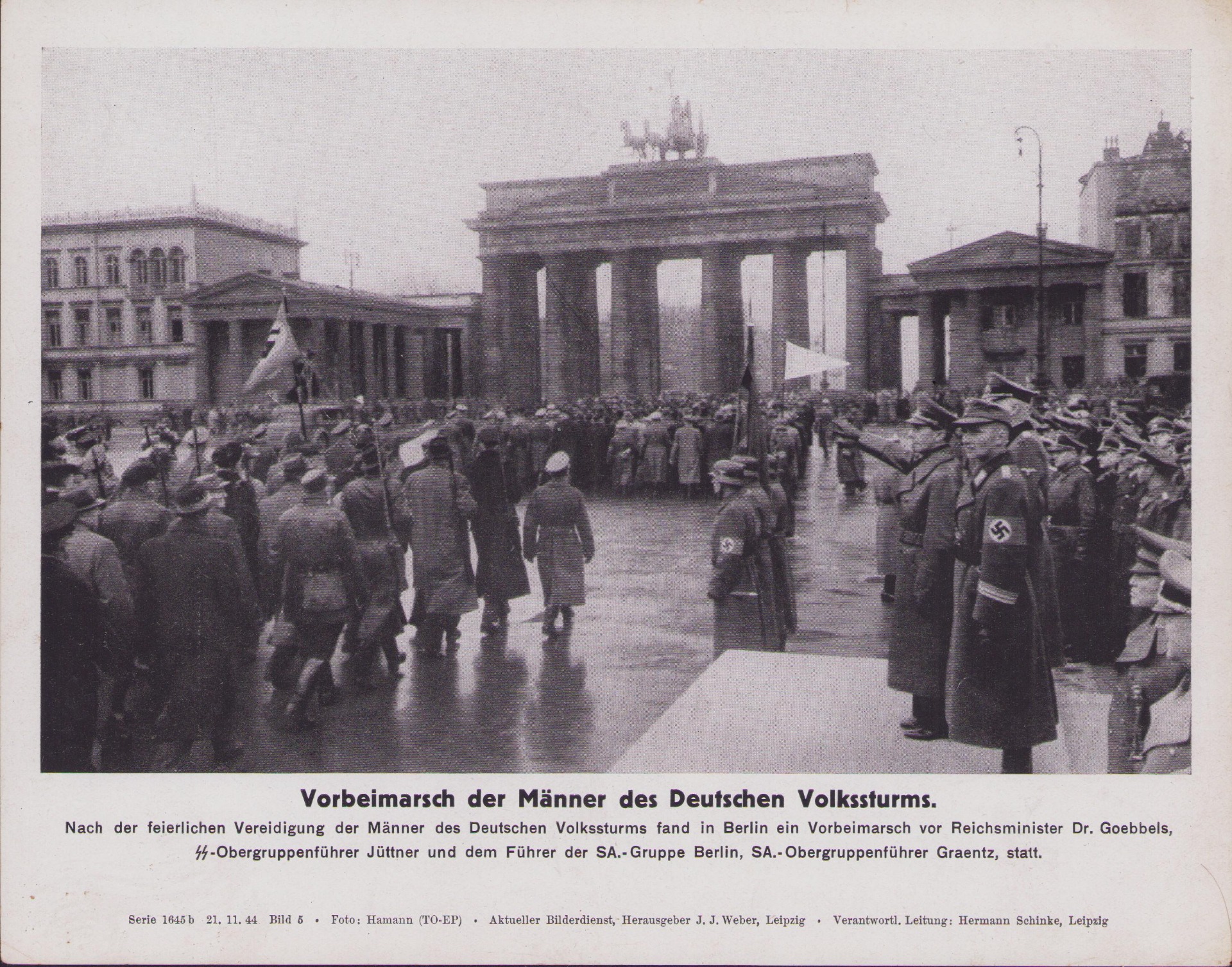 The photo shows overall normal signs of storage wear. The Volkssturm men marching past Dr.Goebbels, SS.-Gruppenführer Jüttner and the SA-Obergruppenführer Graentz after they took the oath.