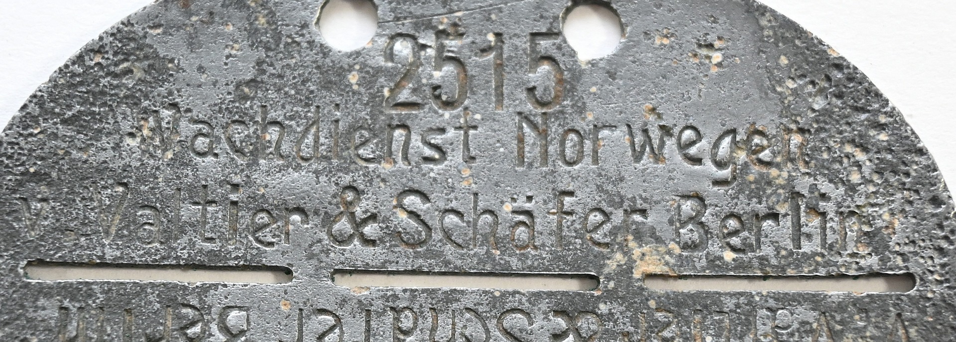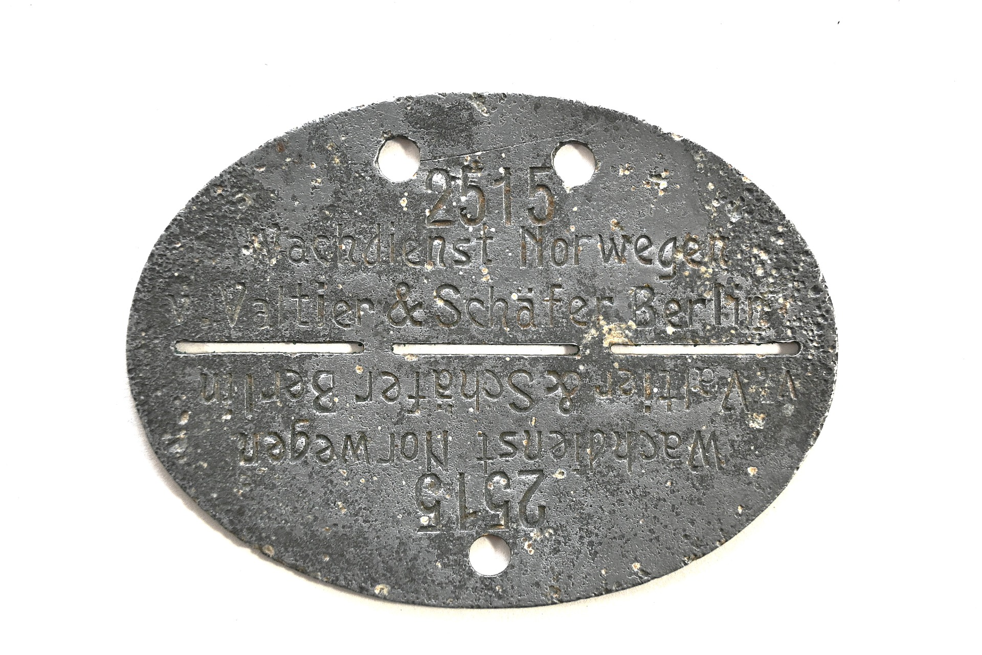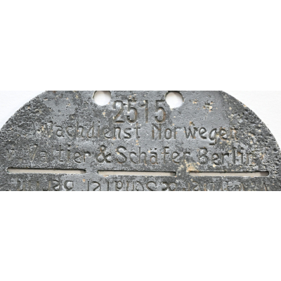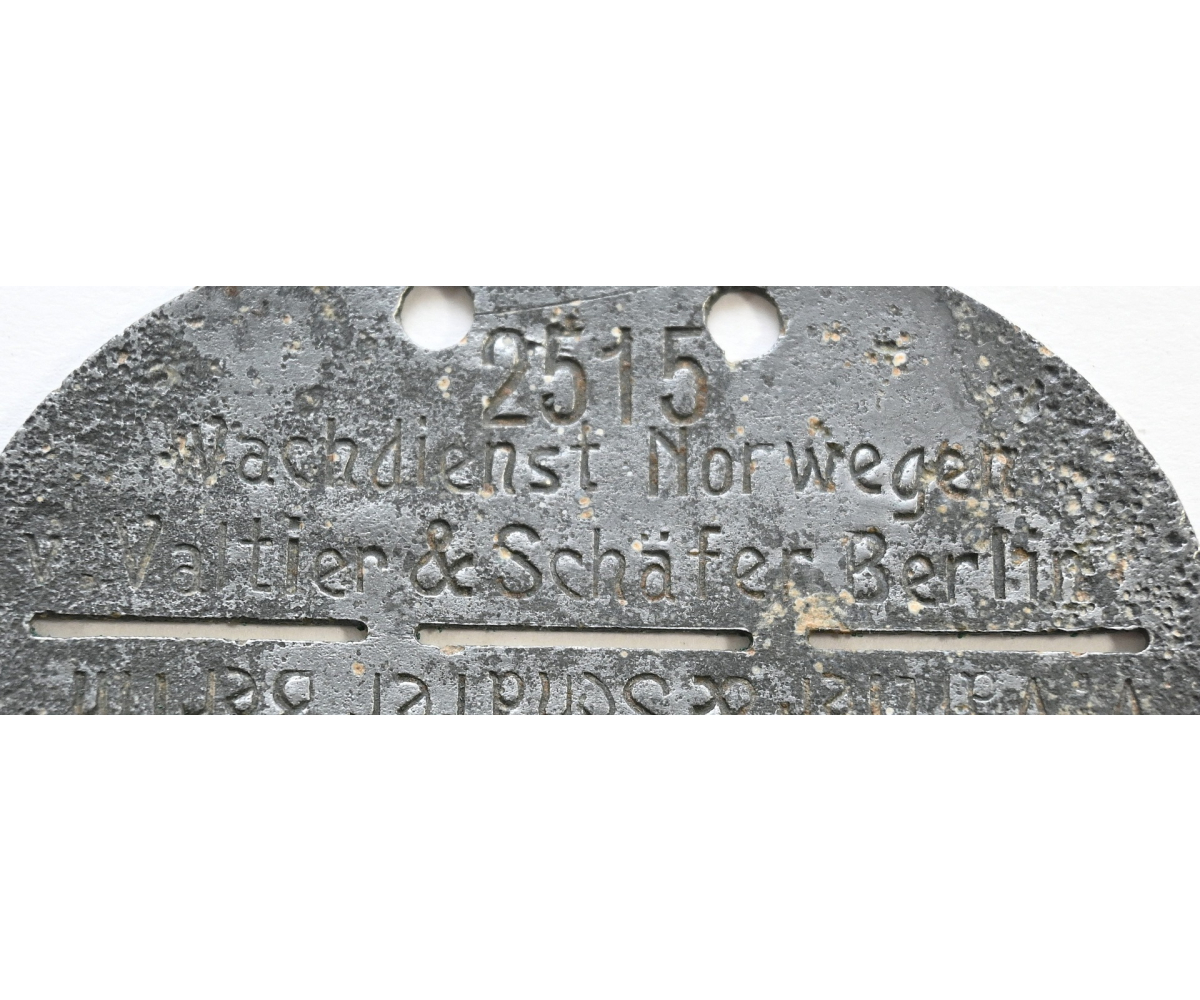 The tag or 'Erkennungsmarke' shows overall signs of wear. It belonged to a soldier who served in the Wachdienst Norwegen which was a (special) security/guard unit and guarded the Valtier & Schäfer from Berlin that also had a factory in Norway.