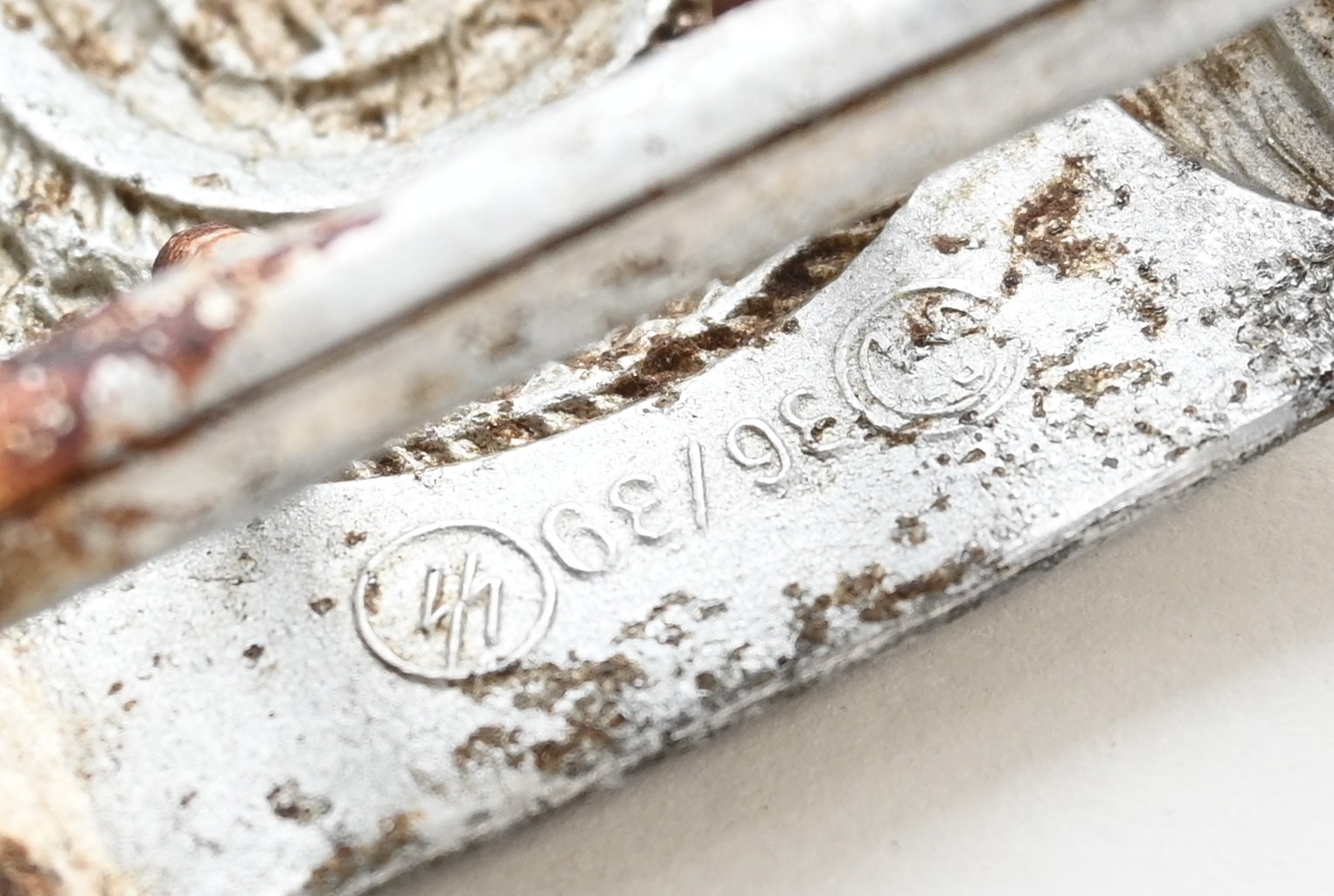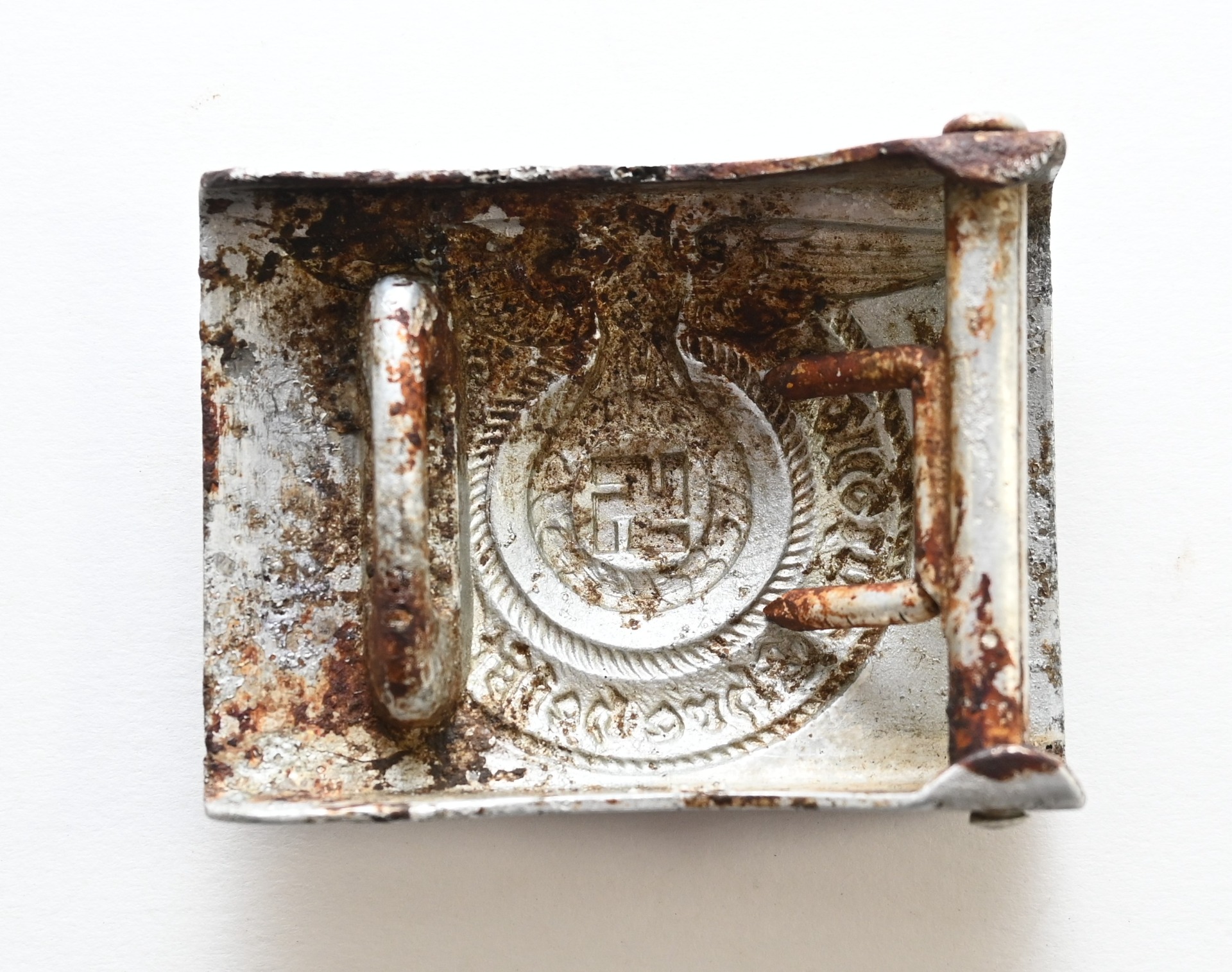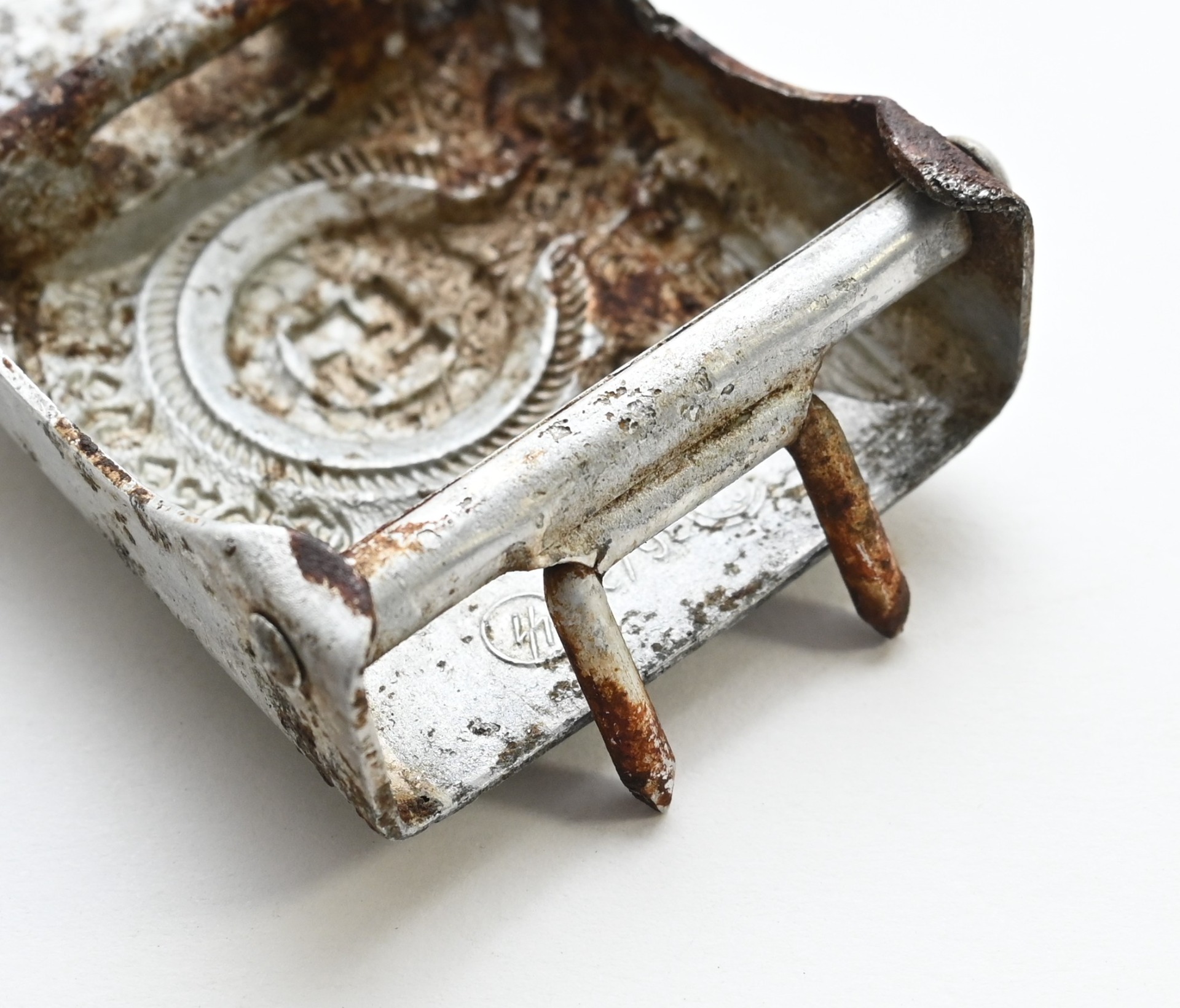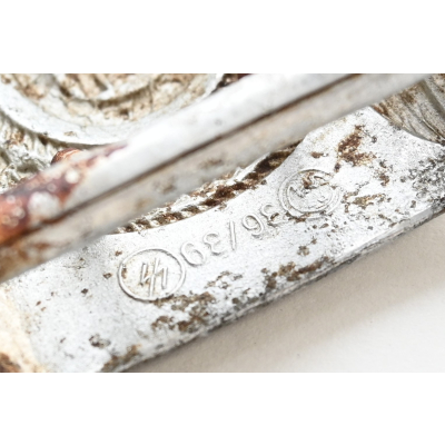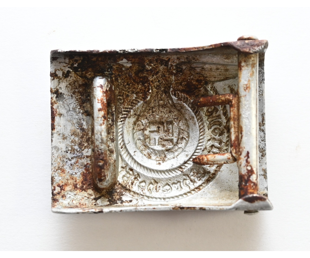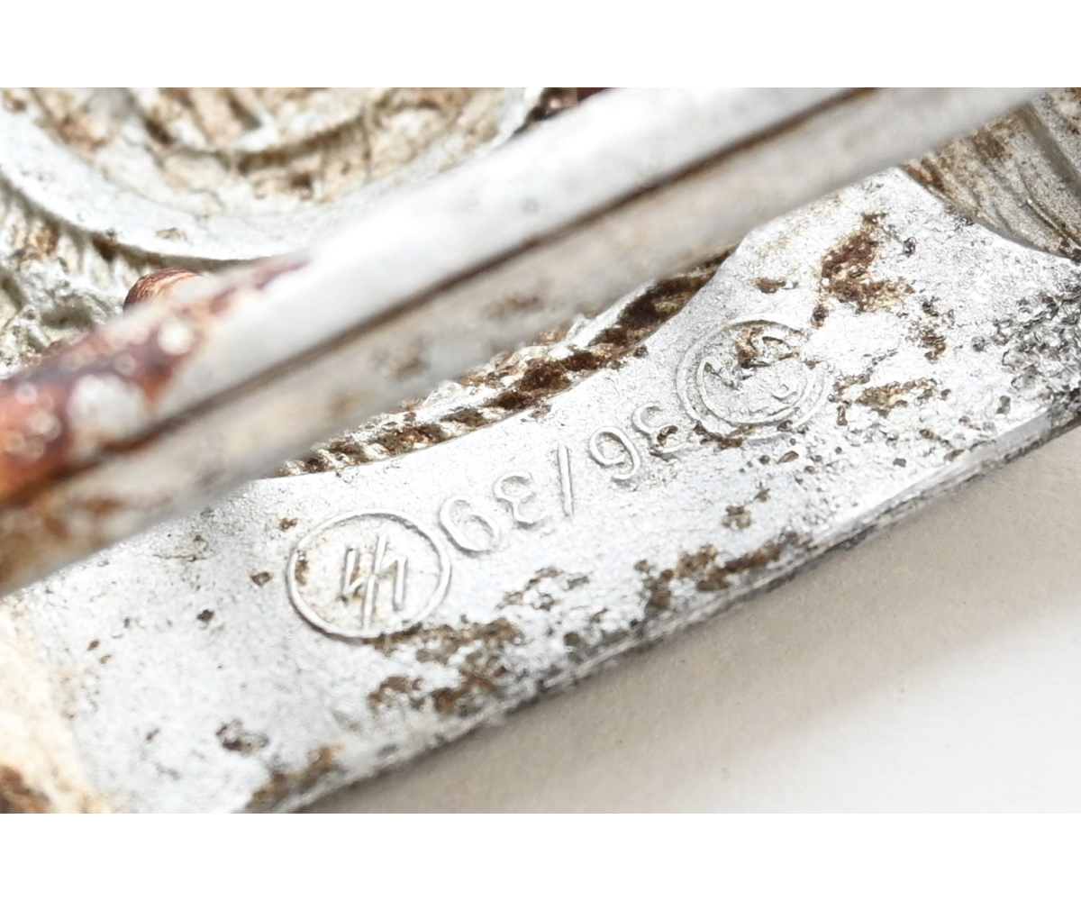 The buckle is a rock solid ground find, but pretty well preserved. Marked on the back with 'RZM 36/39 ᛋᛋ' meaning the maker was 'Overhoff.