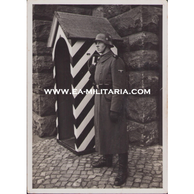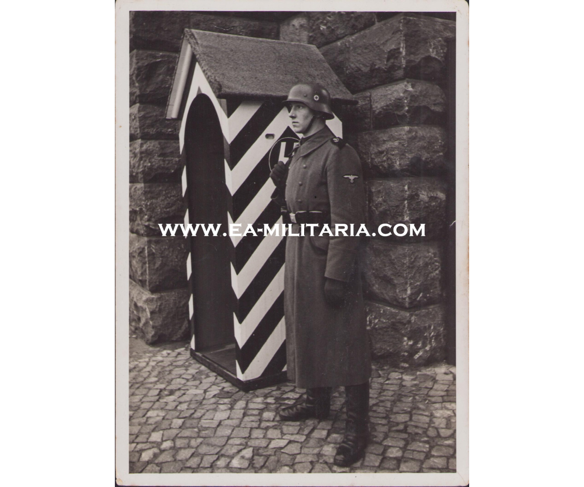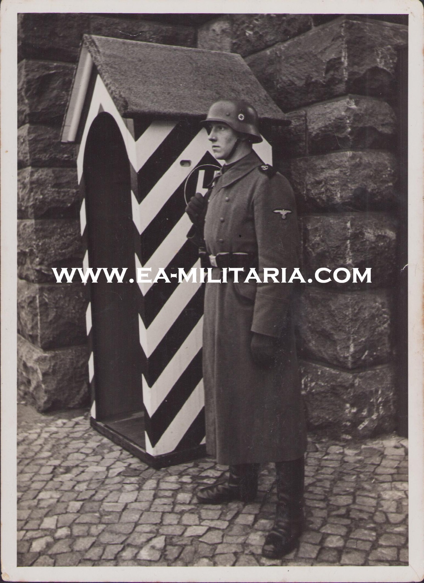 The photograph shows overall normal signs of storage wear. It shows a Waffen-ss soldier standing guard next to a SS marked guardhouse in front of a large building.