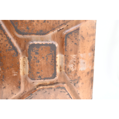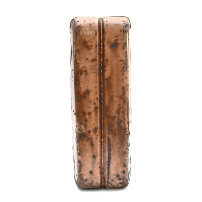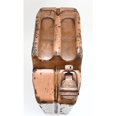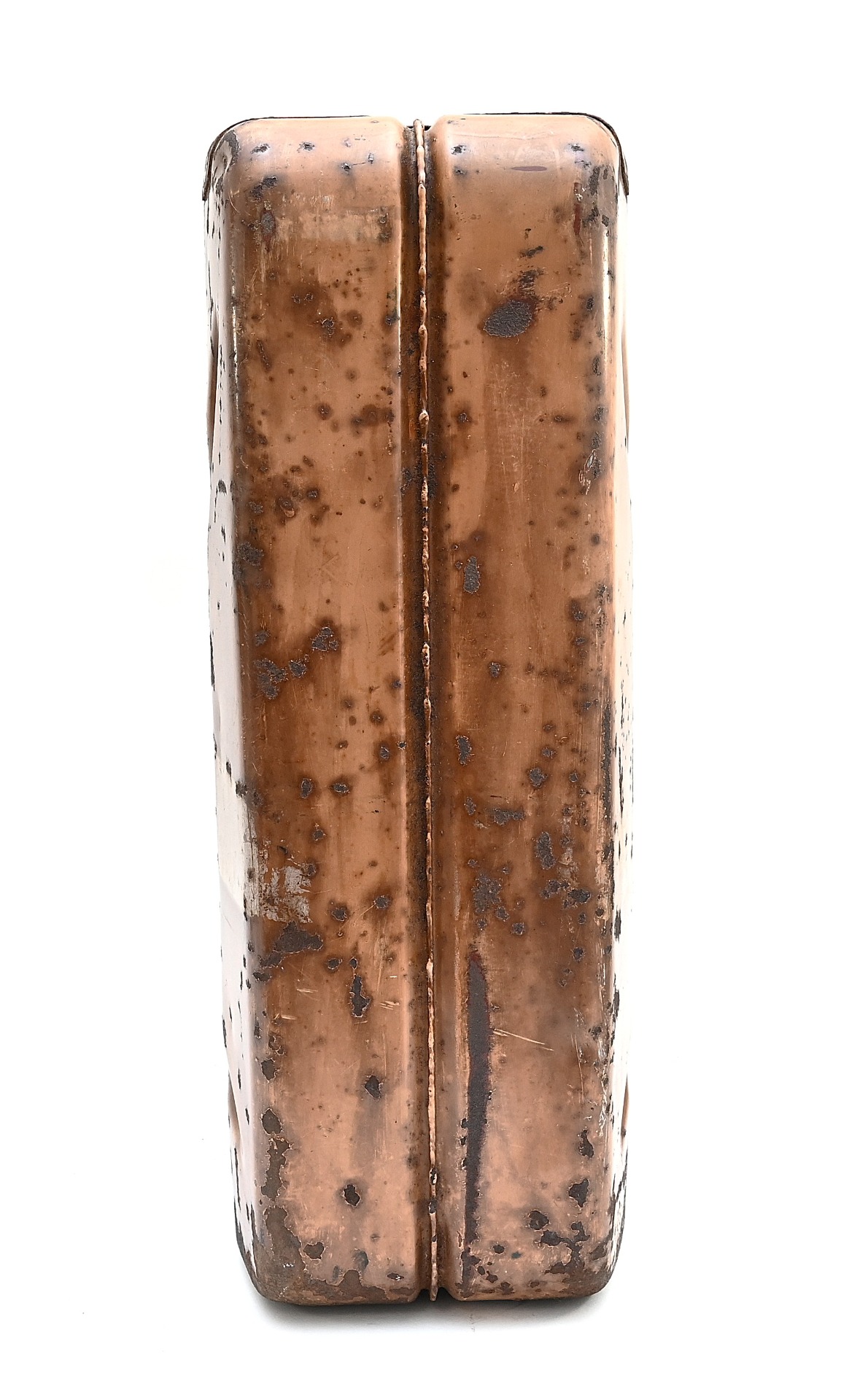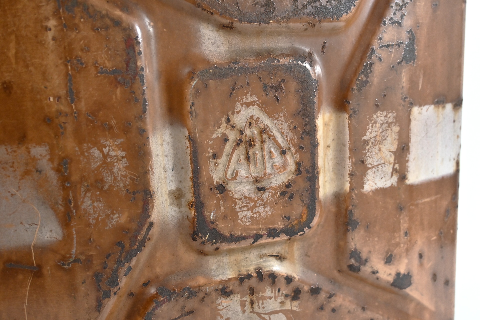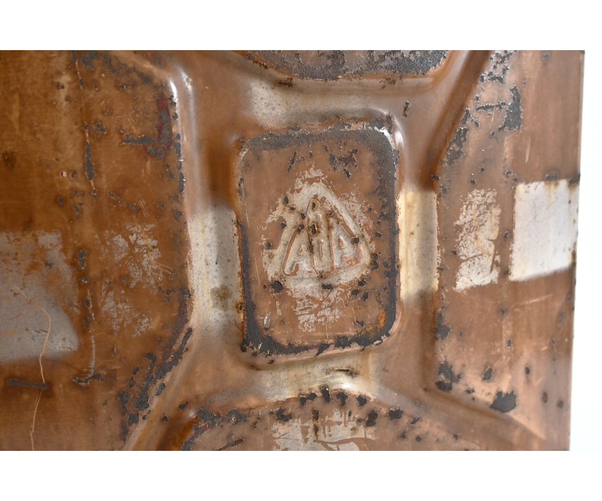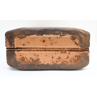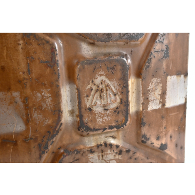 The jerrycan shows overall normal signs of wear. 2 Tiny holes in the bottom. Around 80% of its original tan color is still present. Both white stripes on each side are also visible indicating it was for water use. The 'W' on top is also present. It's dated 1943.